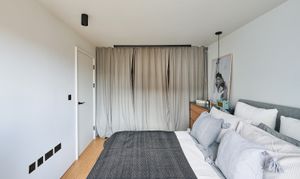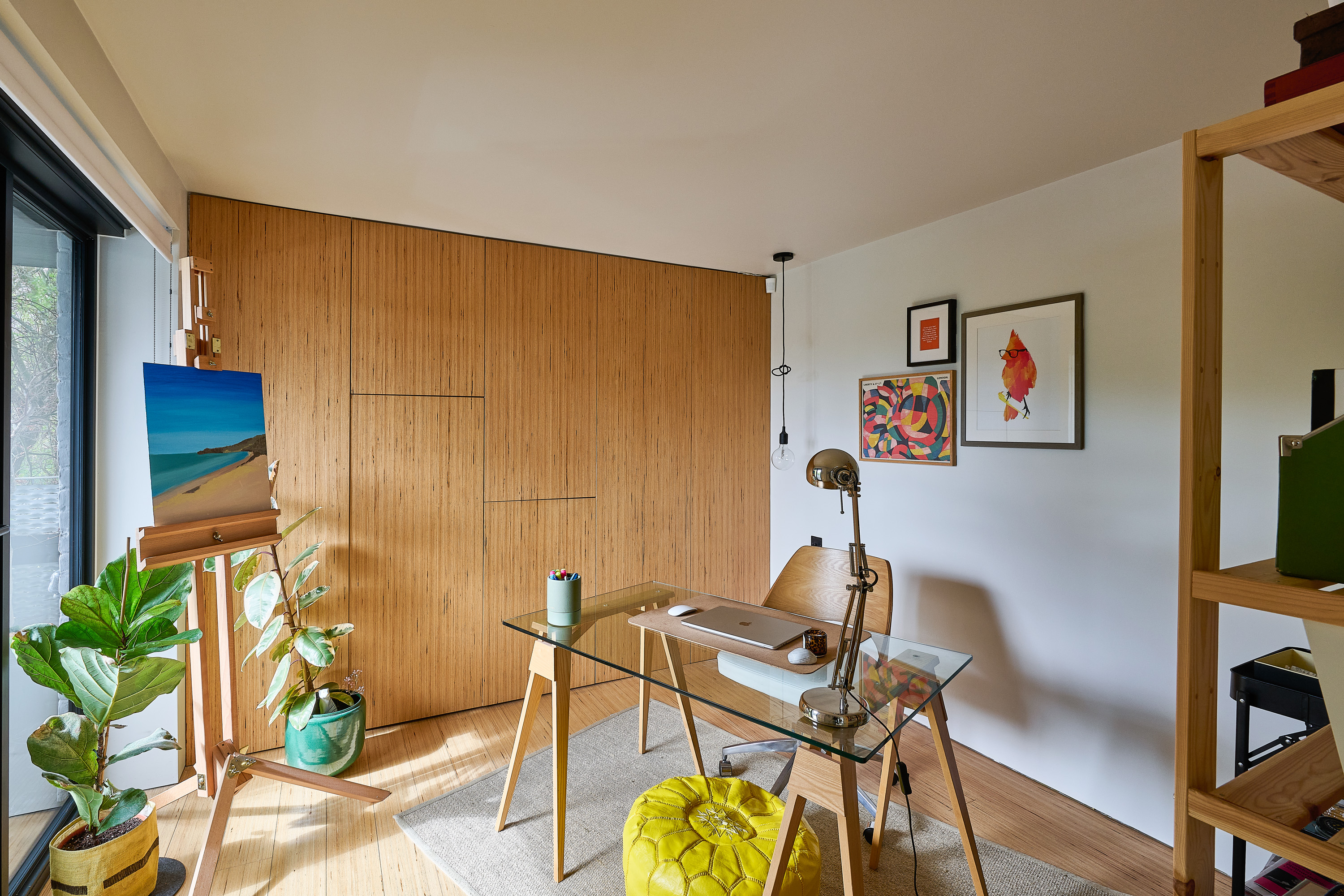 Inside, things feel light: floor-to-ceiling windows pull in generous daylight and frame views over the park and the fishing lake, giving the whole place an easy calm. There’s a small balcony for morning coffee or evening pottering, and a sliding partition allows the main living space to be opened up or closed off to form the second bedroom.