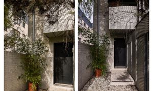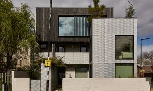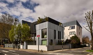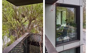 The development consists of an original brick building from the 1950's flanked by two modern extensions; an aluminium mesh-clad two-storey element to the front corner and a charred timber-clad unit on top.
