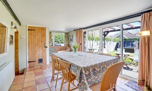 The entrance hall with brick weave floor leads into the cosy snug with original timber beams, stripped wood floors and an Inglenook fireplace and stairs to two of the four first-floor bedrooms. The comfortable sitting room is well proportioned, with original Inglenook fireplace with log burning stove, stairs to the two further bedrooms. The well-equipped kitchen is fitted with a comprehensive range of oak wall and base units, ceramic sink units, space for range cooker (available by separate negotiation) and ceramic tiled floor with access to the generous dining room. Enjoying views into the garden, the dining room includes patio doors, a continuation of the ceramic tiled floor, a built-in pantry and a separate utility room which includes the boiler and space for washing machine and tumble dryer. The rear lobby includes a built-in cupboard and access to both the modernised ground floor WC and an attractive bathroom with a traditional style suite, including a vanity unit with granite worksurface and Victorian style heated towel rail.