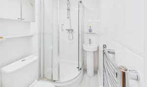 Part-tiled, the en-suite to bedroom 2 offers a shower enclosure, WC, sink, heated towel rail and neutral decor.