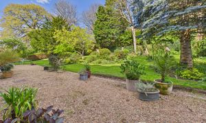 The property offers a shingle seating area, ideal for outdoor furniture and a quiet spot to relax, with direct access onto the beautifully maintained communal gardens. These grounds are a real standout feature, with a generous lawn framed by mature shrubs, creating a peaceful and established setting to enjoy.