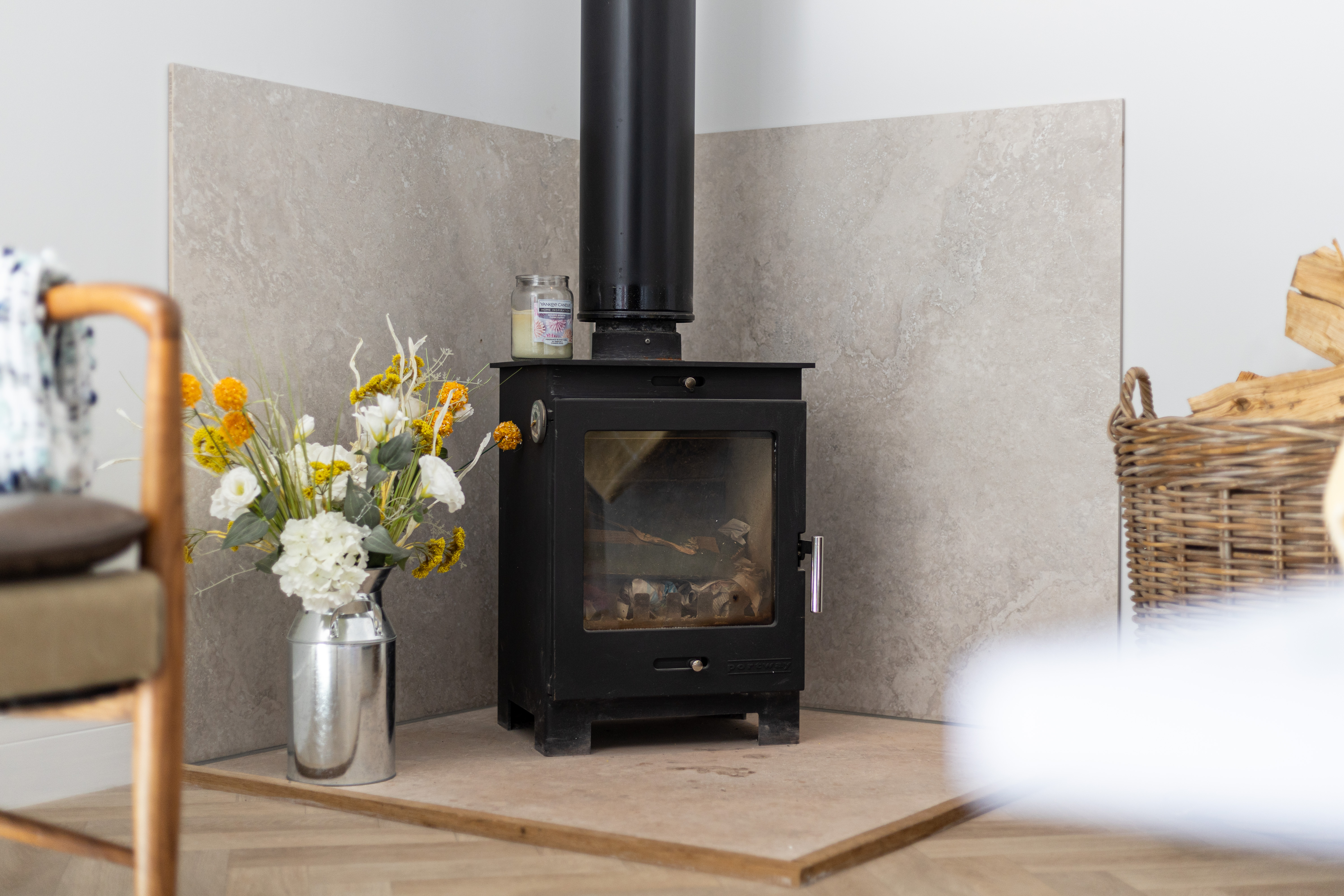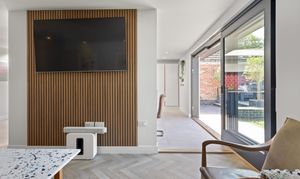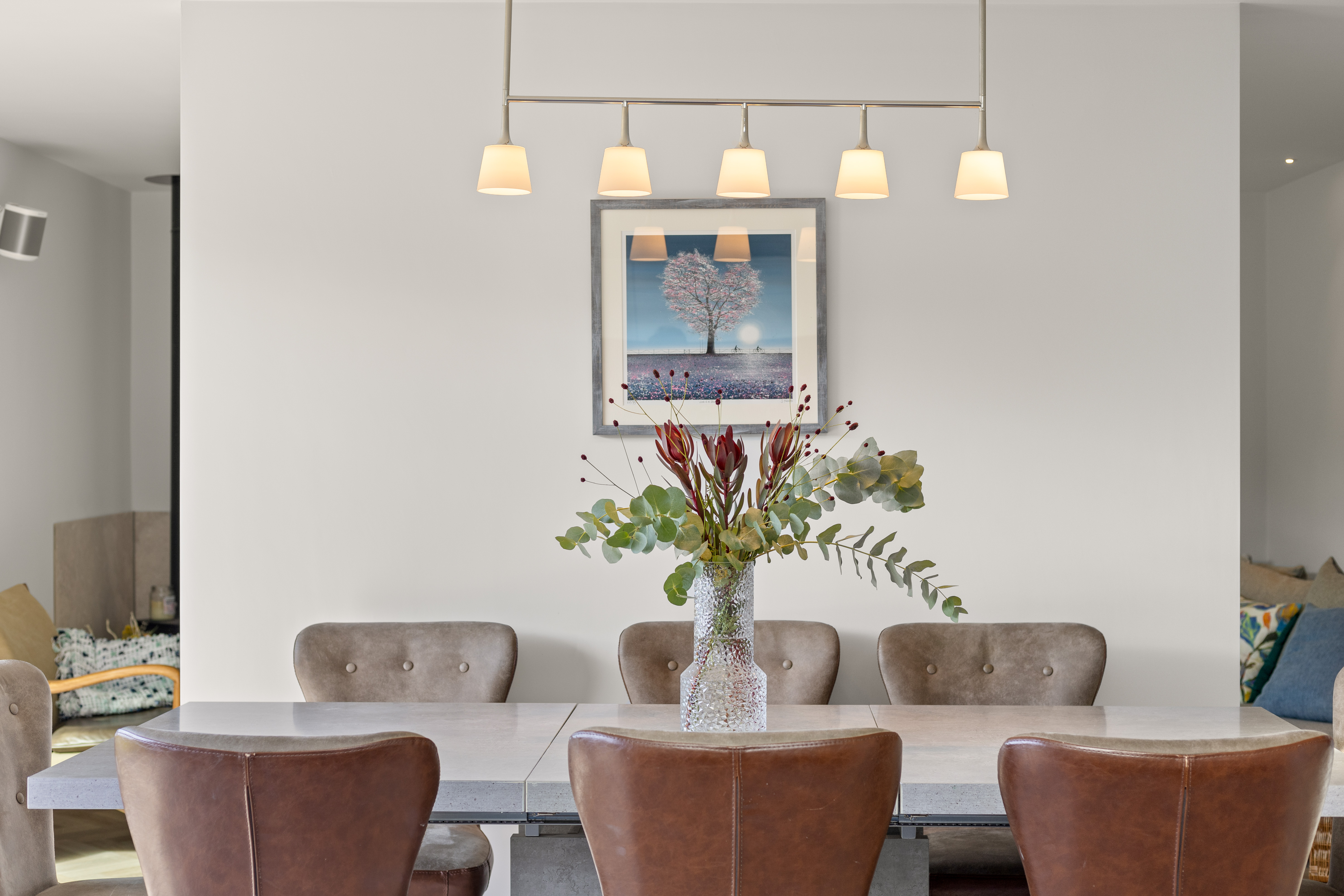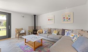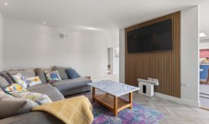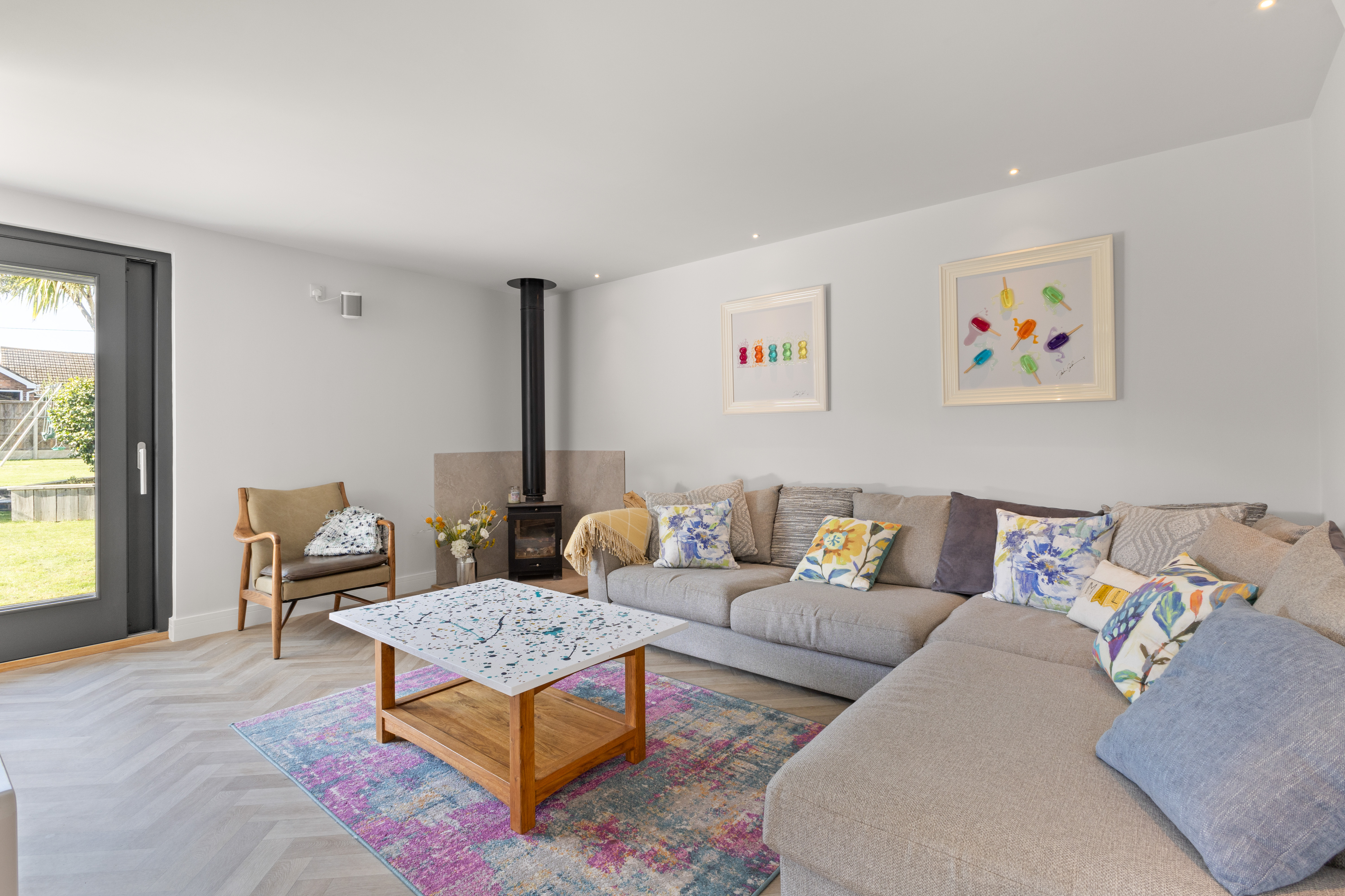 A wonderful sociable room flowing directly from and partially open to the kitchen/diner with Herringbone style flooring, inset ceiling downlighters, woodburner sat on a tiled base and with tiled surround and media wall with feature panelling.