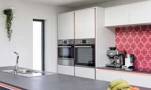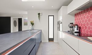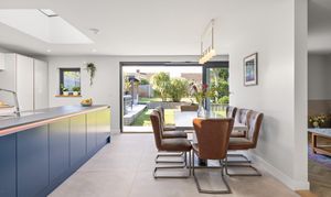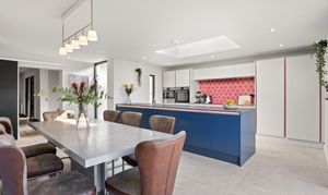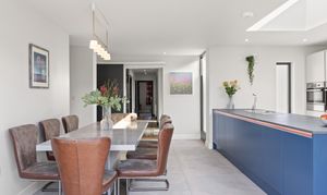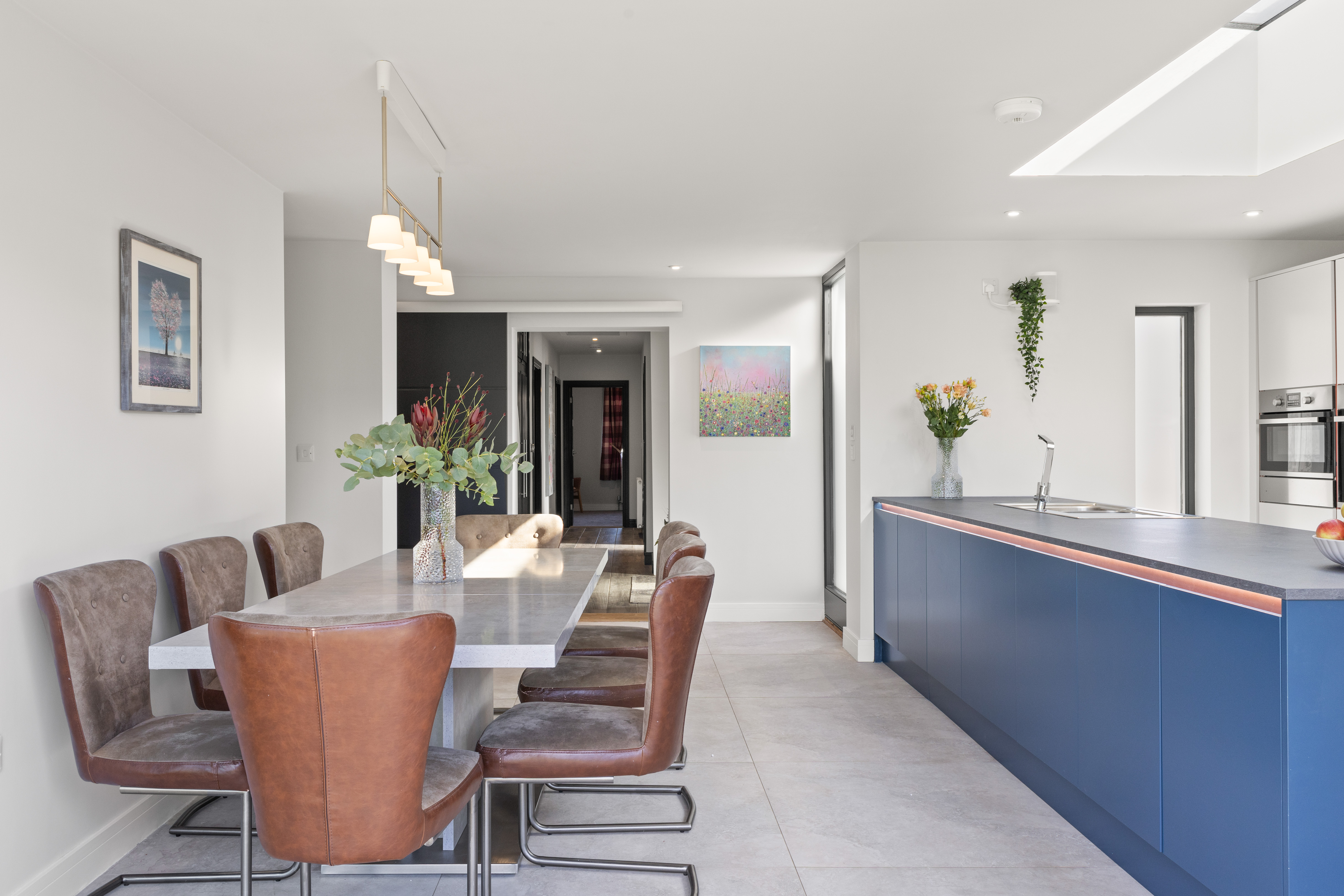 A wonderful, bright and airy open-plan room with an extensive range of bespoke fitted base and wall mounted kitchen units and drawers with work surfaces over, inset five-ring induction hob with extractor over, tiled splashbacks, built-in mid-height electric oven, built-in mid-height microwave, integrated full height fridge, integrated full height freezer, large kitchen island consisting of base kitchen units and drawers with work surfaces over, inset one and a half bowl stainless steel sink with mixer tap over and side drainer, integrated dishwasher, space for dining table and chairs, tiled flooring, inset ceiling downlighters, lantern rooflight, bespoke hardwood timber casement double glazed windows to the front, rear and side aspect, two openings to the living room and bespoke hardwood double glazed sliding doors to the rear garden.
