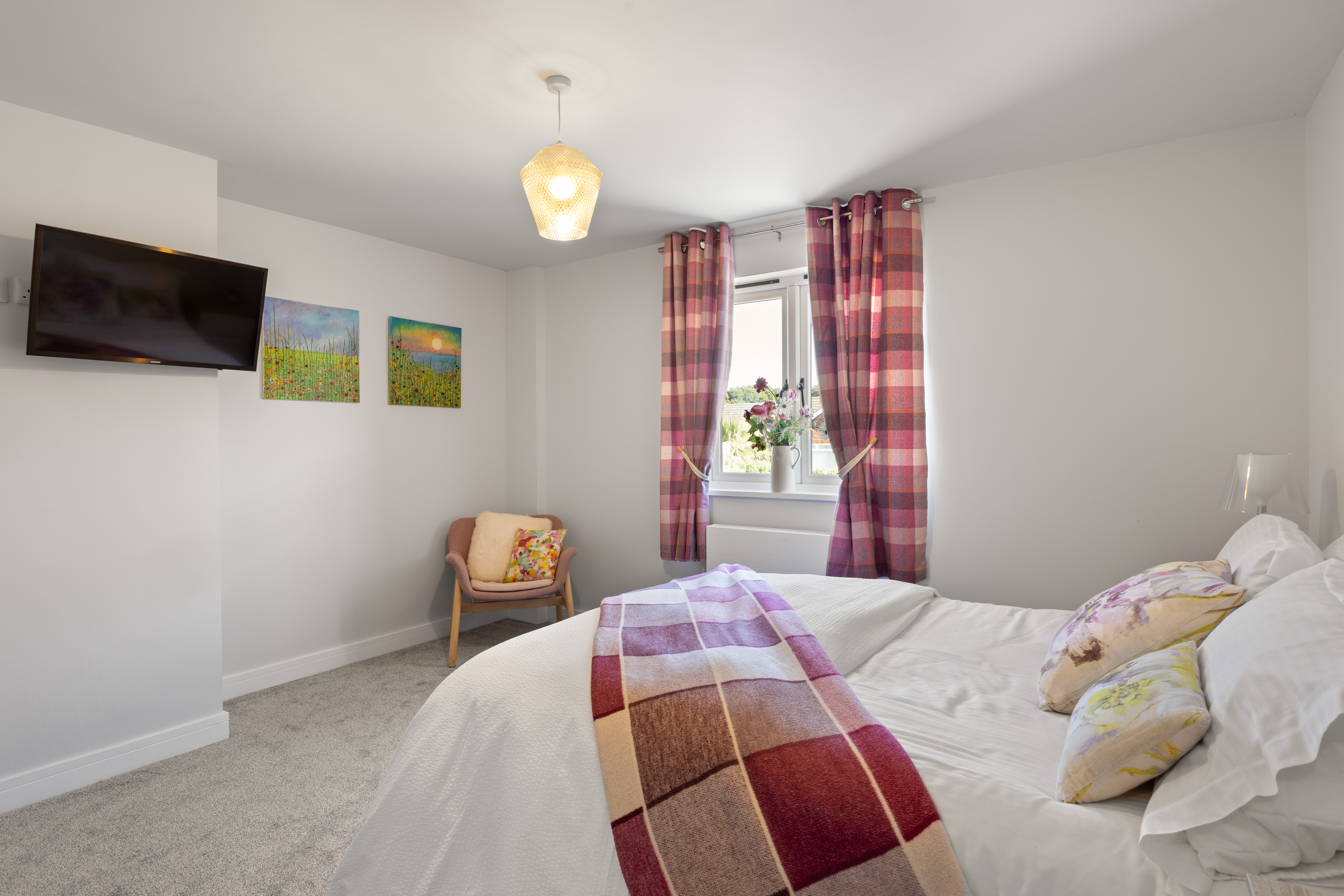 Bespoke hardwood timber casement double glazed windows to the front and side aspect, carpeted flooring, wall mounted radiator, opening to the walk-in wardrobe with carpeted flooring, wall mounted radiator, inset ceiling downlighters, fitted shelving and hanging rails. Door to the en-suite shower room.
