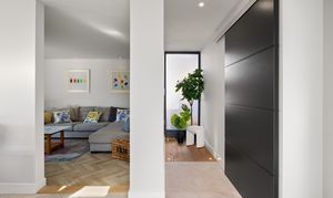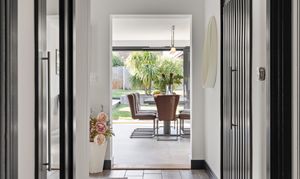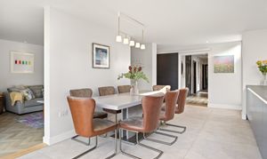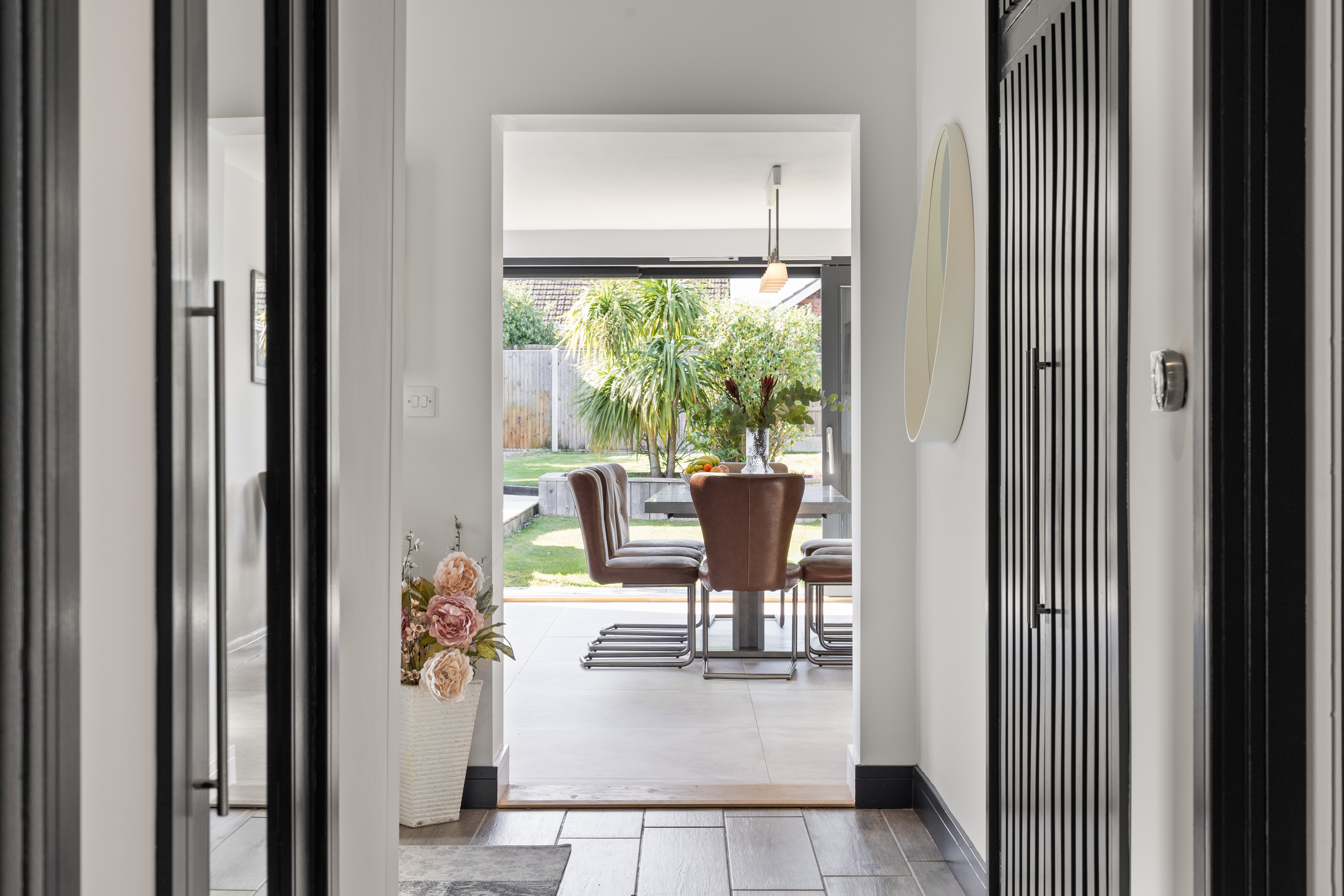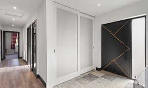 Bespoke hardwood entrance door to the side aspect with side light window, tiled flooring, loft access hatch, inset ceiling downlighters, built-in storage cupboards, wall mounted vertical radiator and further wall mounted radiator, sliding door to the Kitchen/Diner, doors to the bathroom, bedrooms 1, 2 and 3.