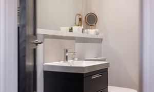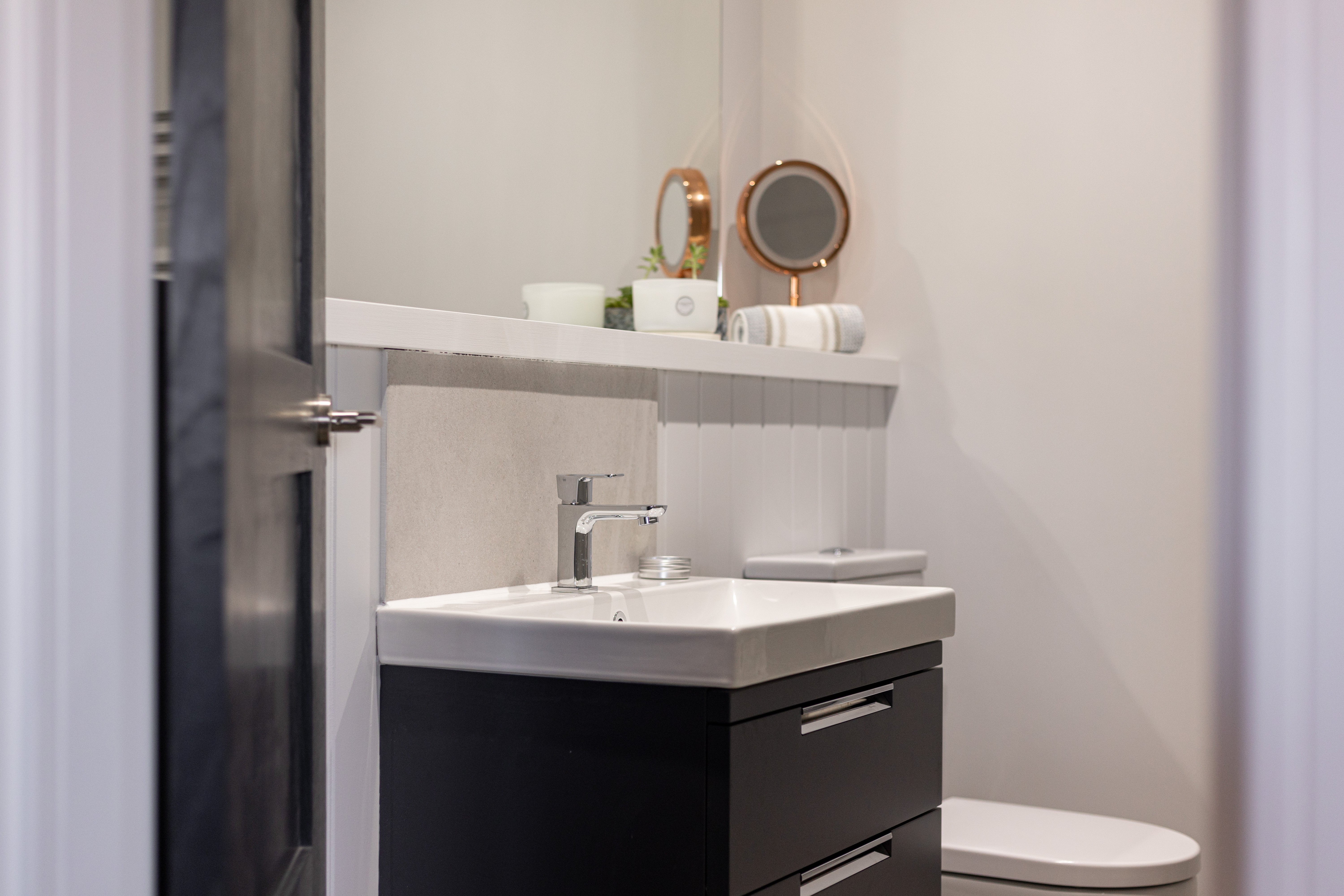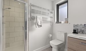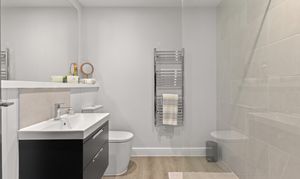 Wood effect flooring, wall mounted heated towel rail, inset ceiling downlighters, part tiled walls extractor fan, wall mounted mirror, dual flush WC, vanity wash hand basin with mixer tap over and drawers below and walk-in shower enclosure with tiled surround.