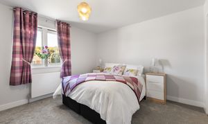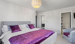 Bespoke hardwood timber casement double glazed window to the front aspect, carpeted flooring, wall mounted radiator, walk-in wardrobe with carpeted flooring, inset ceiling downlighters and fitted shelving.