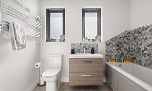 Two bespoke hardwood timber casement obscure double glazed windows to the side aspect, tiled flooring, wall mounted heated towel rail, inset ceiling downlighters, shower cubicle with shower mixer bar and tiled surround, vanity wash hand basin with mixer tap over and drawers below, dual flush WC and panel-sided bath with mixer tap over and tiled surround.