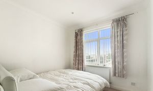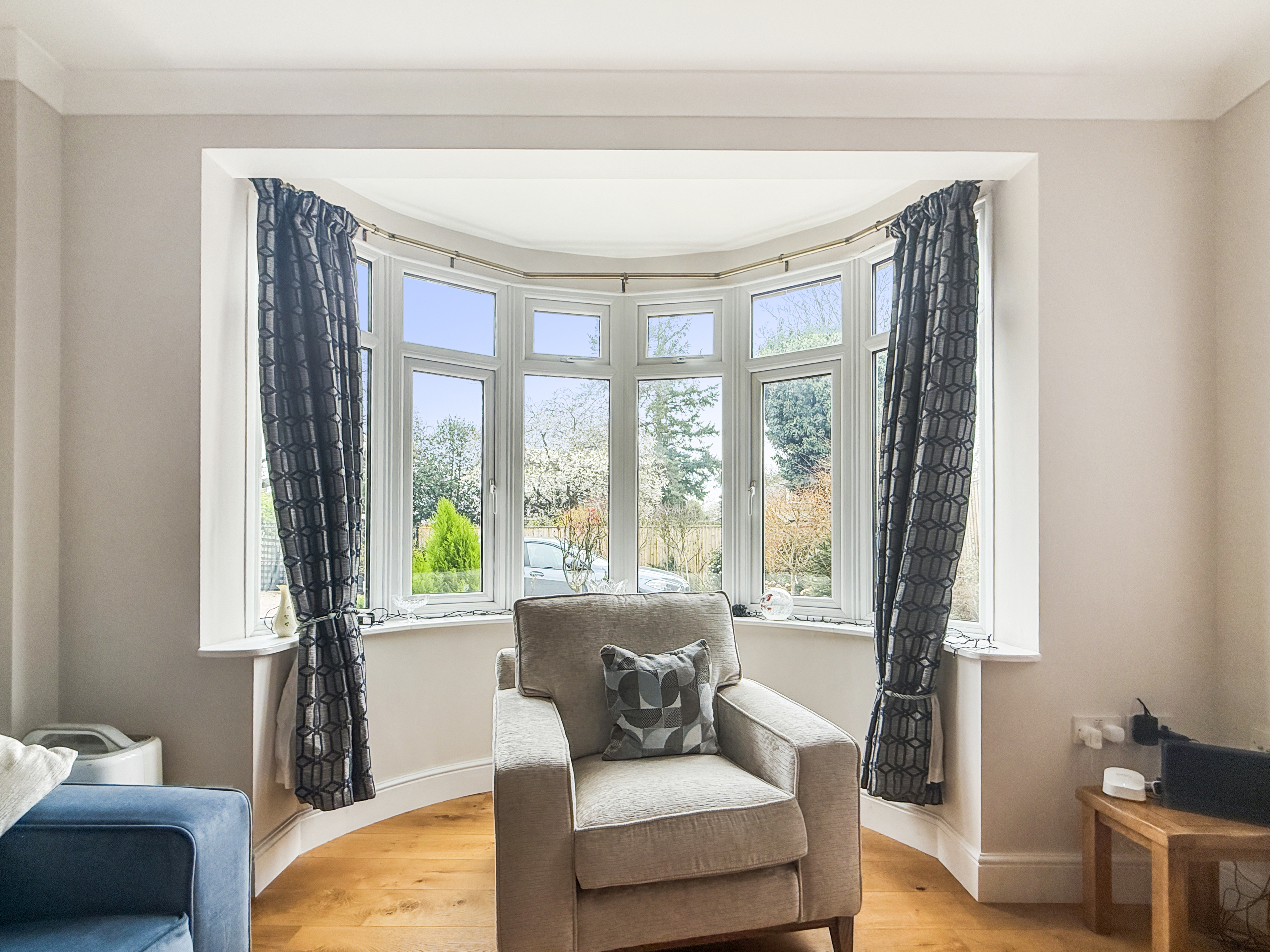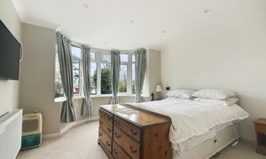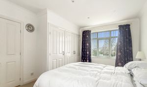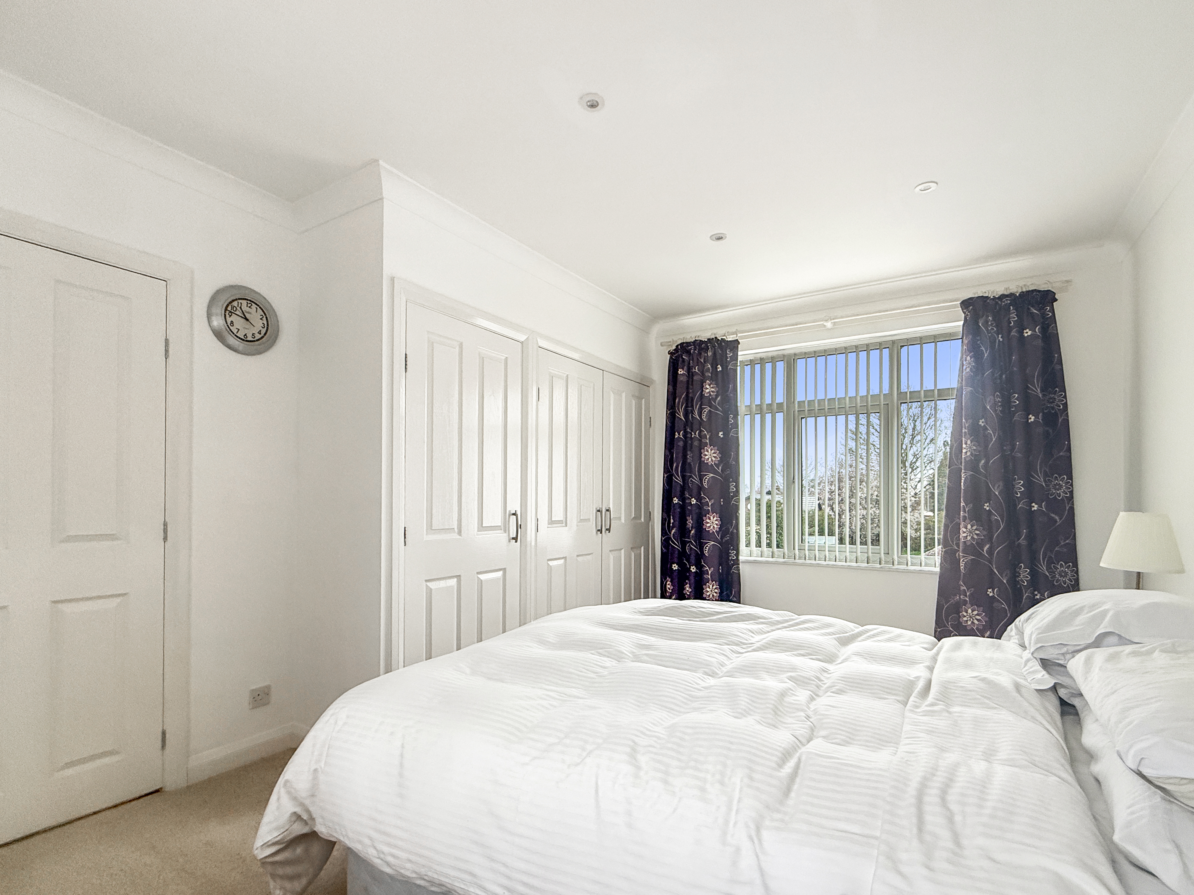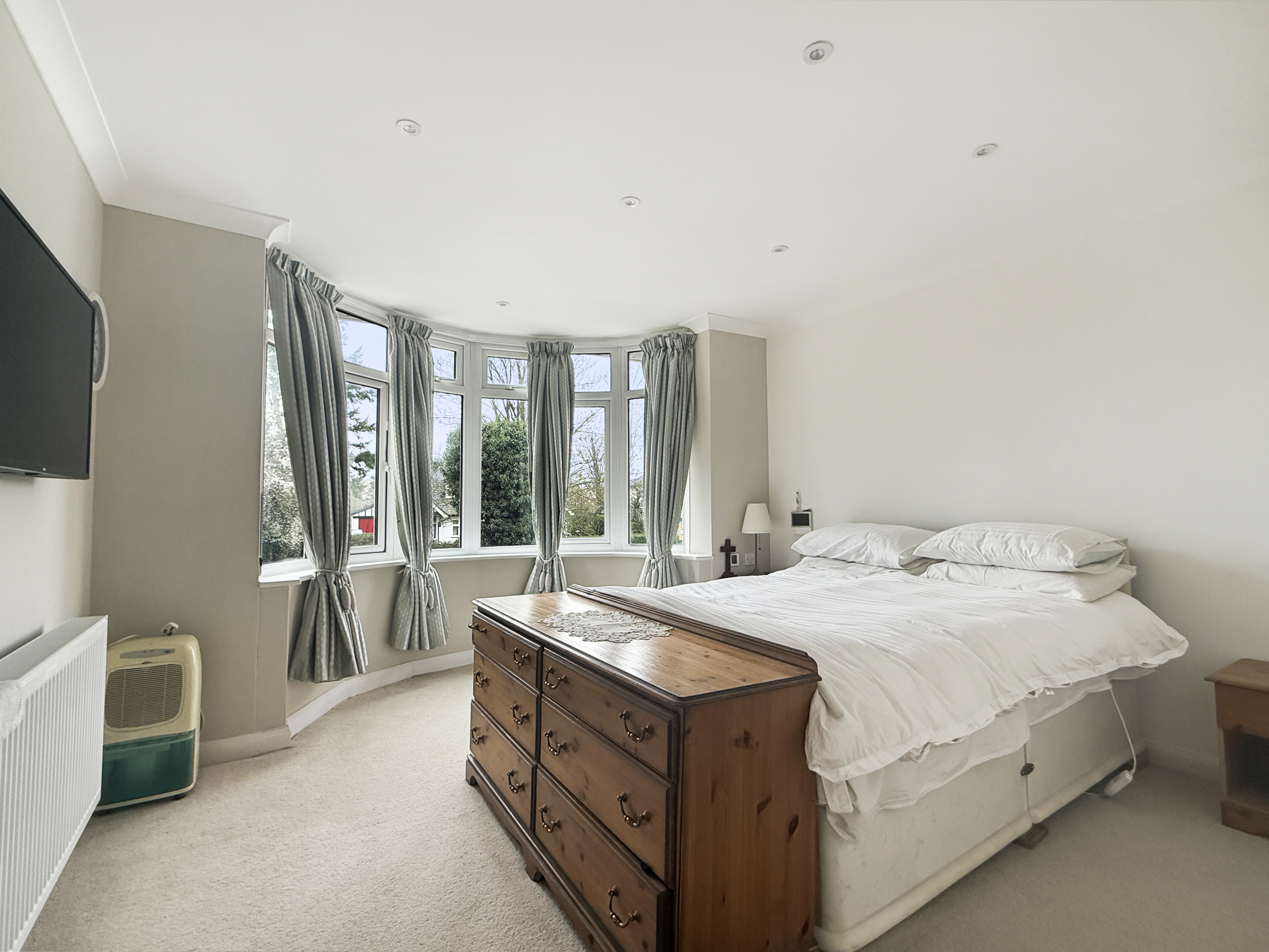 A large principal bedroom with a pretty bow window to the front and built-in wardrobes.