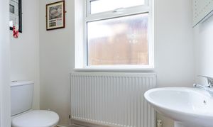 A stylish bathroom fitted with a four piece suite comprising panelled bath with mixer shower attachment, shower cubicle with independent shower over, close coupled WC and wash hand basin with vanity cupboards underneath. There is a heated towel rail, airing cupboard and an obscure window to the rear.
