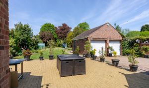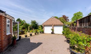 A double detached garage with twin up and over doors to the front, personal door to the side, power and lighting. The garage is alarmed.