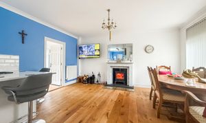 A lovely sociable room with a window to the front, open to the kitchen and French doors to the garden room. A fireplace with a marble surround and slate hearth has an inset log burner, perfect for cosy nights in. The measurements quoted are incorporating the kitchen.