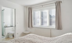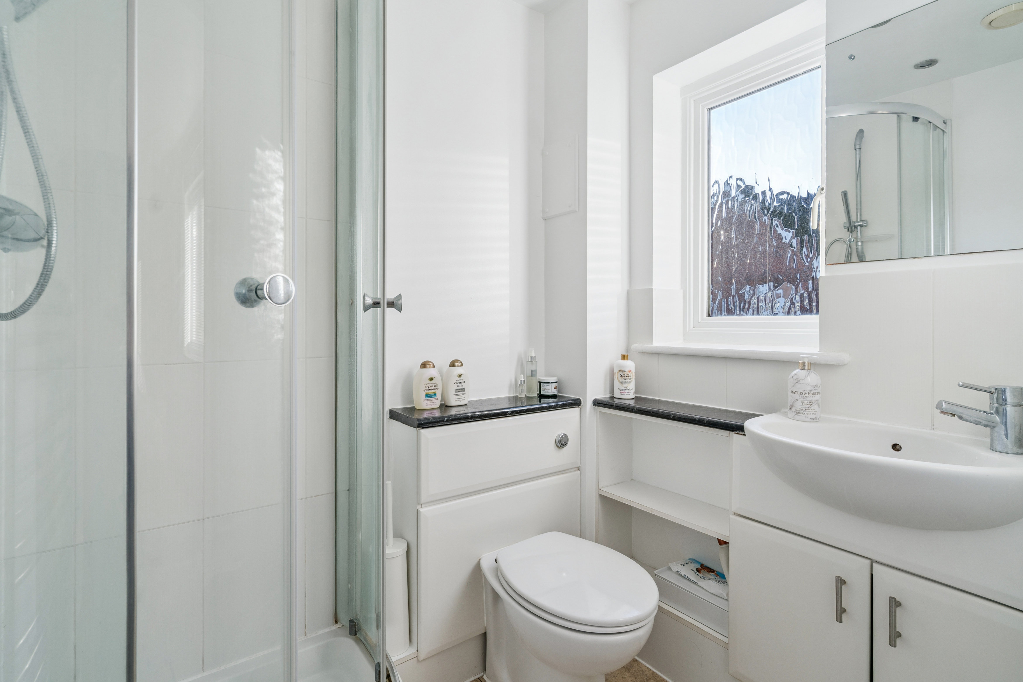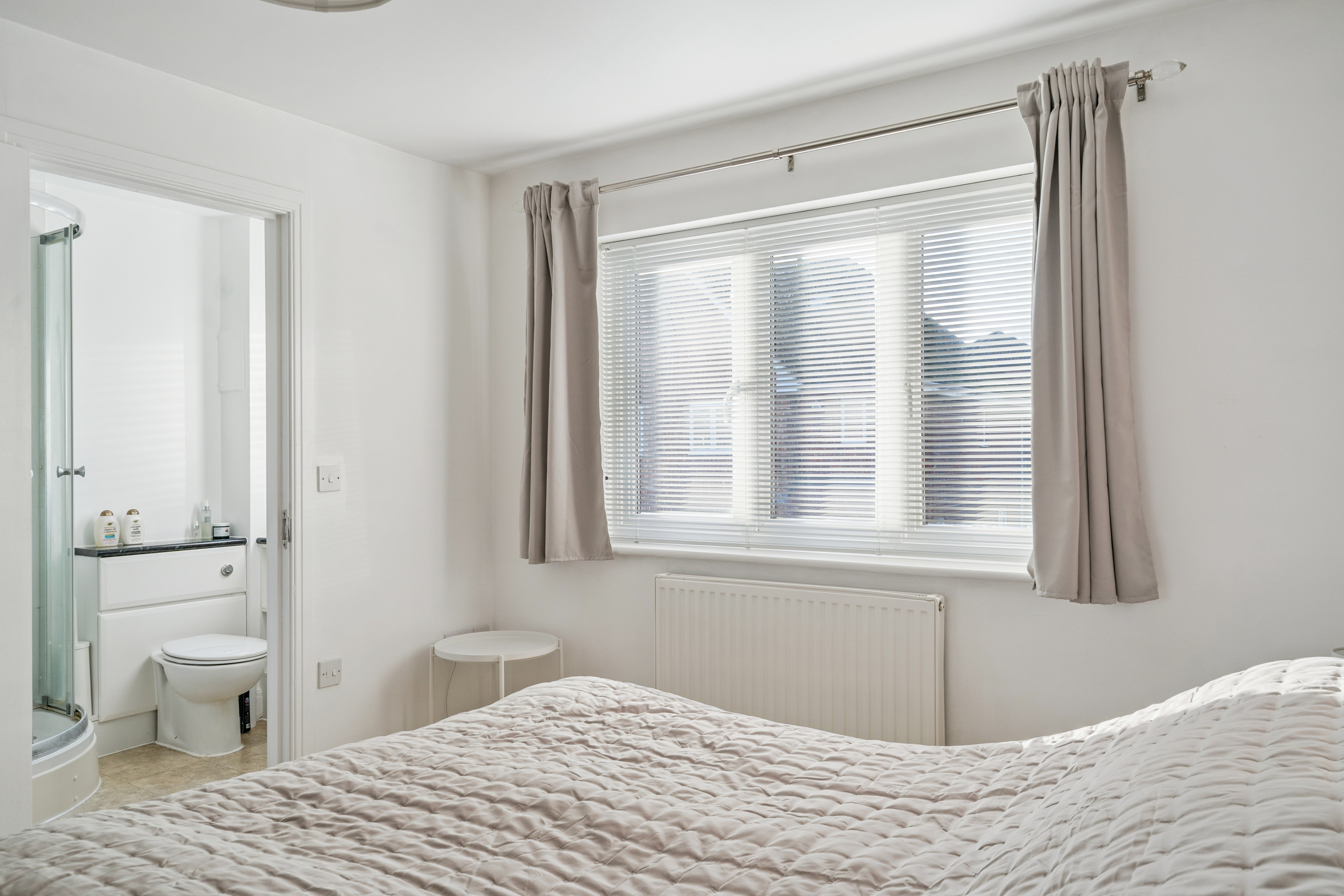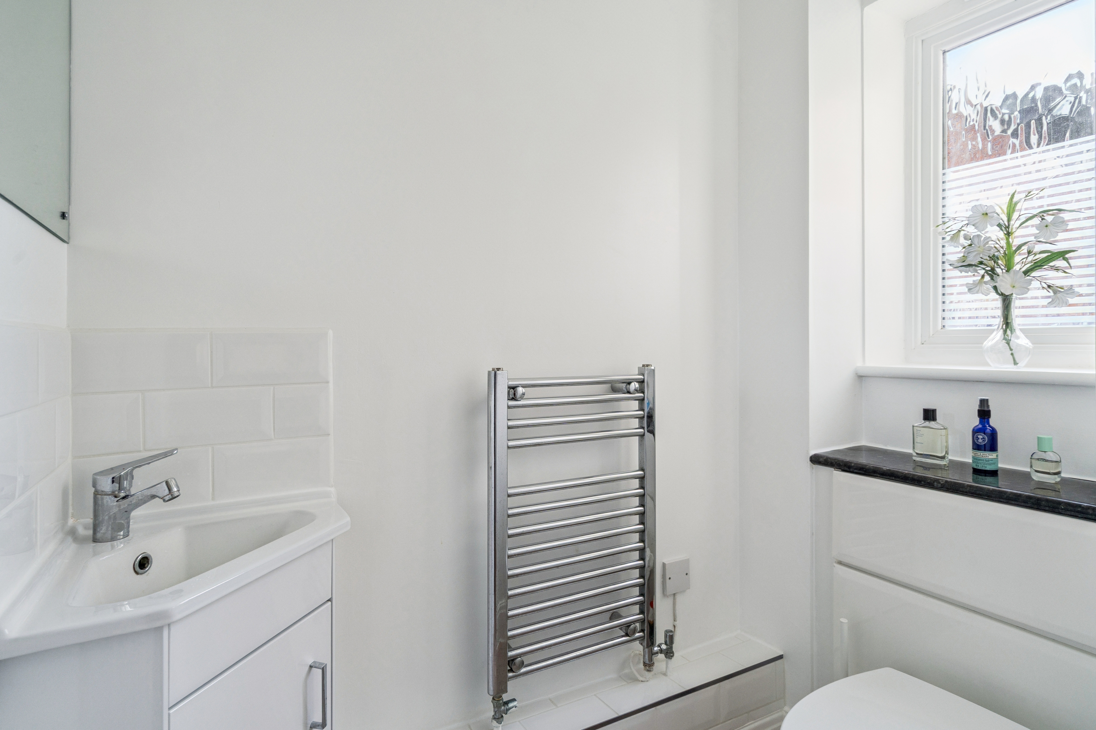 Stairs rise to a central landing giving access to all three bedrooms and the family bathroom. The principal bedroom is a well-proportioned room with integrated wardrobe space and an additional large storage cupboard. Its en-suite includes an enclosed shower, vanity unit with storage, WC and heated towel rail. The second bedroom is a comfortable double overlooking the rear garden and also benefits from integrated wardrobes. Bedroom three is a large single, ideal as a home office, nursery or dressing room, and is again positioned at the rear of the property.