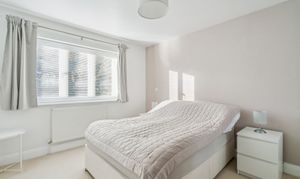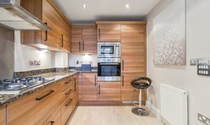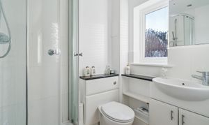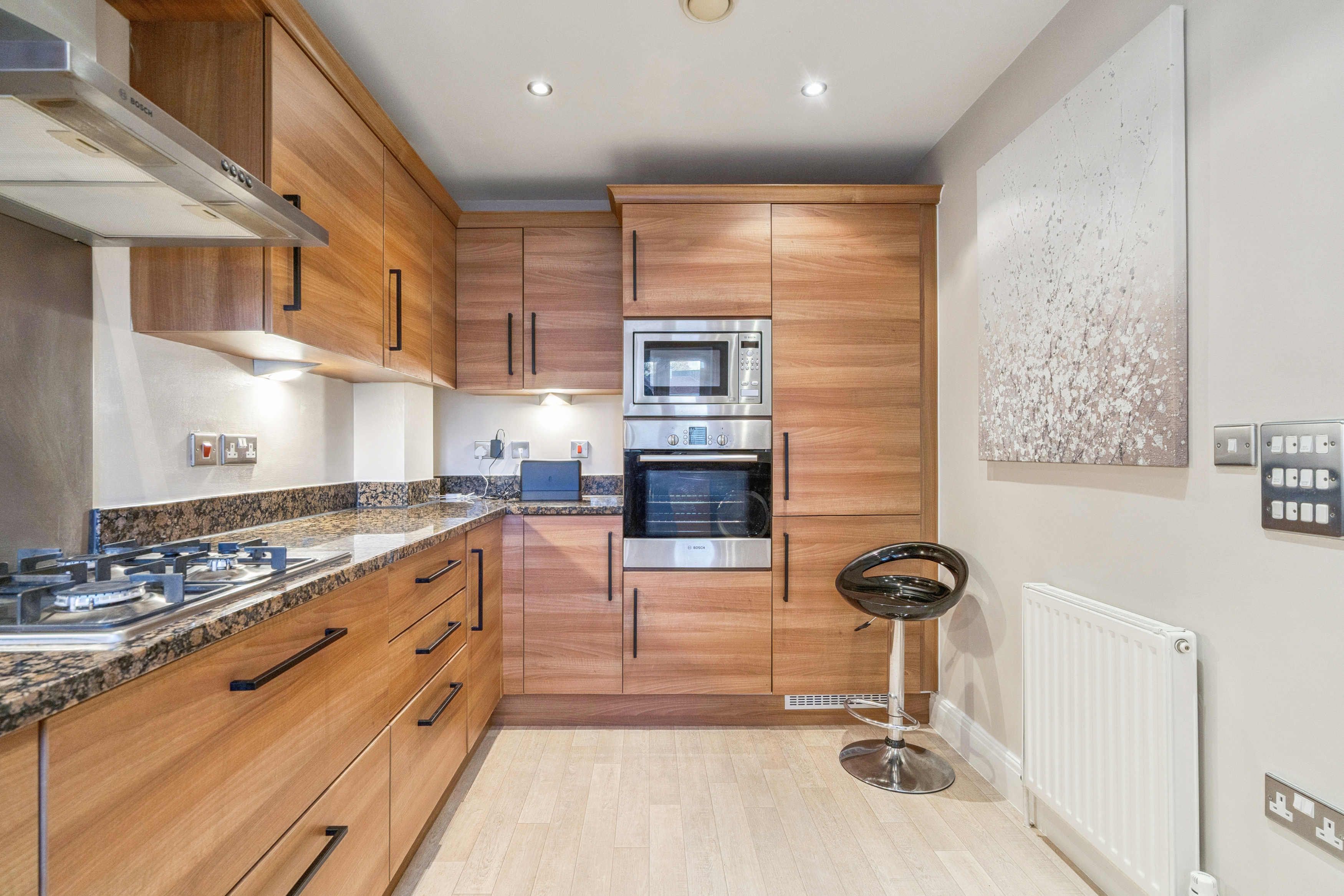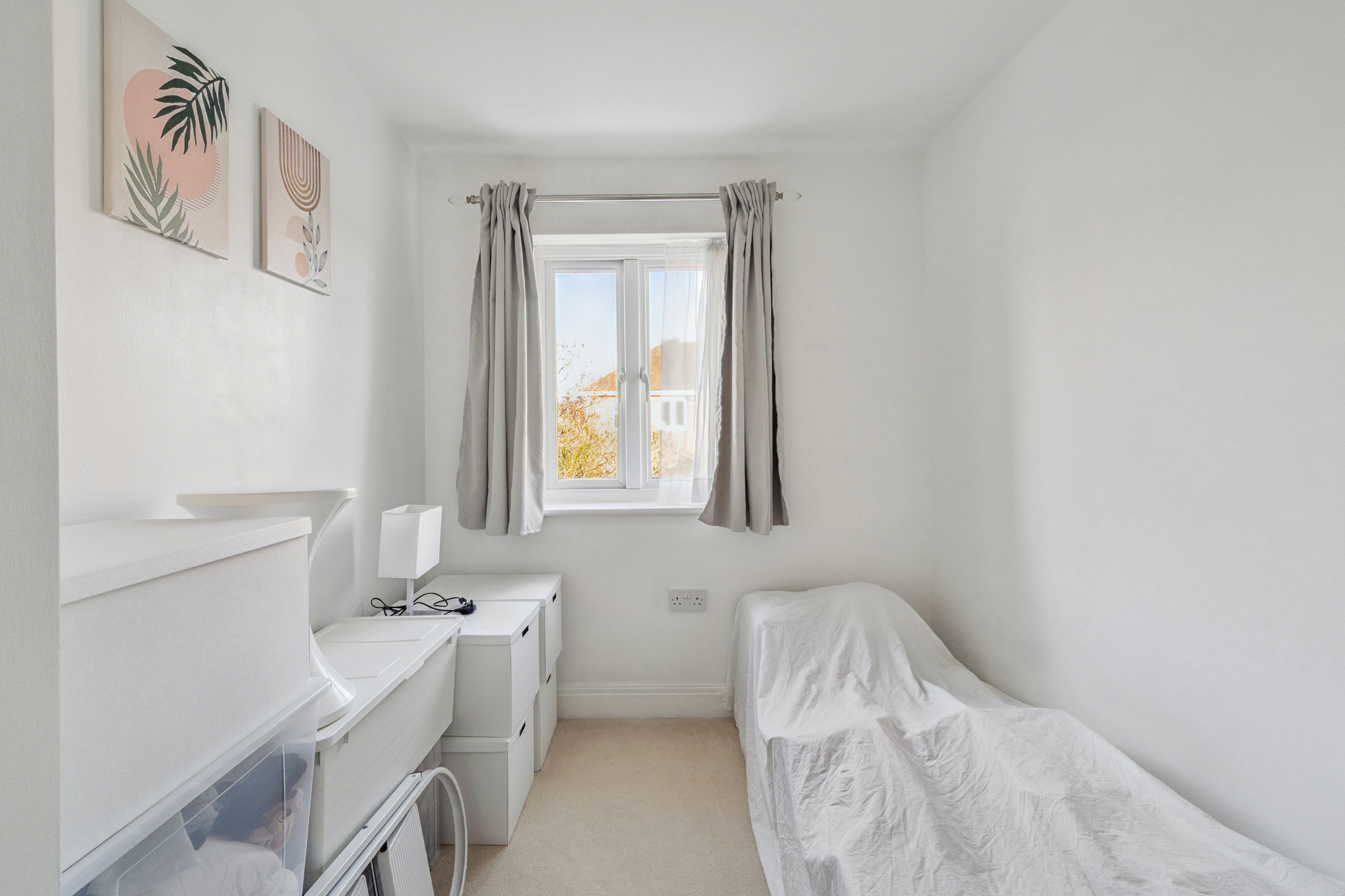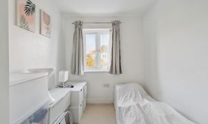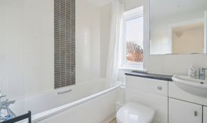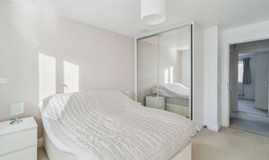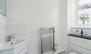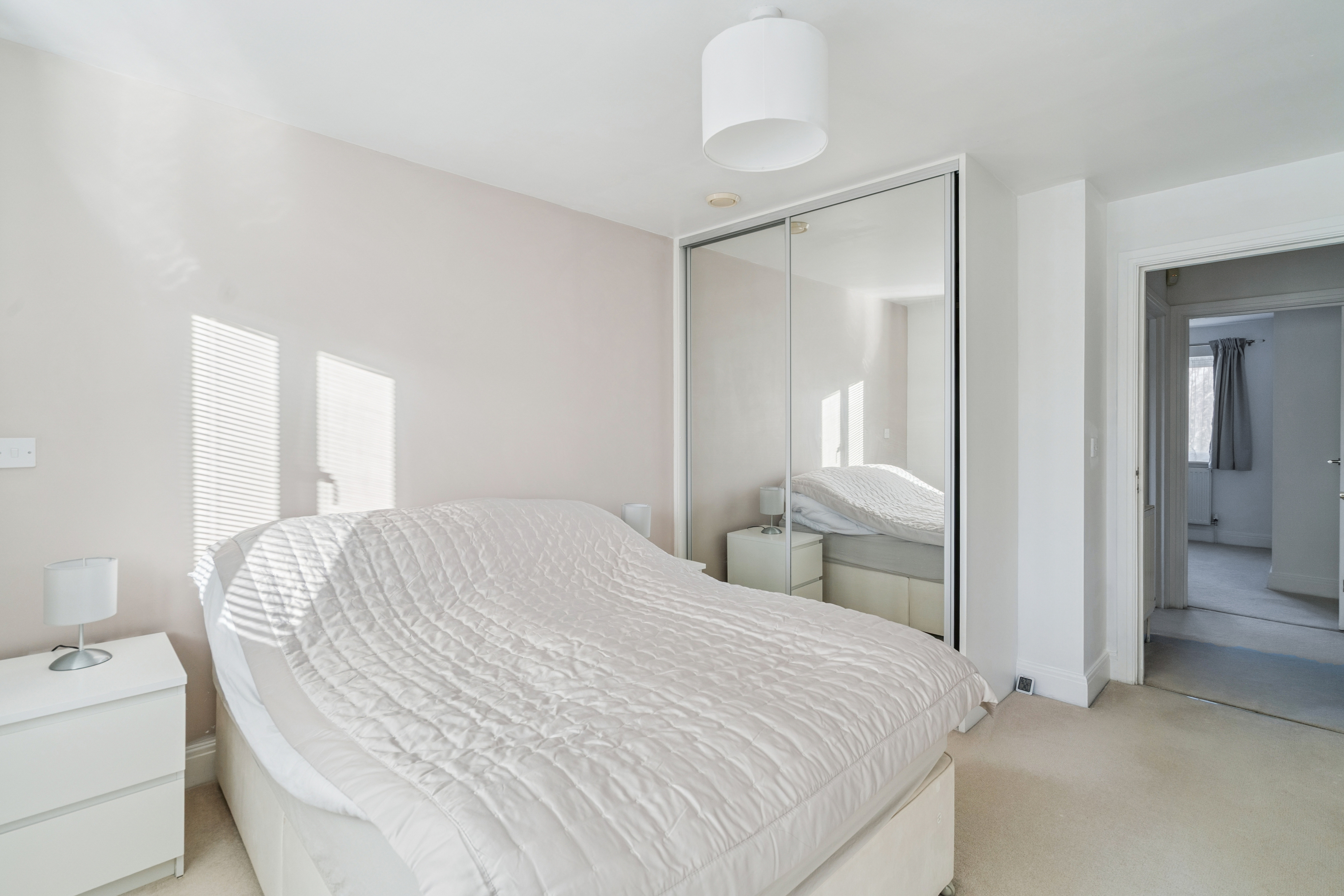 Stairs rise to a central landing giving access to all three bedrooms and the family bathroom. The principal bedroom is a well-proportioned room with integrated wardrobe space and an additional large storage cupboard. Its en-suite includes an enclosed shower, vanity unit with storage, WC and heated towel rail. The second bedroom is a comfortable double overlooking the rear garden and also benefits from integrated wardrobes. Bedroom three is a large single, ideal as a home office, nursery or dressing room, and is again positioned at the rear of the property.