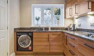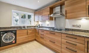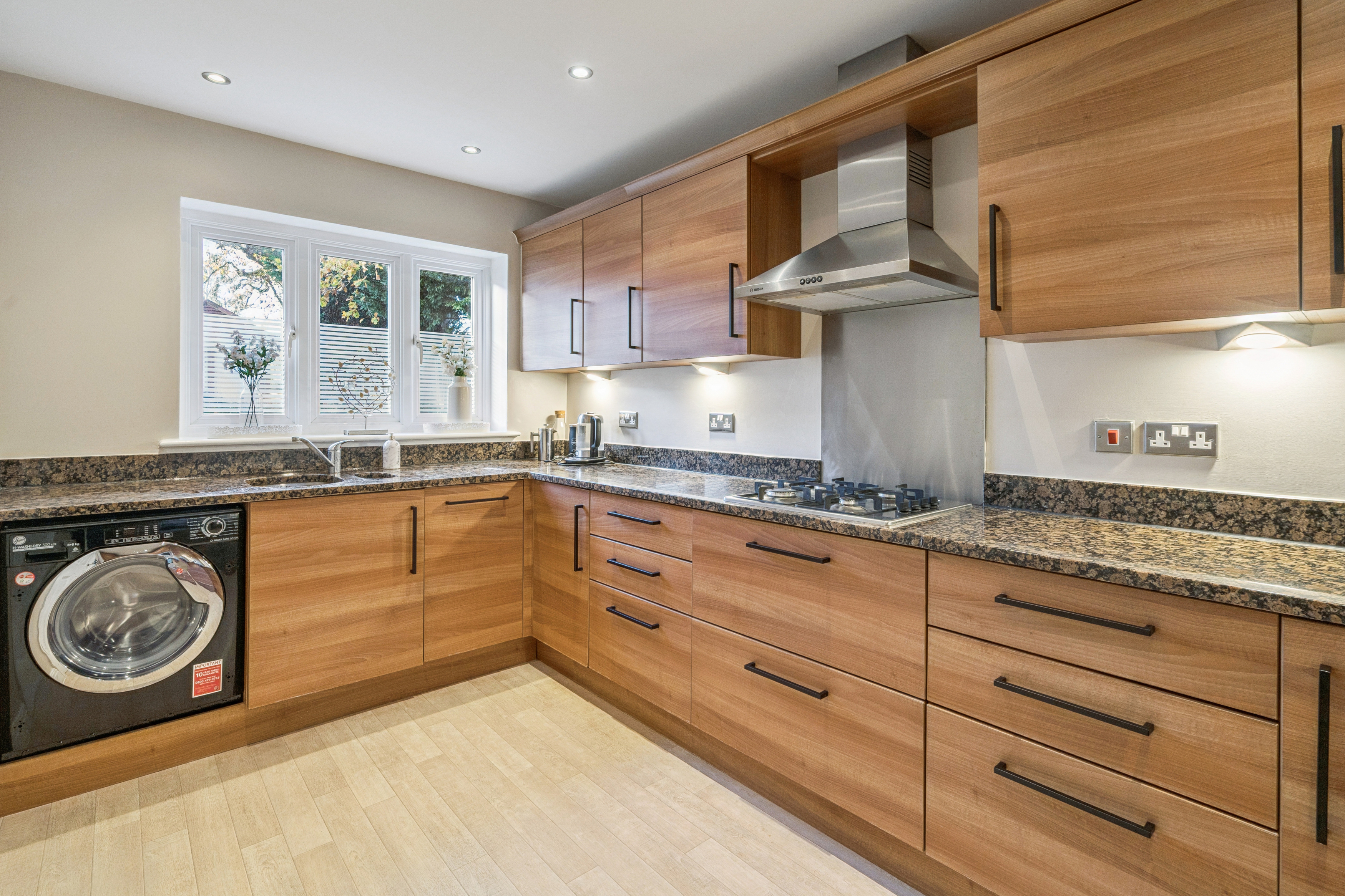 Upon entering, you are welcomed by a bright hallway where luxury vinyl flooring flows seamlessly through to the kitchen and downstairs cloakroom. The kitchen is stylish and well-appointed, featuring a range of wall and base units with granite worktops, along with integrated appliances including a fridge freezer, electric oven, microwave oven, four-ring gas hob with extractor, washer/dryer and dishwasher. The downstairs WC is fitted with a vanity unit, WC and a heated towel rail, and there is useful understairs storage.