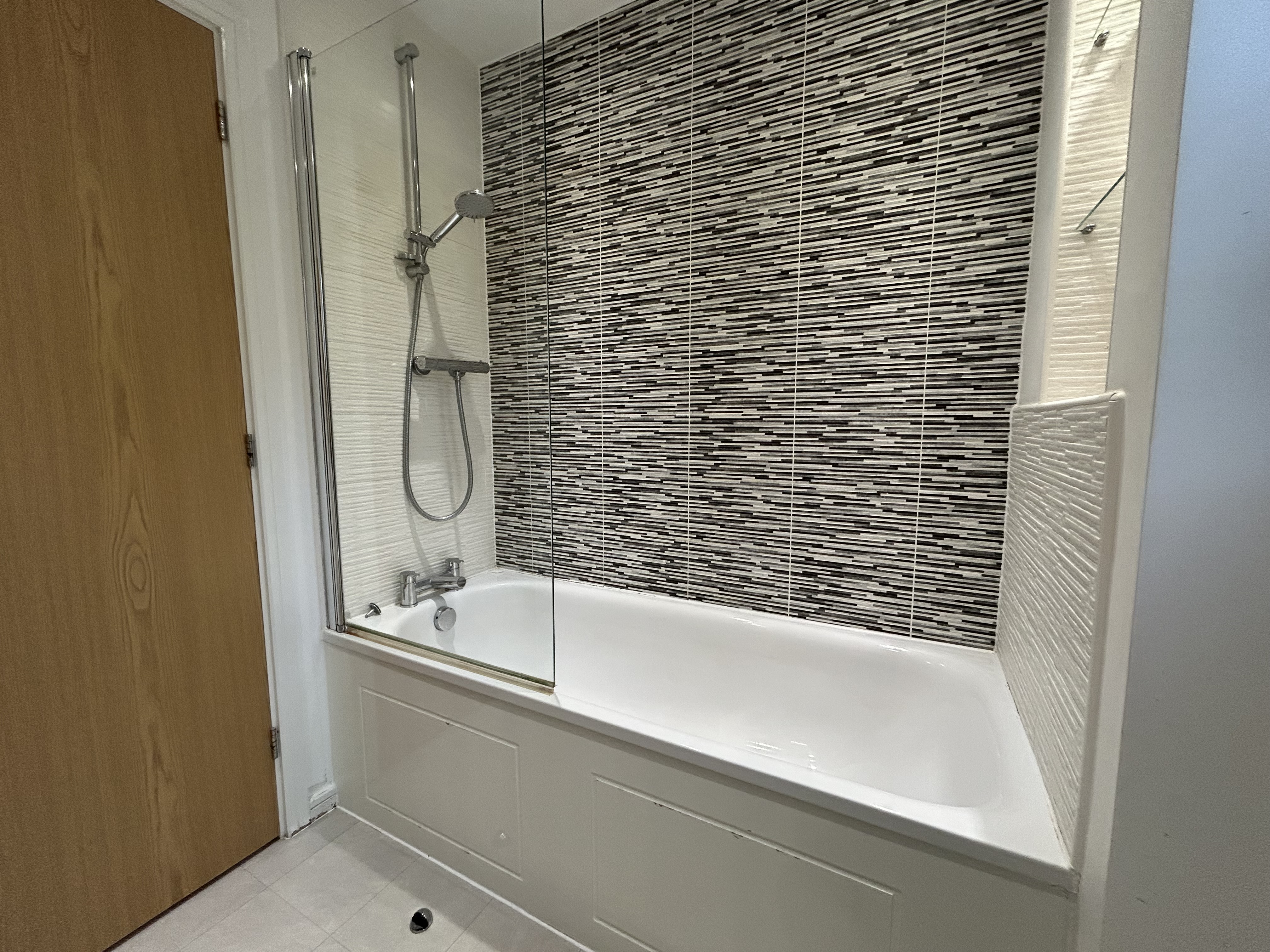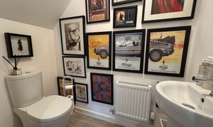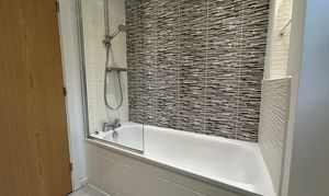Window to side elevation. Part tiled walls and floor. Fitted with low-level W.C, vanity handwash basin, shower and bath.