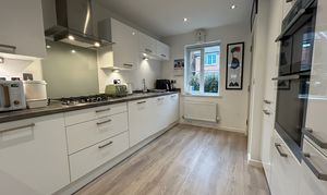 Window to to front elevation. Range of wall and base units. Fitted with integrated appliances which include; double oven, hob, extractor, fridge/freezer, dishwasher, washing machine. Open to:
