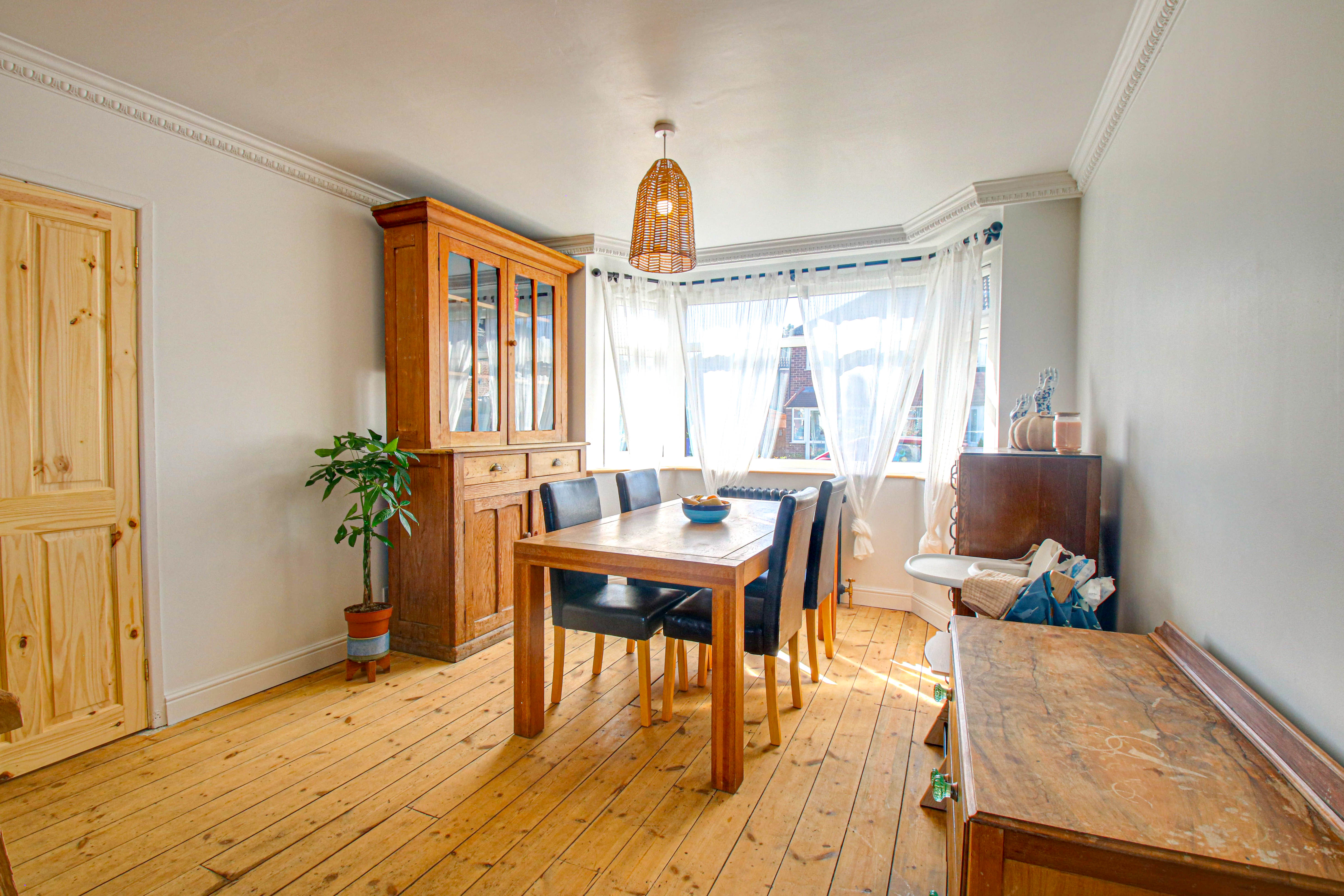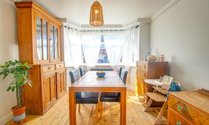 Front facing upvc bay window, matt black cast iron radiator with brass features, wooden flooring and coving.