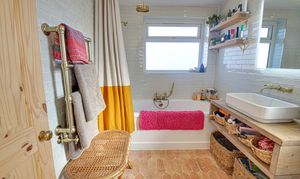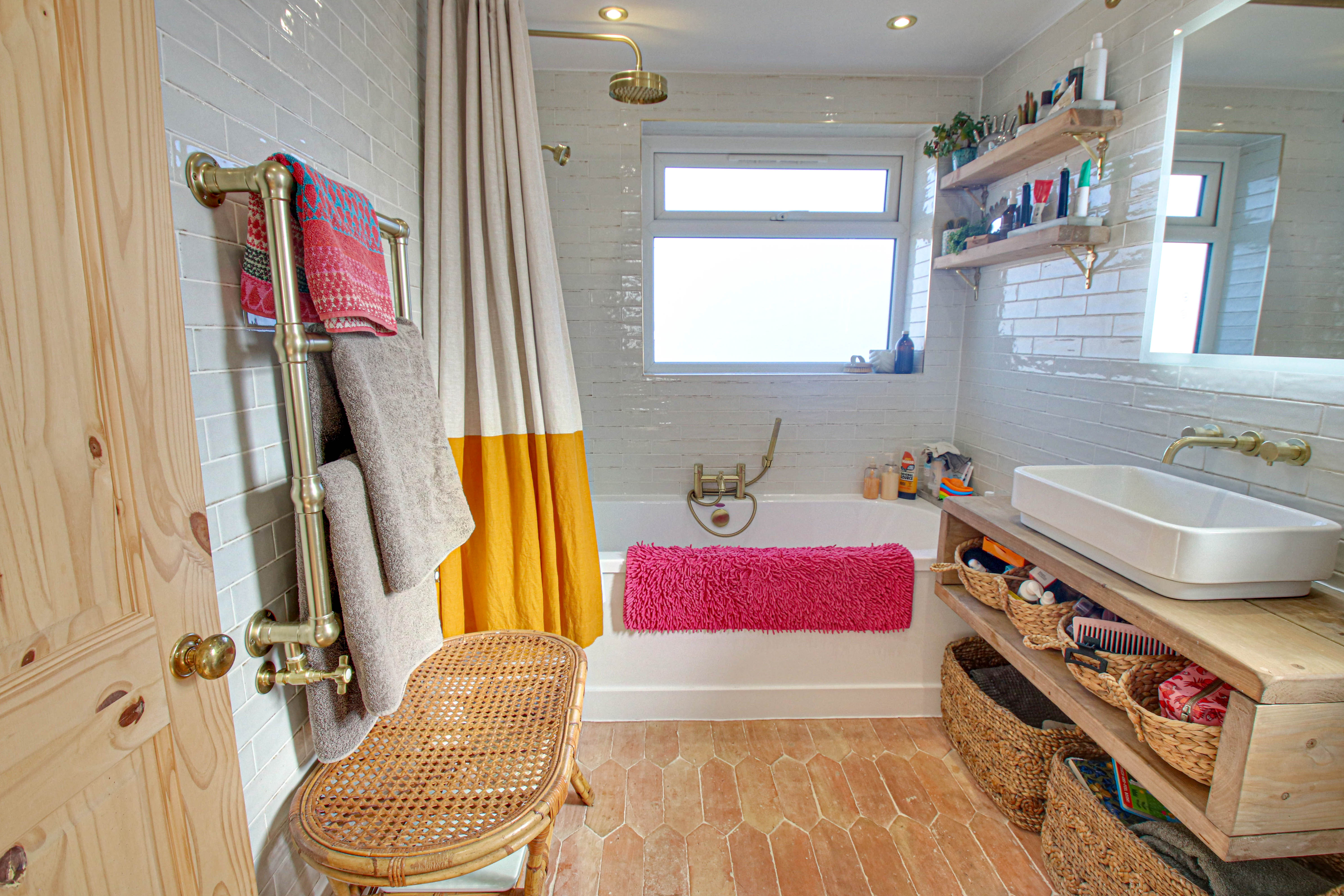 Rear and side facing upvc window, terracotta tiled flooring, panel bath with over bath waterfall shower with detachable head and additional head mixer tap both with brass styling, solid wood floating vanity sink and towel store, low flush wc and tiled flooring.