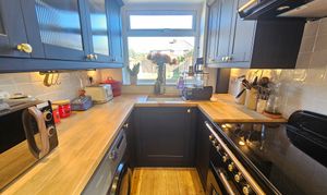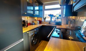 Rear facing upvc window, newly fitted modern range of anthracite base and wall units with solid wood work surfaces, wooden flooring, matt black cast iron radiator with brass finishes, under-stairs store and side facing stable door.