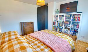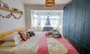 Front facing upvc bay window, wooden flooring, fitted anthracite coloured wardrobes and matt black cast iron radiator with brass finish.