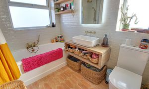 - Stunning Newly Installed Bathroom Suite with Terracotta Tiled Floor and Brass Finish to Shower and Head Mixer Tap