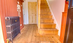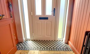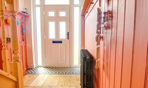 Wooden flooring, wood panelling with shelf for storage and coat hooks, New traditional spindle staircase, cast iron radiator, black and white tiling to entrance and under-stairs cupboard.