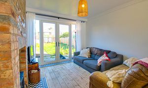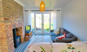 Rear facing upvc french doors and window, wooden flooring, inset to exposed brick chimney is a Log burner and black and white tiled flooring to the log burner flooring and also along the french door area.