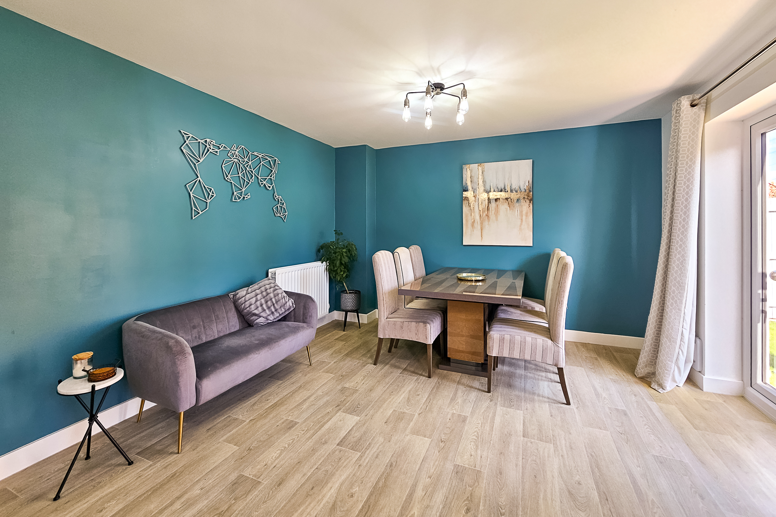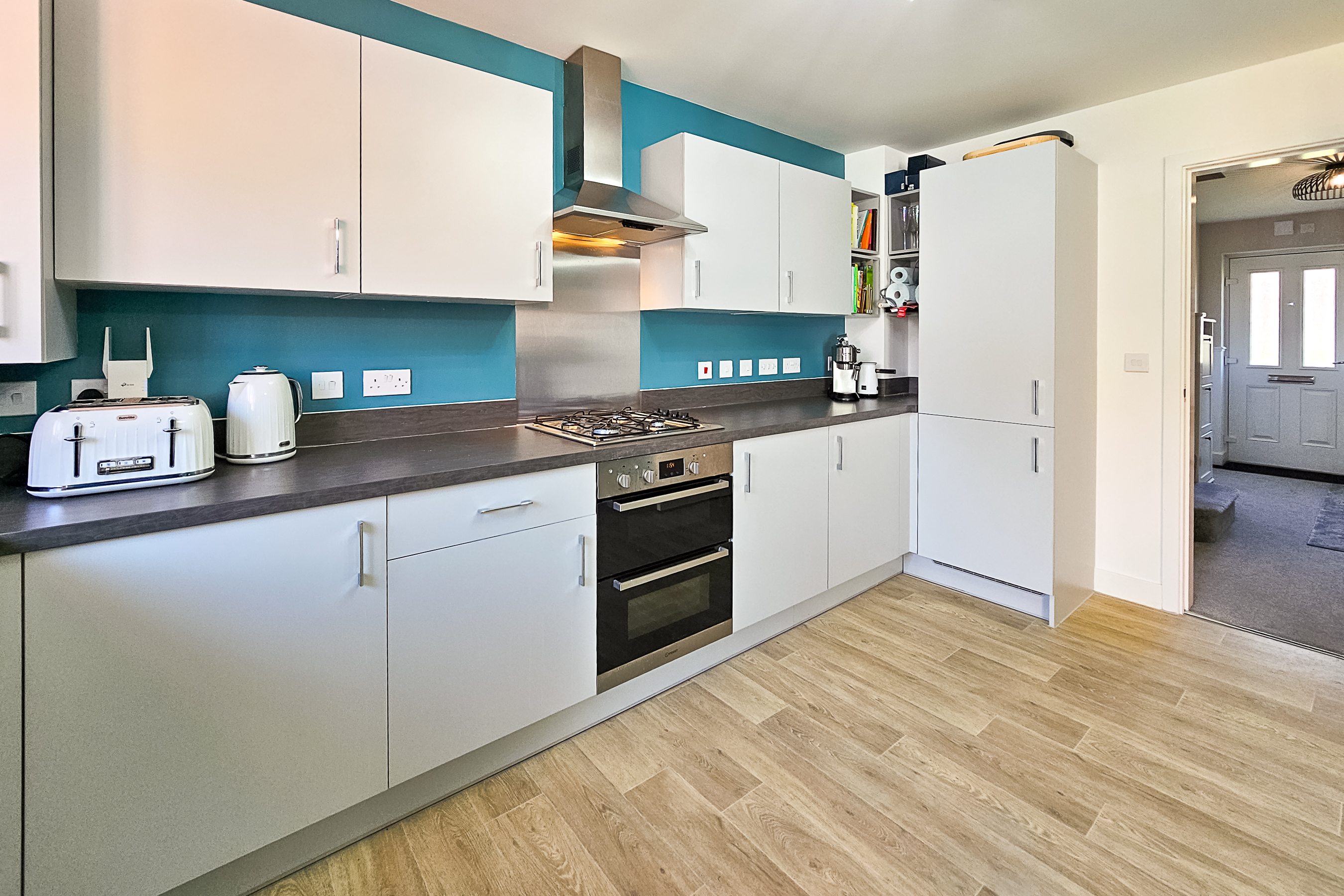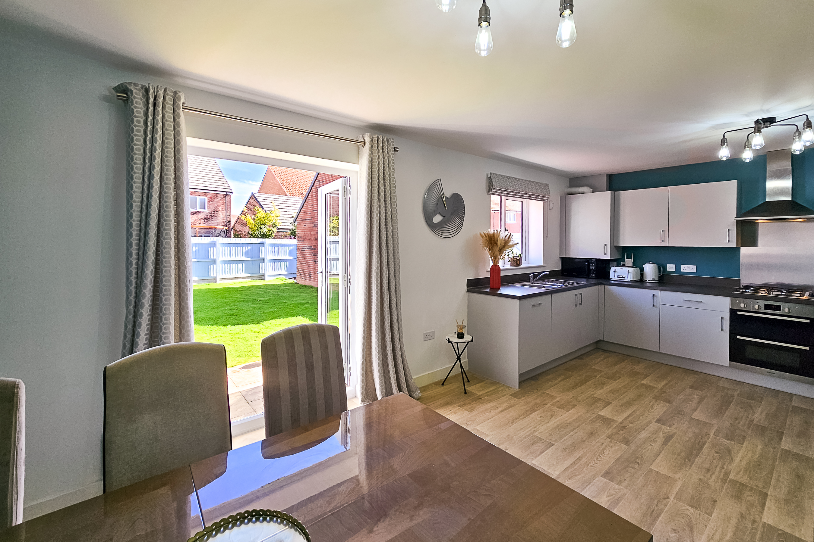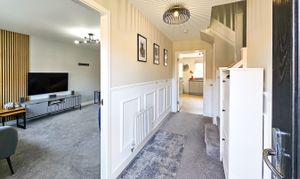 The ground floor opens with a welcoming entrance hall and guest WC. To the front sits a bright and comfortable living room, while to the rear, the highlight of the home is found — a contemporary open-plan kitchen-diner with ample space for family meals and entertaining, complete with French doors leading directly onto the private garden.