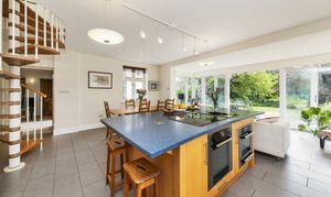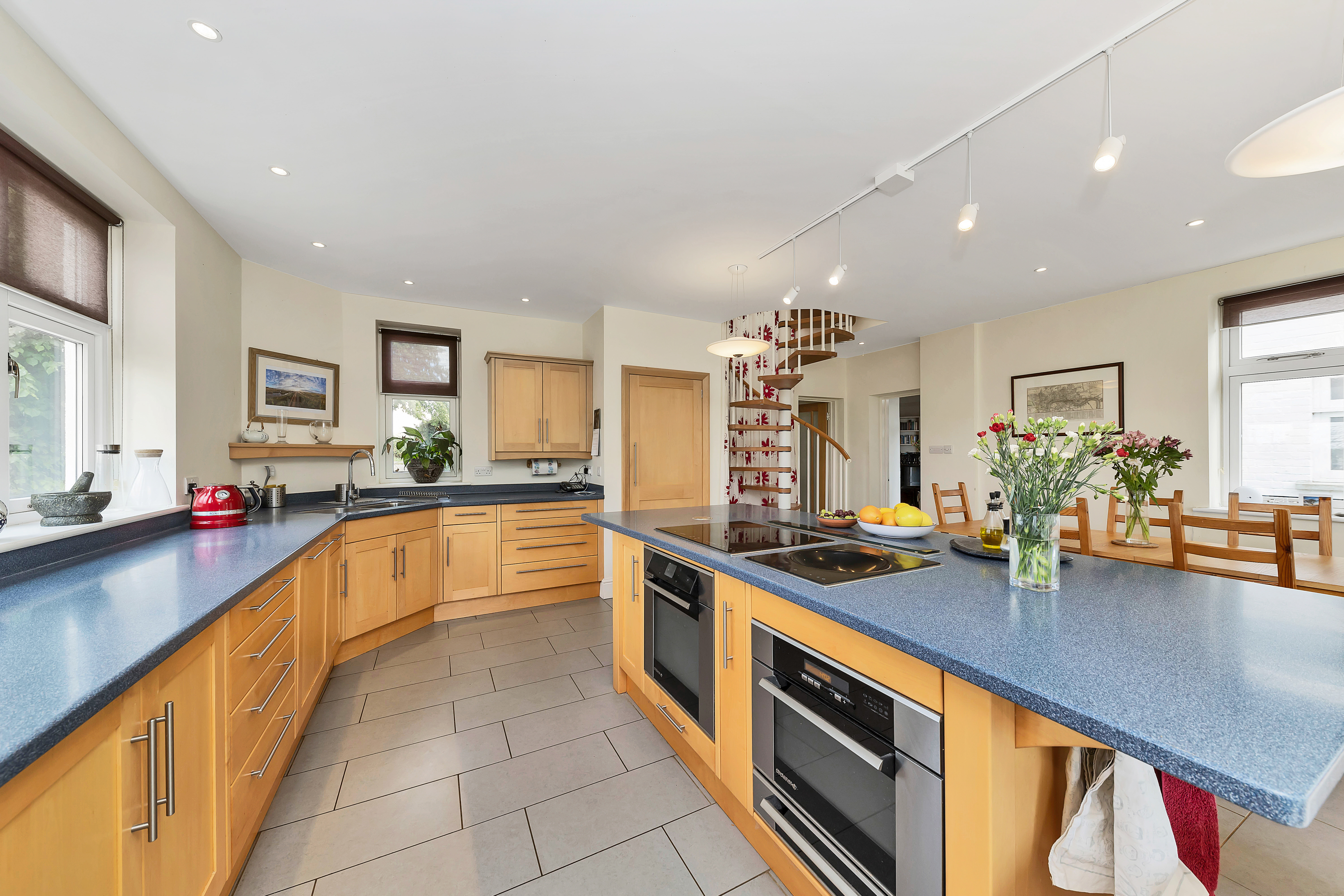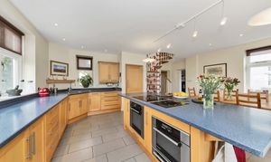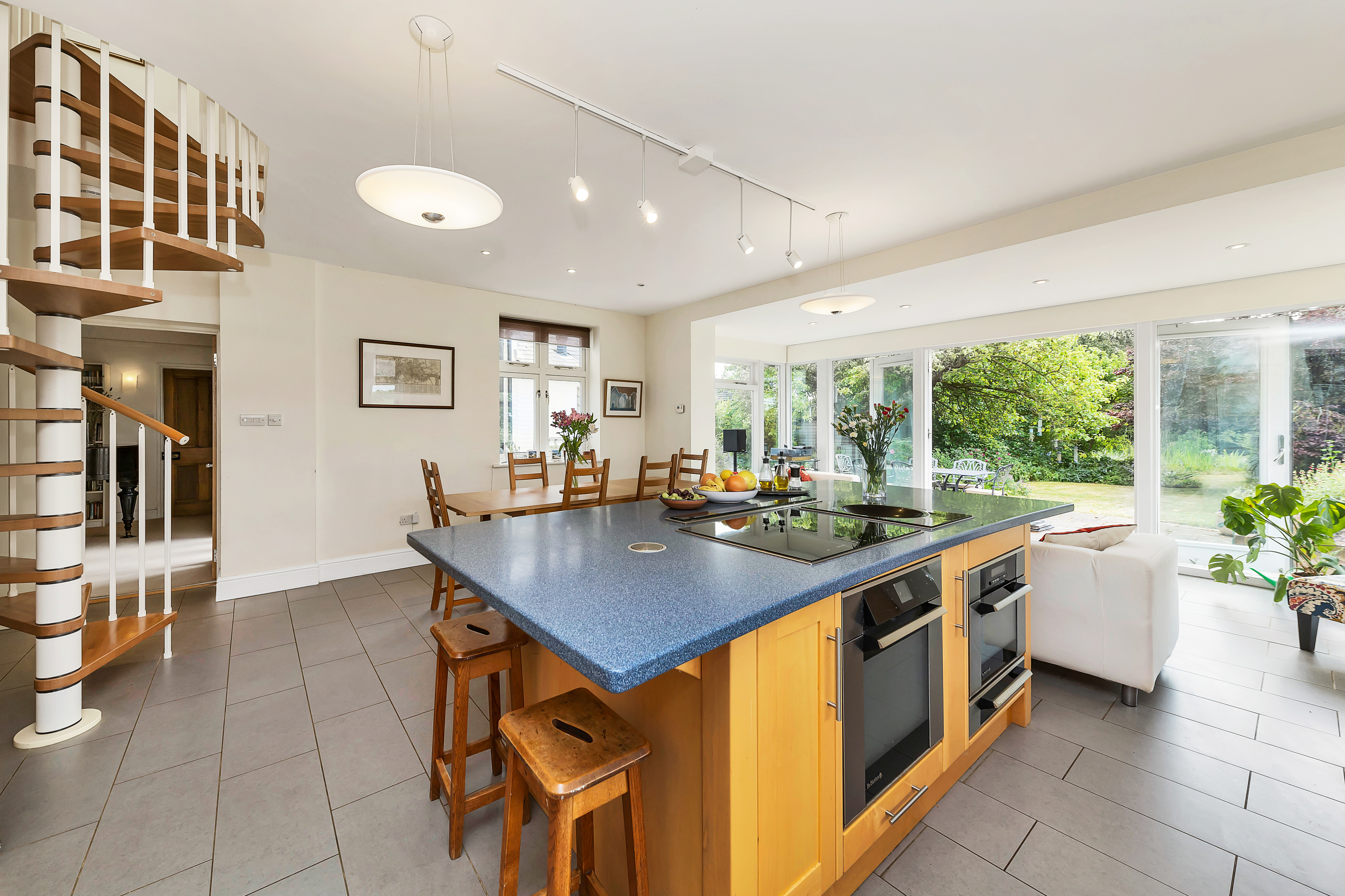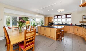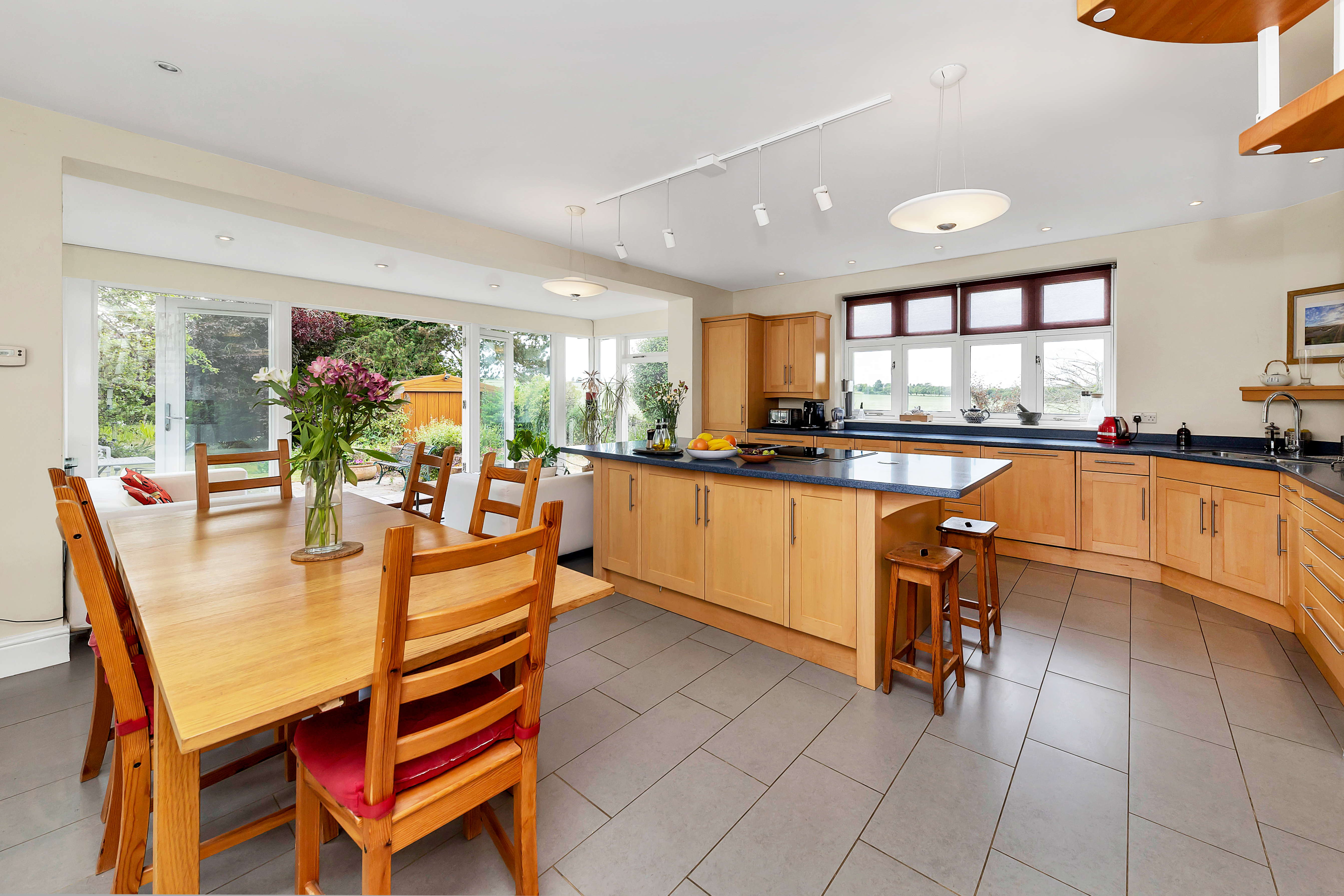 The kitchen/breakfast/dining room is a truly magnificent space, benefiting from large windows to the side and centre of the property, floor-to-ceiling windows and double French doors into the rear garden, and stunning panoramic countryside views. The kitchen area enjoys a wide bespoke, hand made, range of base and wall units, Corian worktops and upstands, a large island/breakfast bar, tiled flooring, inset and pendant lighting, integrated storage, pantry, a spiral staircase to the first floor, an integrated oven, hobs, inset hob for wok, microwave / second oven, dishwasher and fridge/freezer, and space for kitchen appliances. The dining area provides space for a large dining table and chairs, and there is further space by the French doors for family room furniture. The utility room is large and benefits from its own range of base units, a Reyburn, tiled flooring, and space for a range of further kitchen appliances. An archway leads through to the boot room, with further integrated storage cupboards, large airing cupboard, a butler sink, and access to the rear garden and to a cloakroom WC.