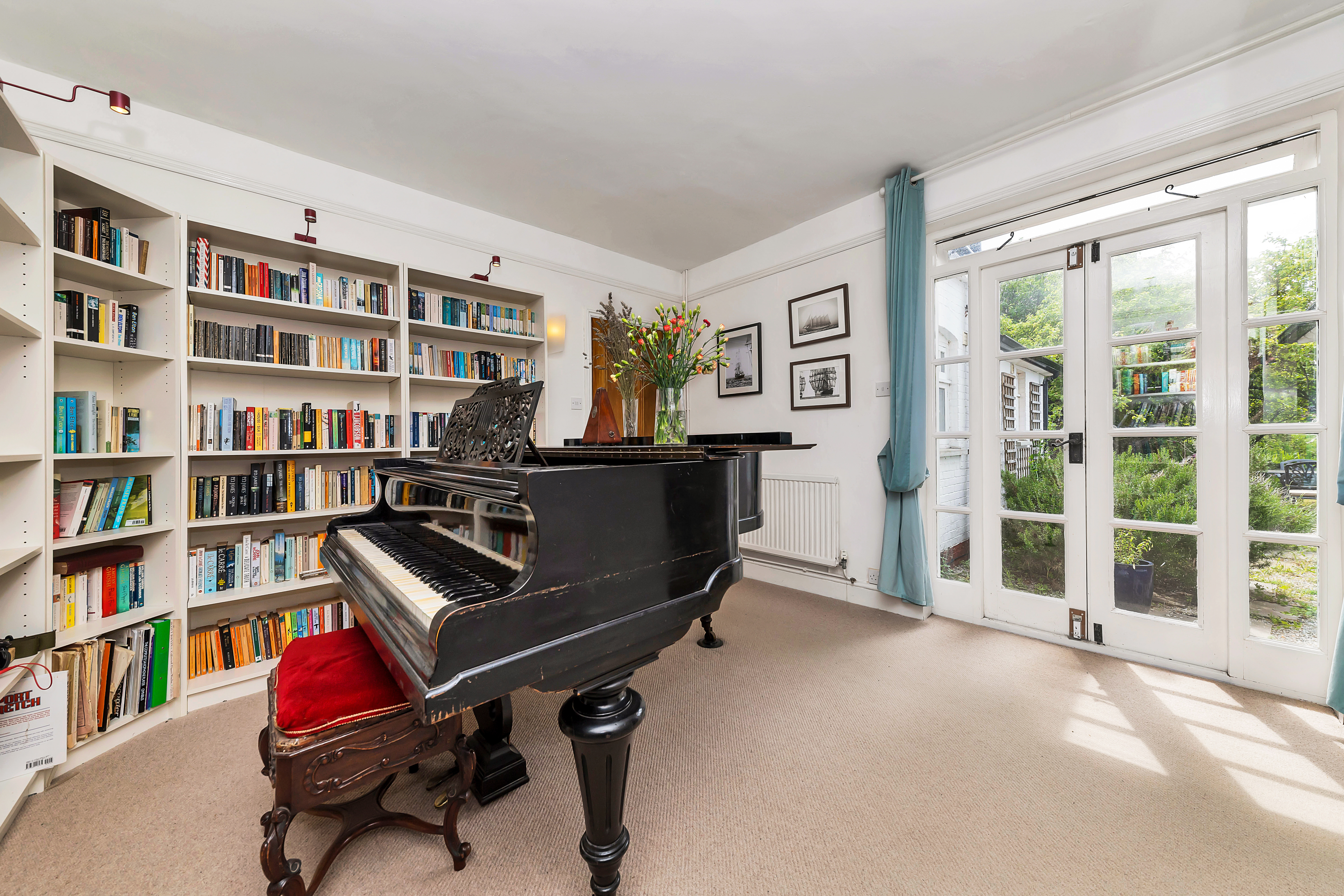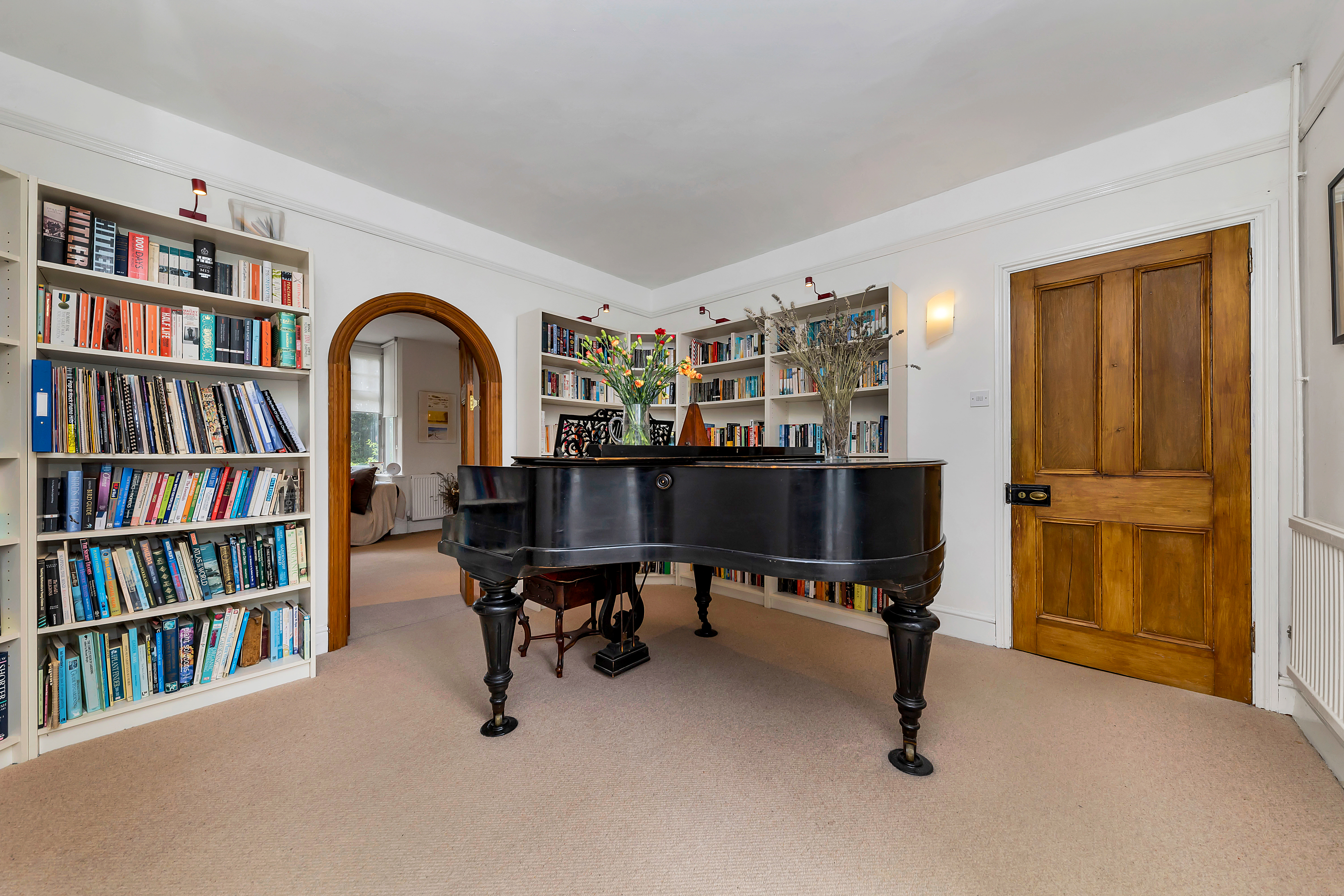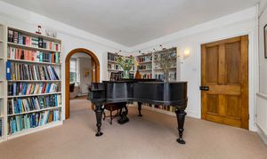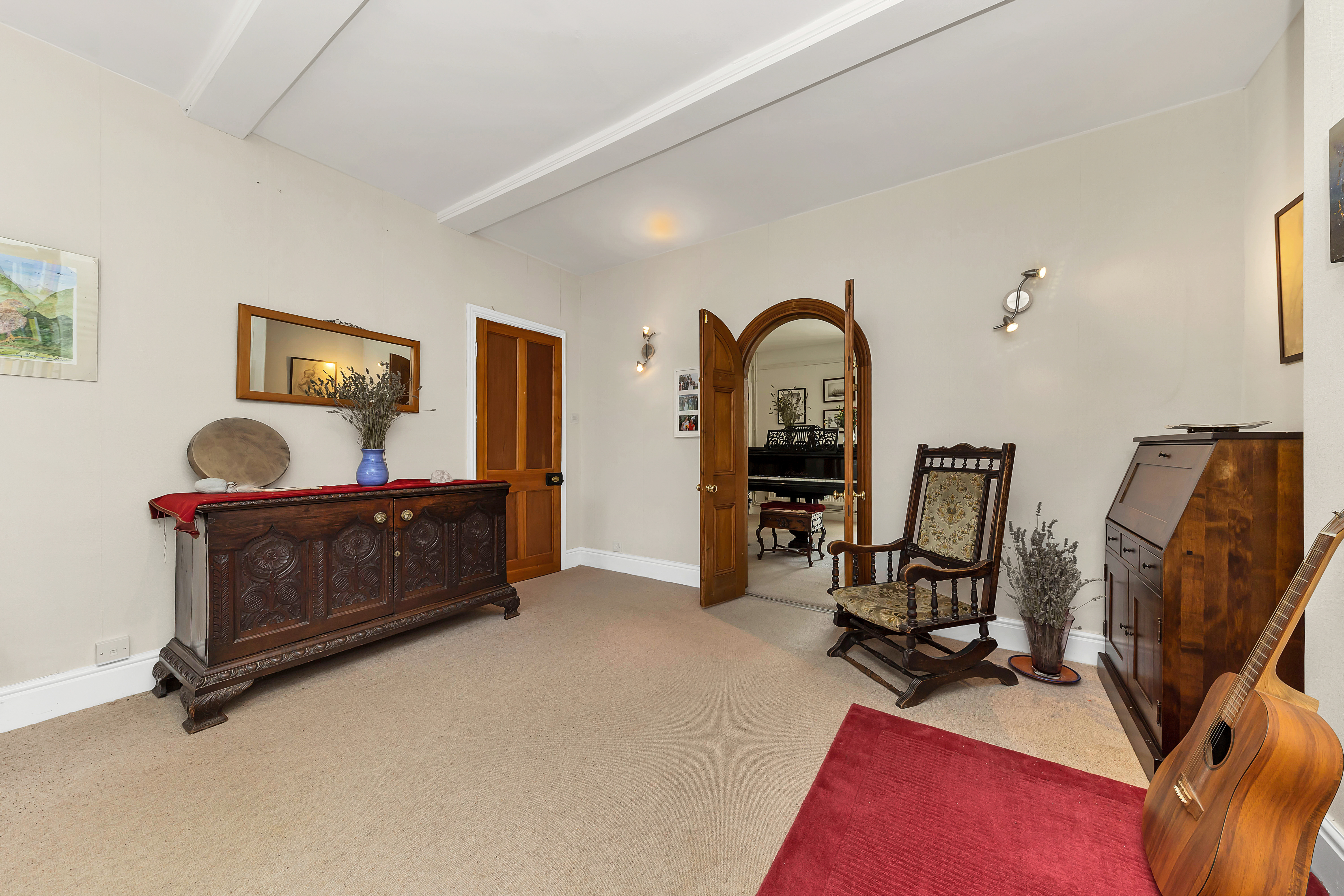 The sitting room to the front of the property enjoys a lovely relaxing atmosphere, with a large bay window to a front aspect, carpets, integrated shelving, spotlights, and space for a range of furniture. Ornate archway doors lead through to an exquisite music room/library, enjoying double French doors to the garden, and offering a versatile reception space for future owners. The main lounge is equally another beautiful reception space, with a wonderfully calm atmosphere, a fireplace with a wood-burning stove, 2 windows to a dual aspect, plush carpets, pendant lighting, and ample room for a variety of lounge and storage furniture.