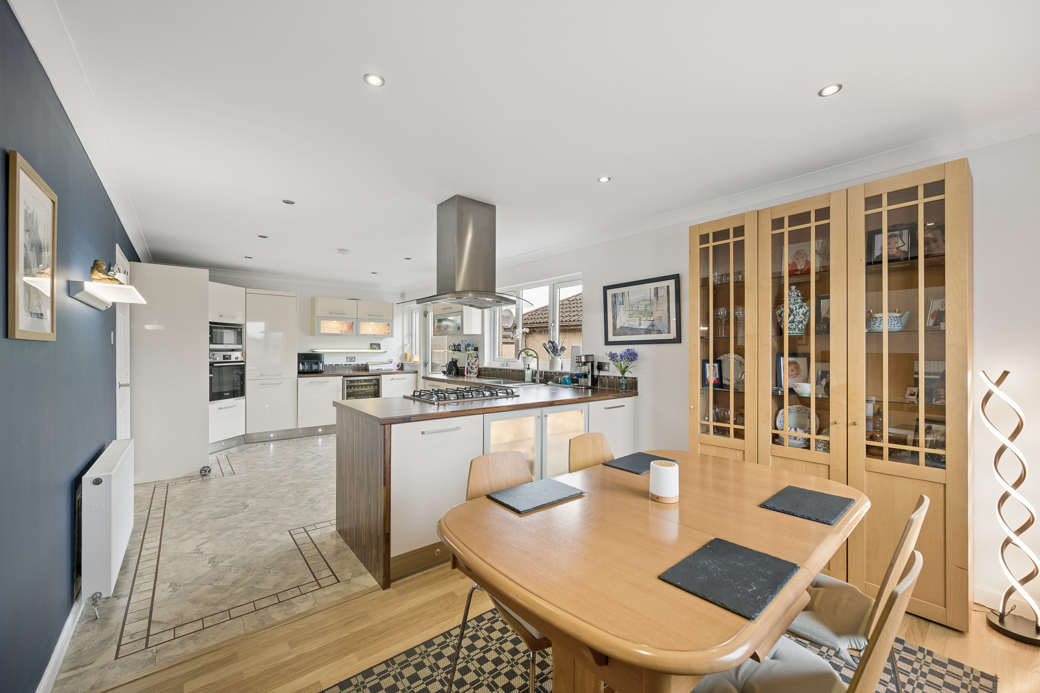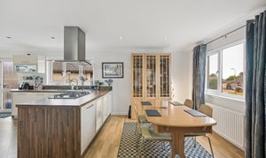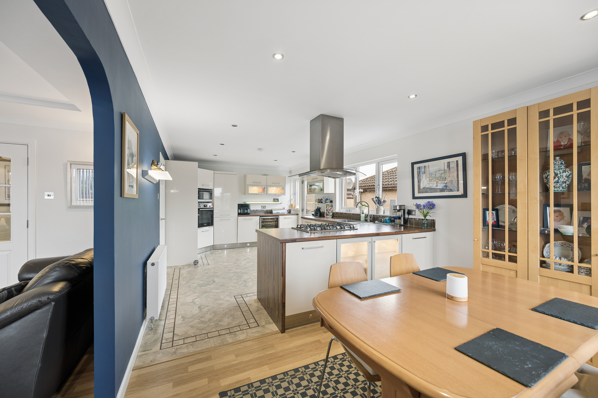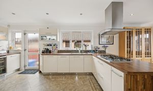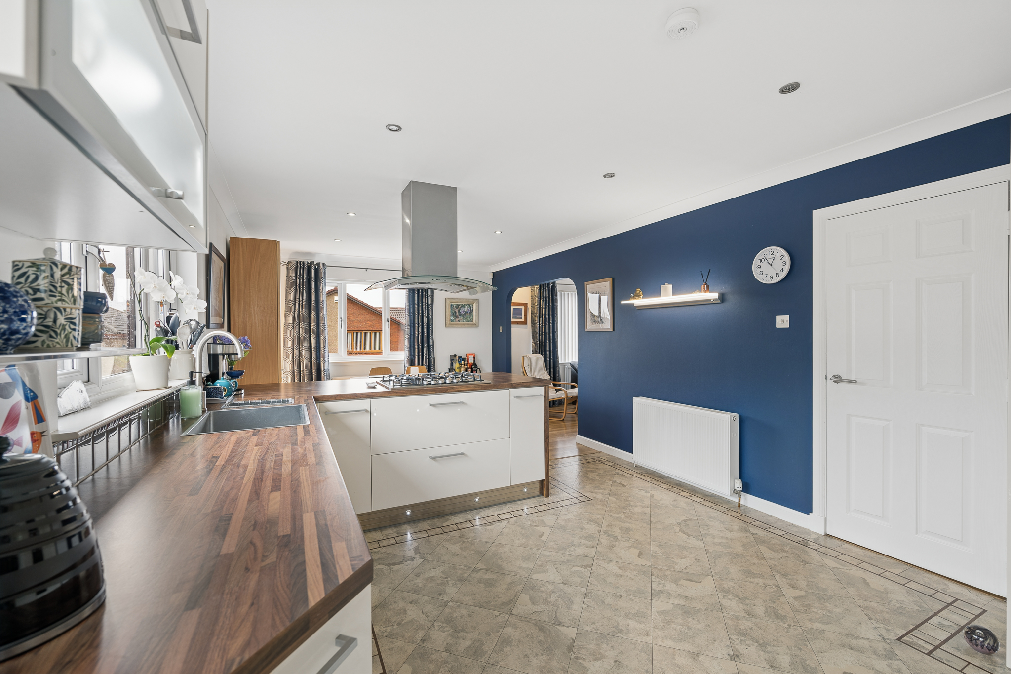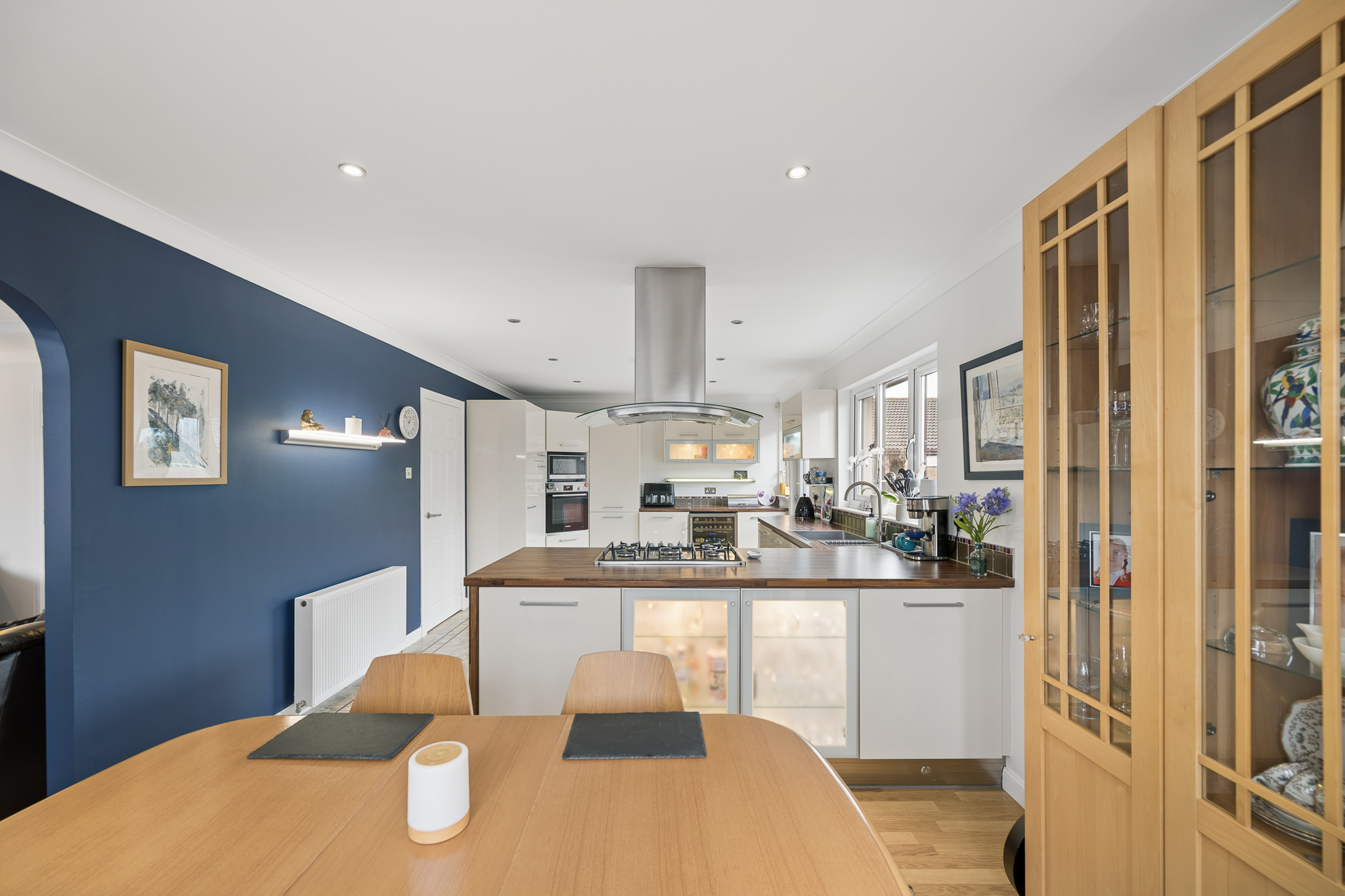 Beyond this sits the impressive kitchen, which offers both practicality and style in equal measure. The cabinetry is finished in soft neutral tones and paired with warm wood effect worktops that create a welcoming and timeless feel. Integrated appliances are neatly incorporated throughout and a striking cooker hood sits above the centrally positioned hob, which is cleverly set within a peninsula style worktop that gives the kitchen an almost island like feel. This layout provides excellent preparation space while still maintaining an open, sociable atmosphere between the kitchen and dining areas. Large windows bring in even more natural light and a convenient side door leads directly out to the driveway and rear garden, making access to the outdoor space effortless.