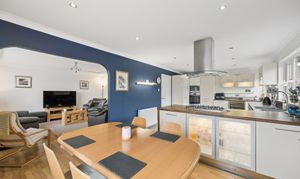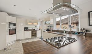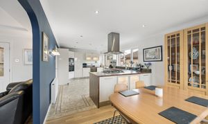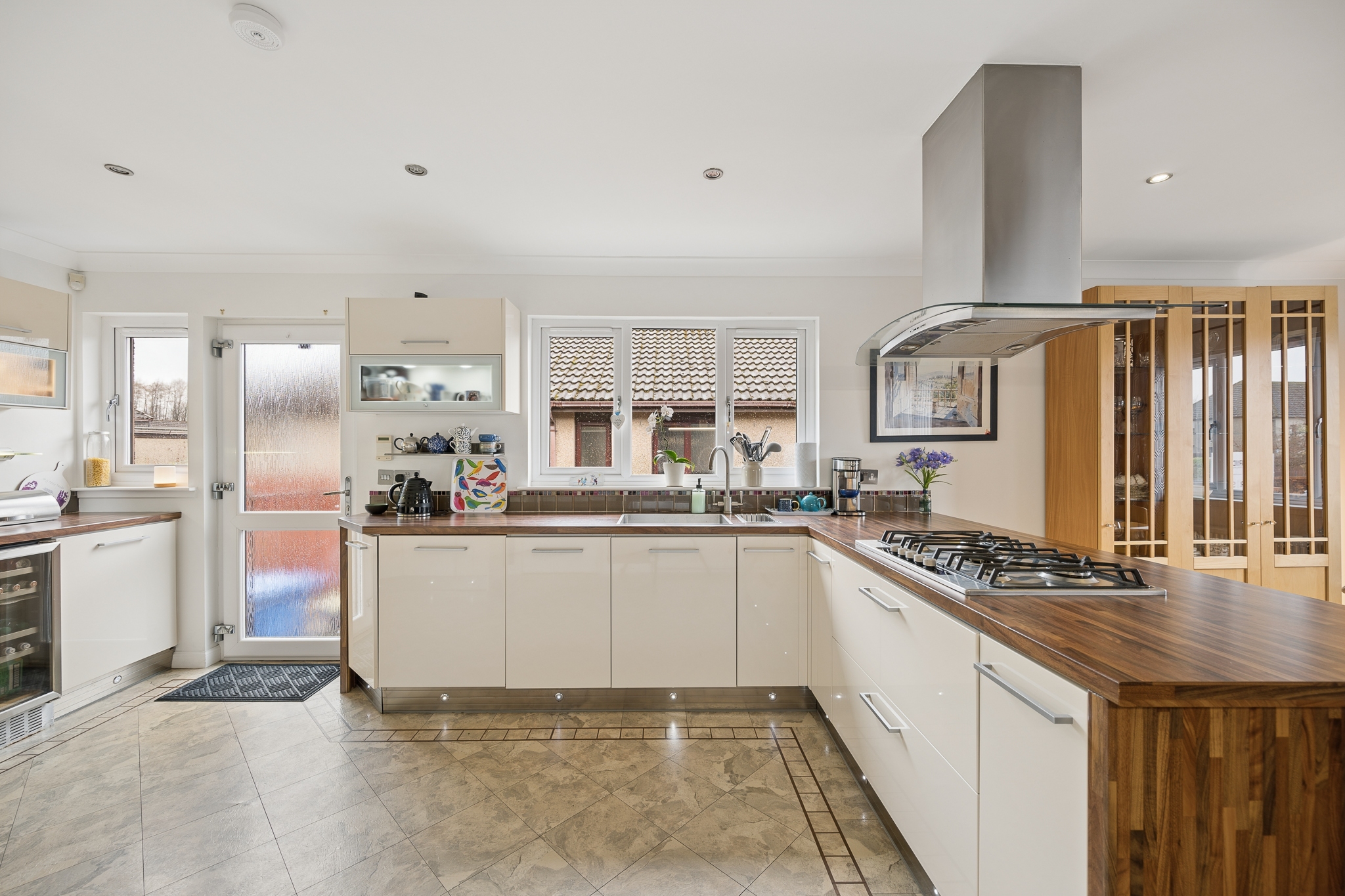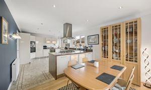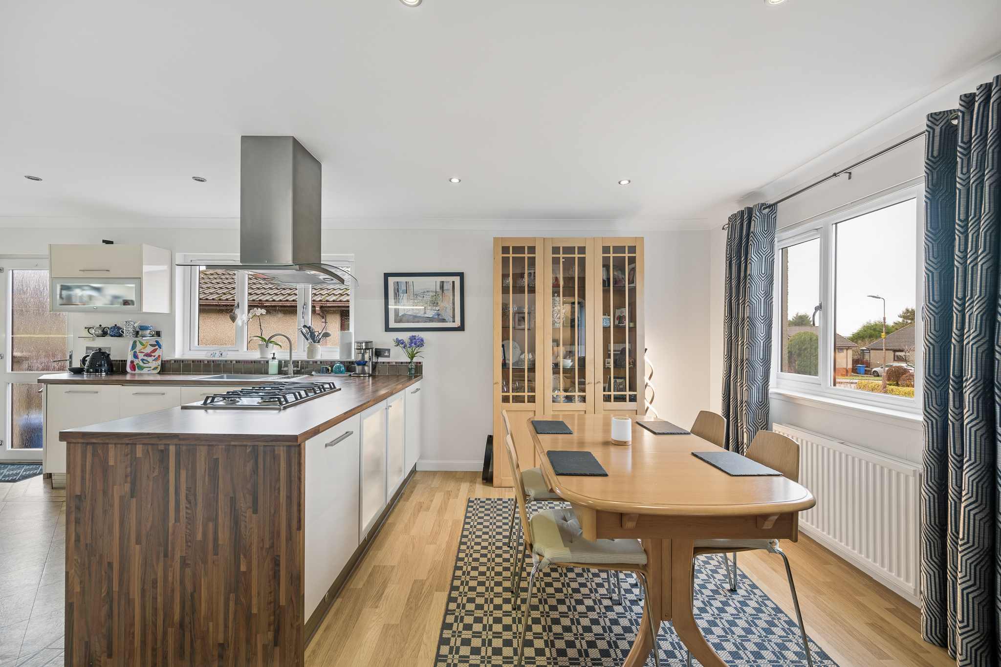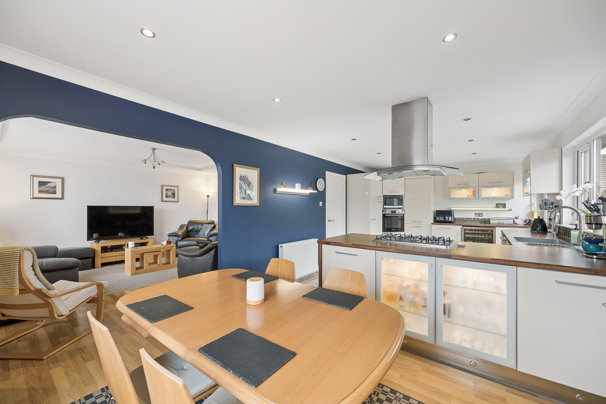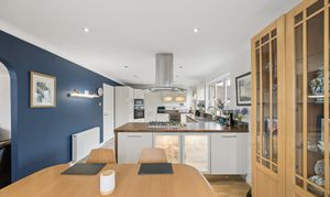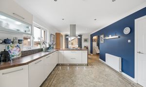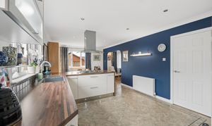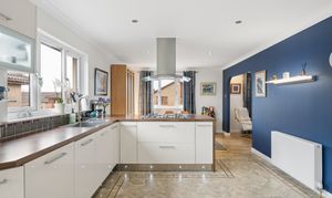 Beyond this sits the impressive kitchen, which offers both practicality and style in equal measure. The cabinetry is finished in soft neutral tones and paired with warm wood effect worktops that create a welcoming and timeless feel. Integrated appliances are neatly incorporated throughout and a striking cooker hood sits above the centrally positioned hob, which is cleverly set within a peninsula style worktop that gives the kitchen an almost island like feel. This layout provides excellent preparation space while still maintaining an open, sociable atmosphere between the kitchen and dining areas. Large windows bring in even more natural light and a convenient side door leads directly out to the driveway and rear garden, making access to the outdoor space effortless.