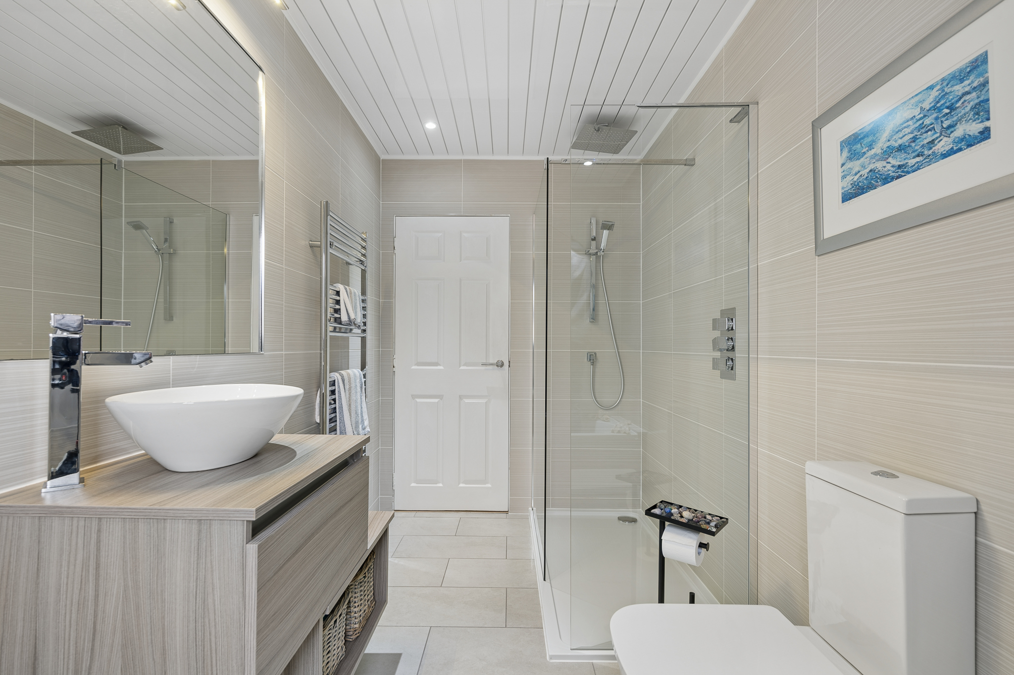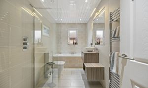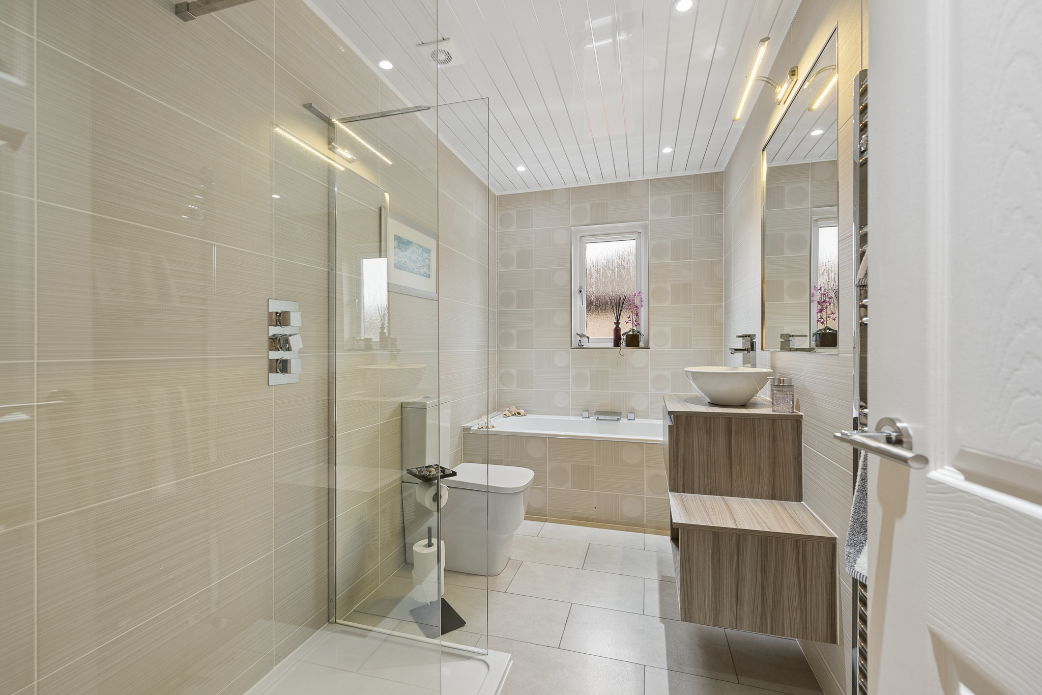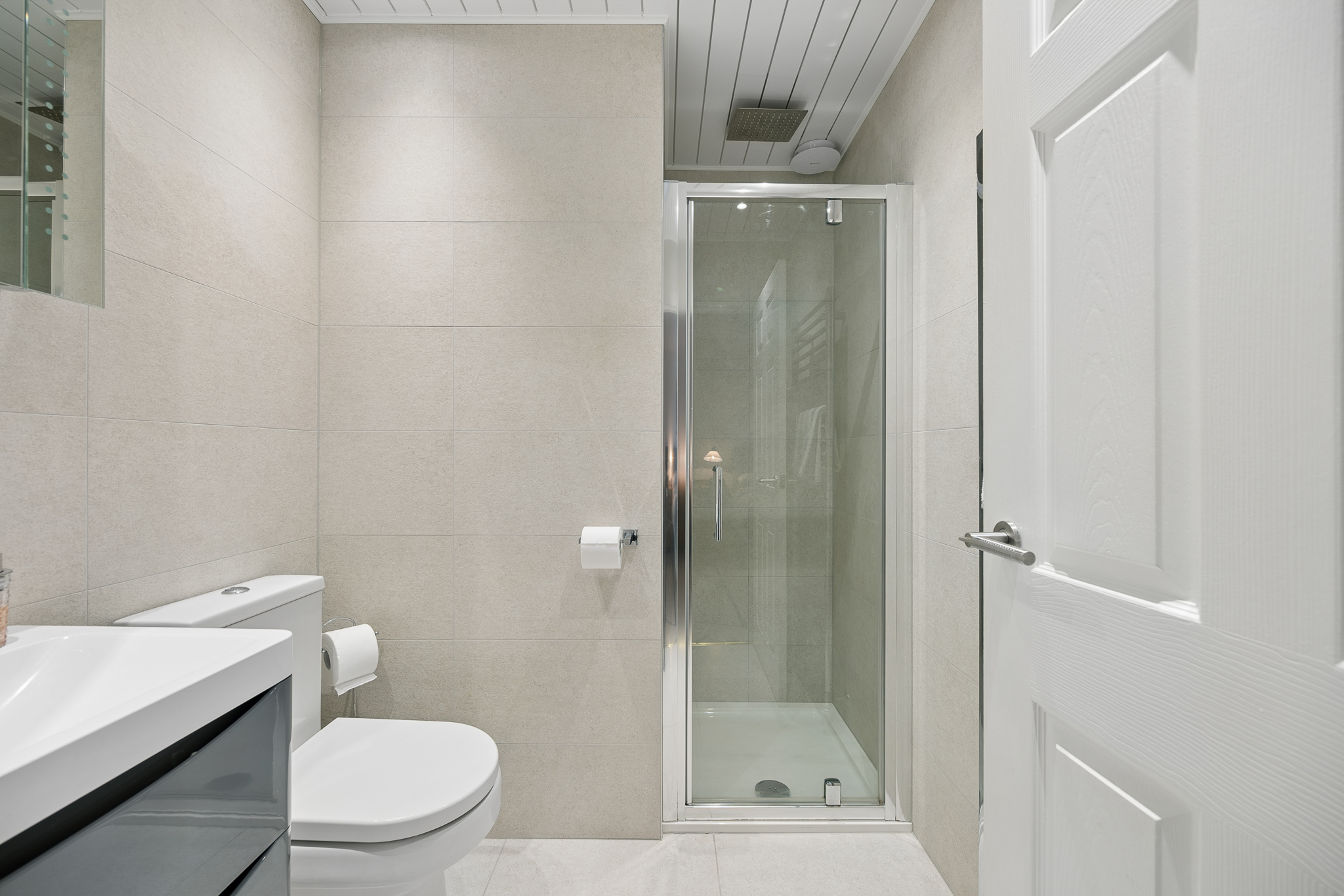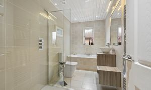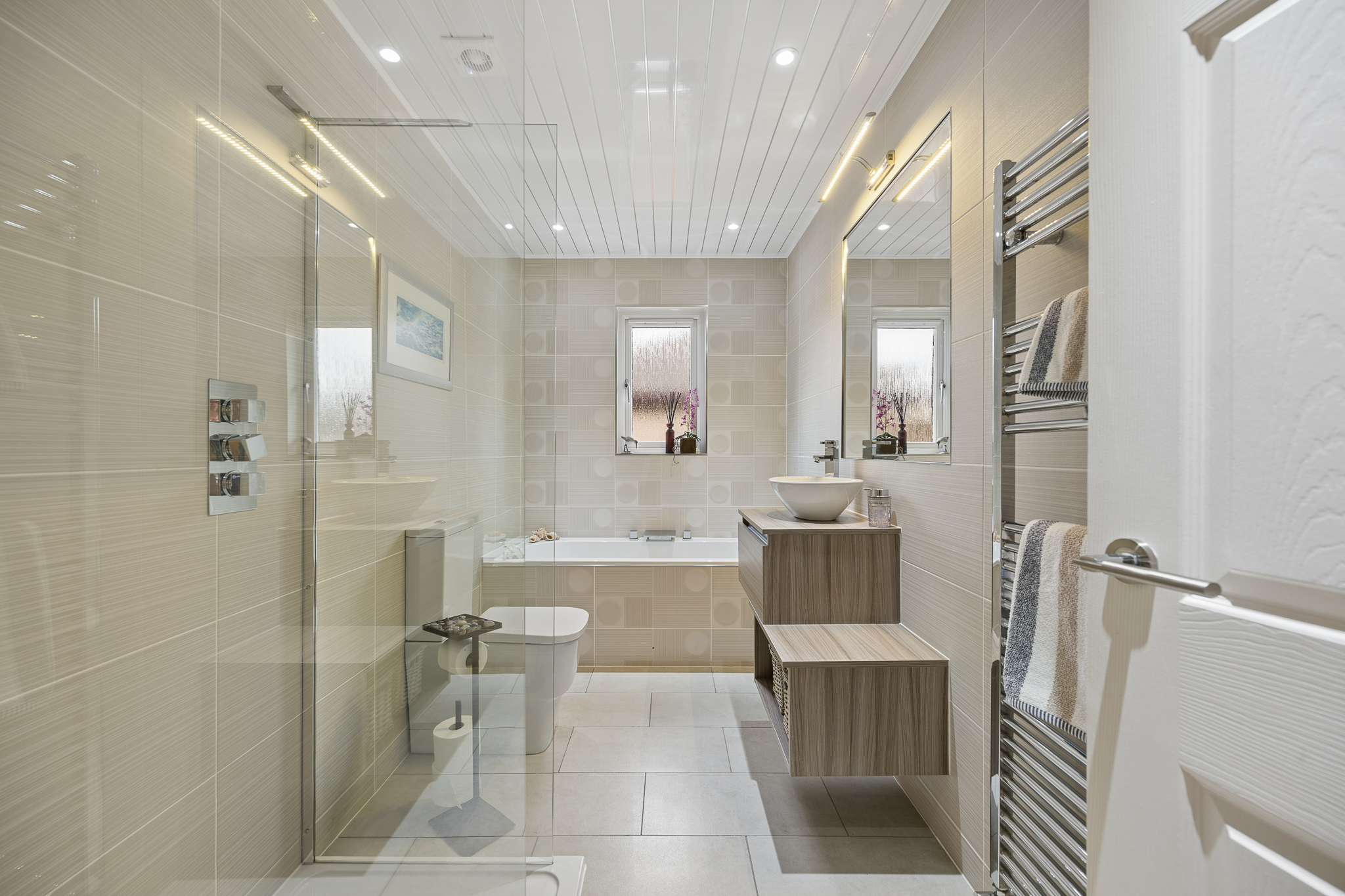 Heading back along the hallway, you will find the family bathroom located to the right hand side. This room has been beautifully finished to create a luxurious four piece suite that feels like a true spa inspired sanctuary. Fully tiled from floor to ceiling, the bathroom features a stylish walk in shower enclosure, a sleek contemporary bath perfect for relaxing soaks, a modern vanity unit with basin and WC. The soft tones and elegant finishes give the room a calm, tranquil atmosphere.