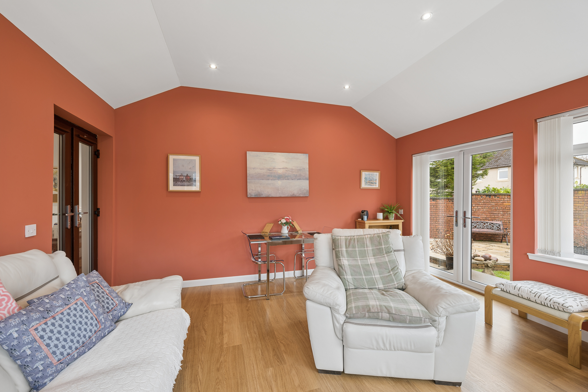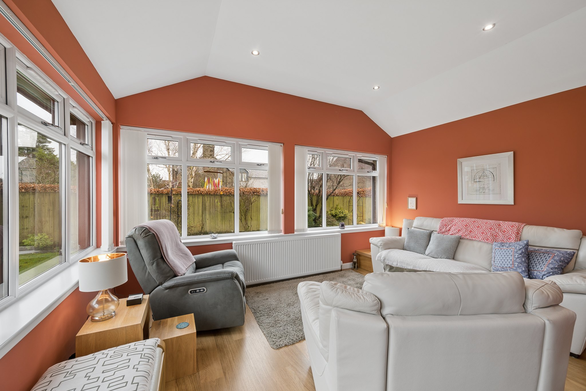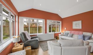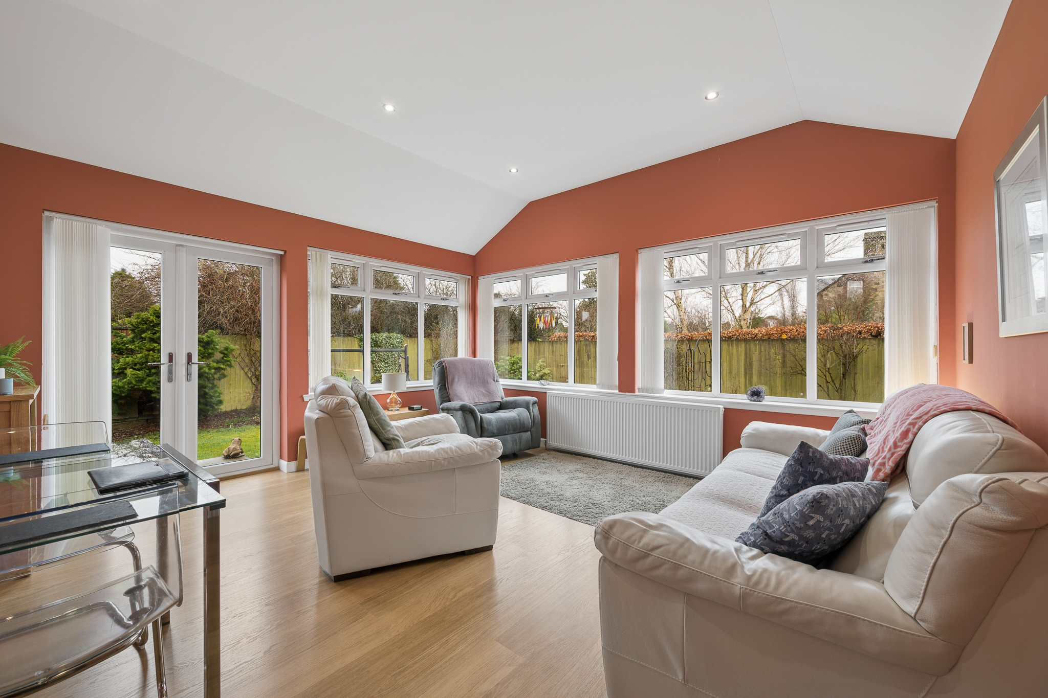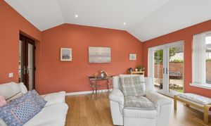 From here you step into the stunning sunroom extension, a wonderfully bright and uplifting space that truly enhances the home. With its vaulted ceiling and expansive windows, the room is bathed in natural light throughout the day. The warm terracotta toned feature walls add character and vibrancy, creating a cheerful and welcoming atmosphere that makes this the perfect spot to relax with a morning coffee or unwind in the evening. Large patio doors open directly out to the garden, seamlessly connecting indoor and outdoor living.