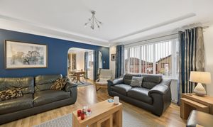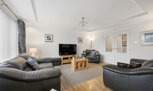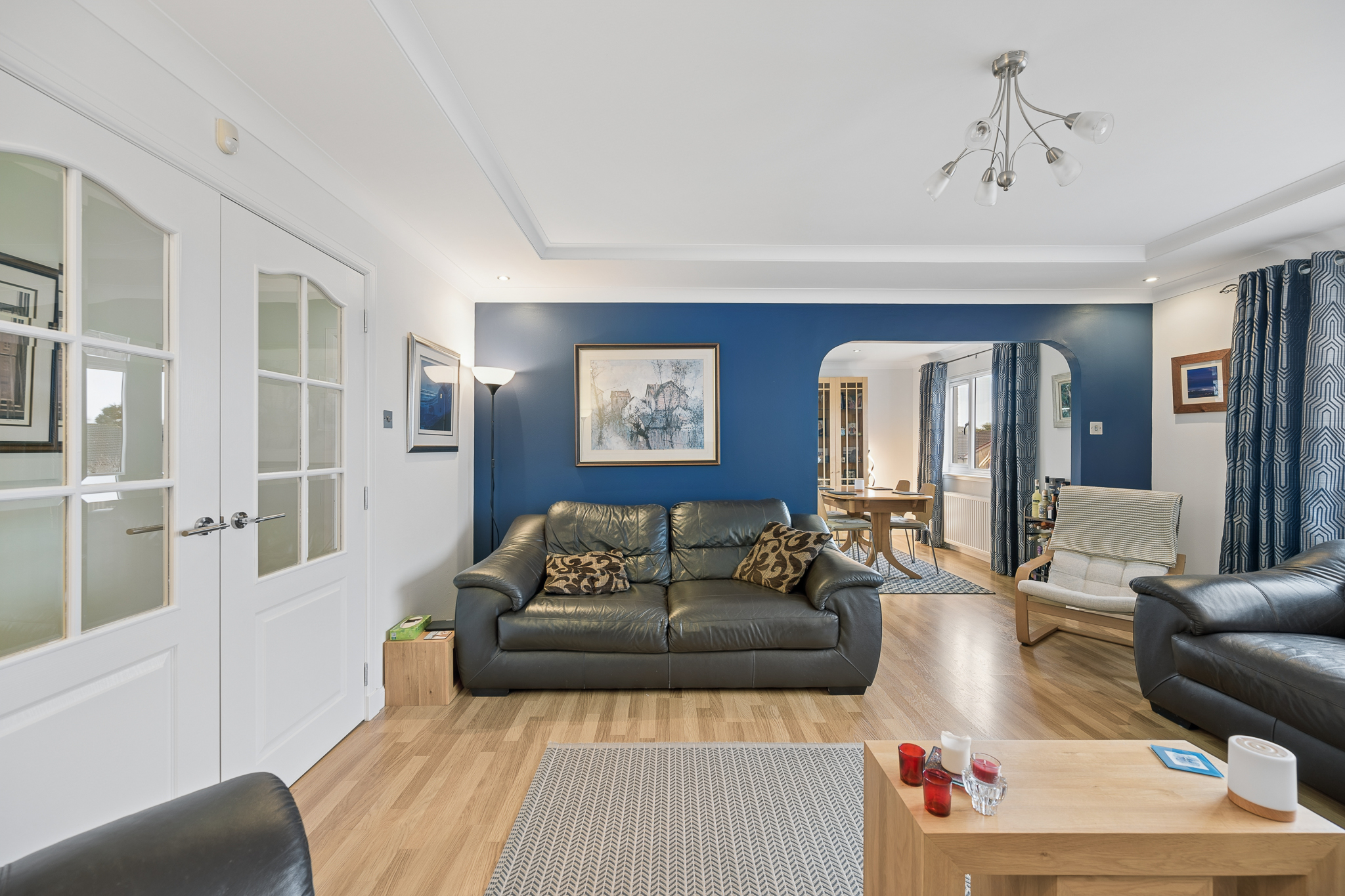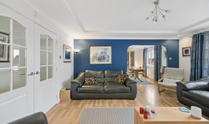 Continuing along the corridor, you arrive at the main living room, accessed through a set of double doors that immediately open the space up. This is a beautifully bright and spacious living area, with large windows overlooking the front of the property. The room benefits from an east facing aspect, meaning it is filled with gorgeous morning sunlight that streams in through the windows, creating a wonderfully light and uplifting space to start your day. With ample room for multiple sofas and furniture arrangements, it is the perfect place to relax and unwind.