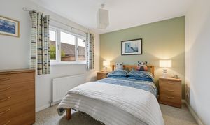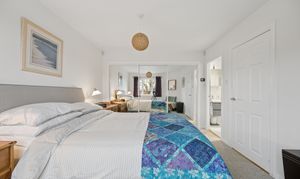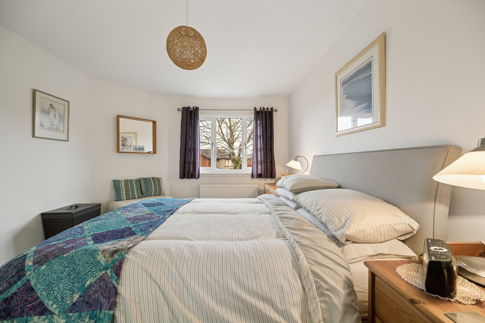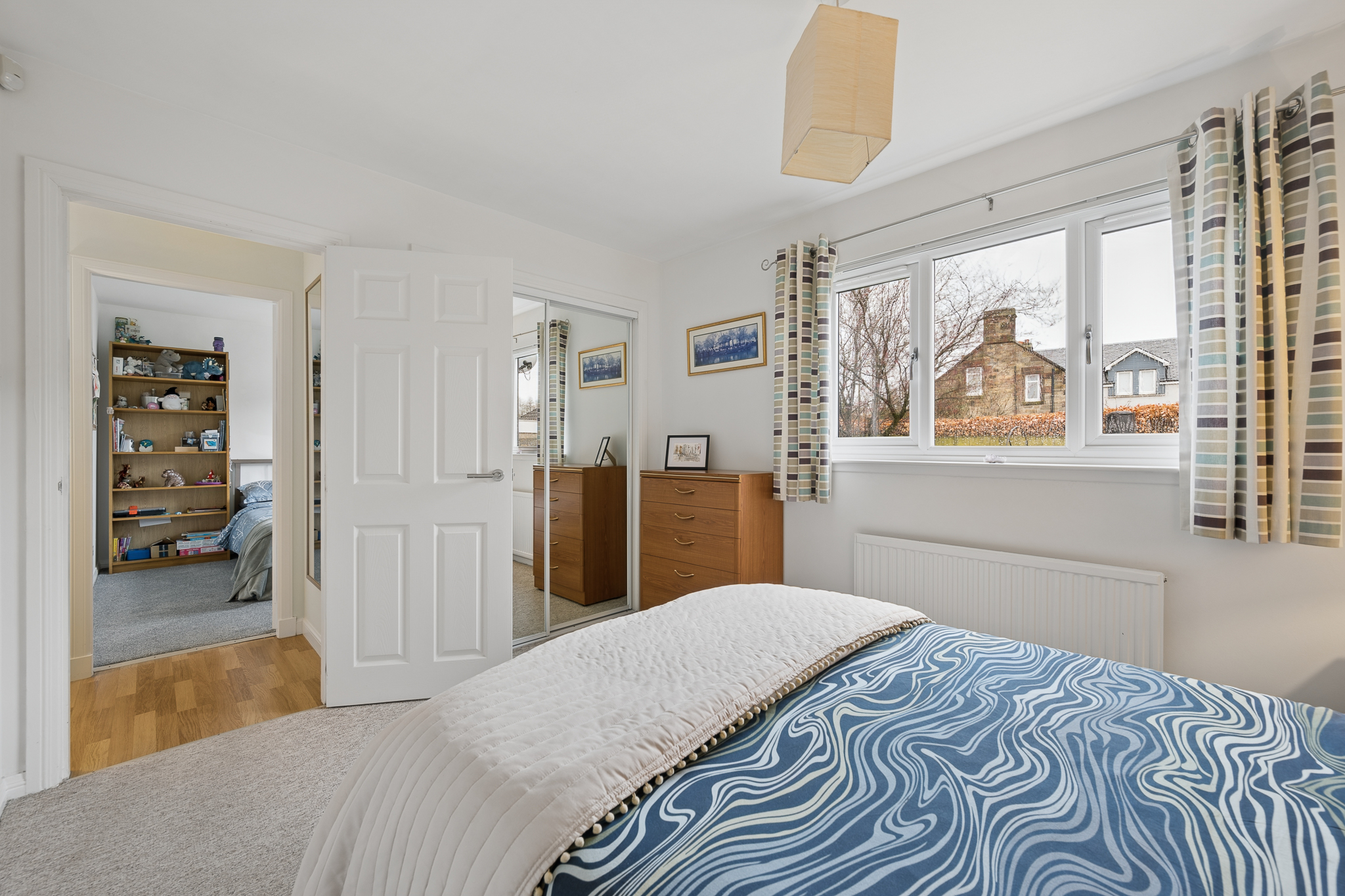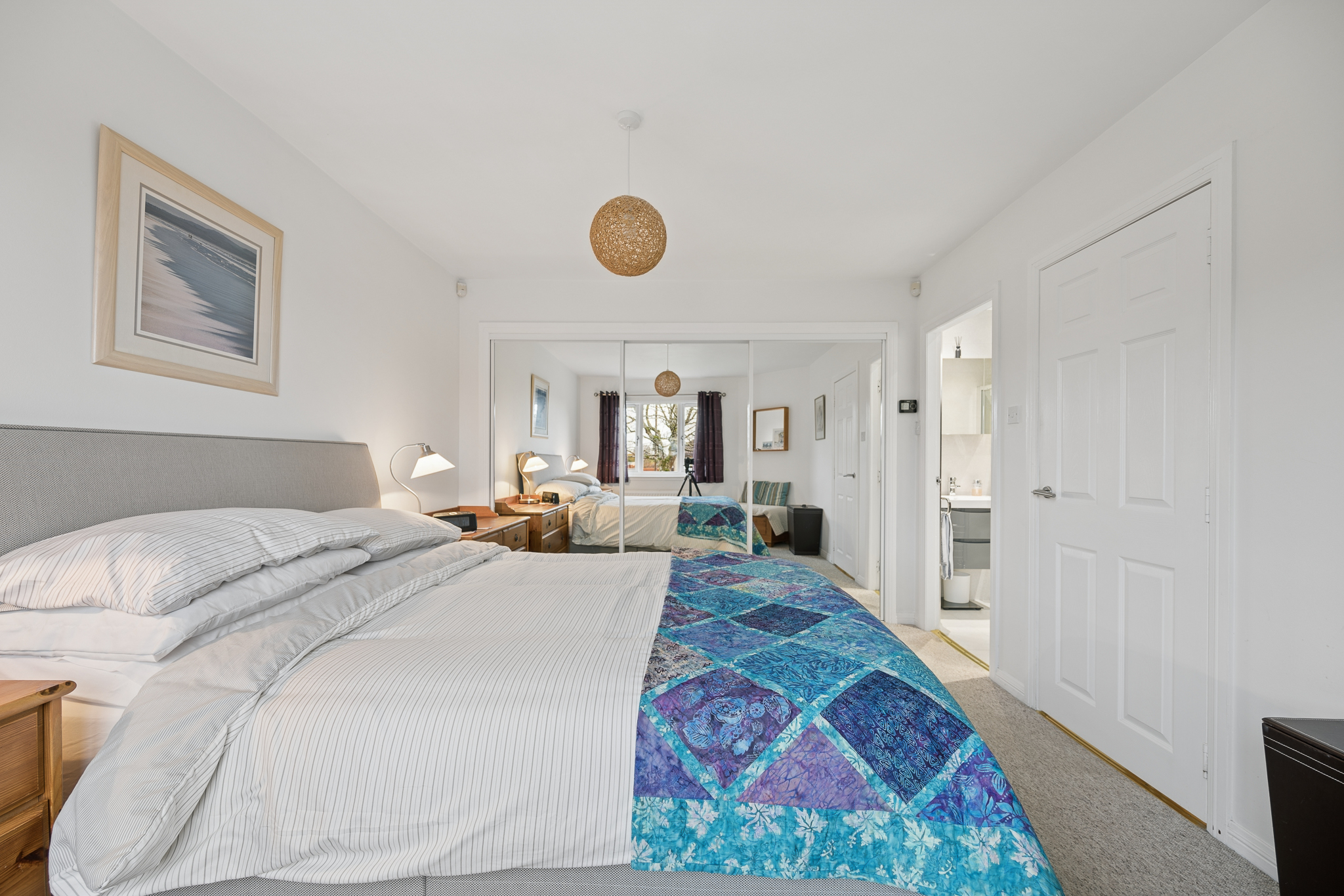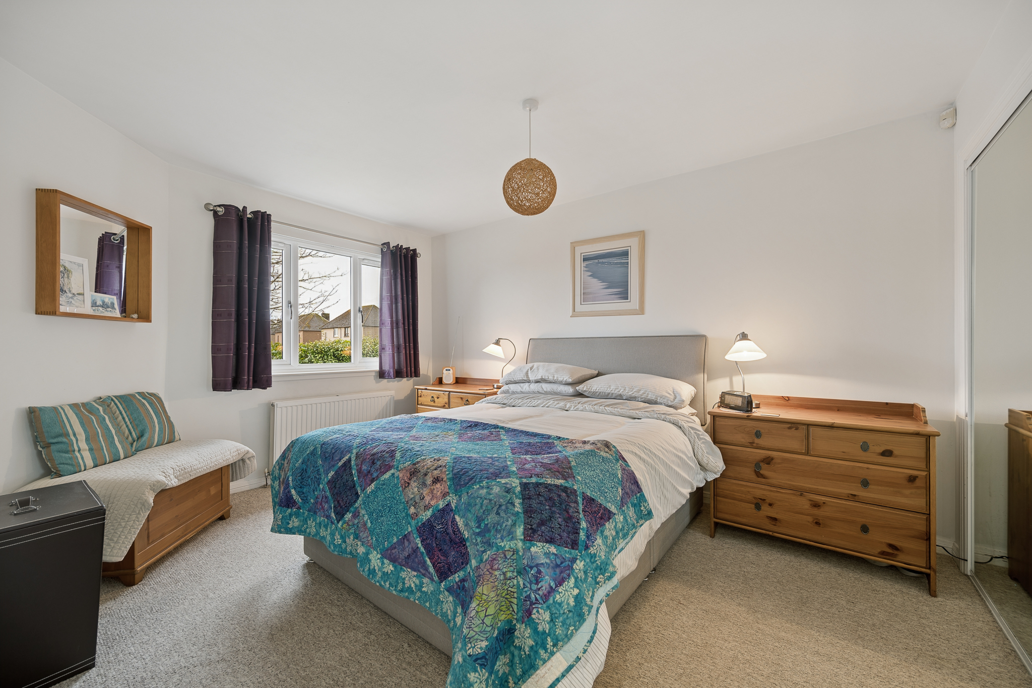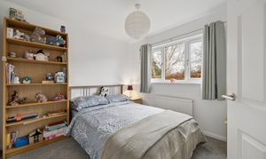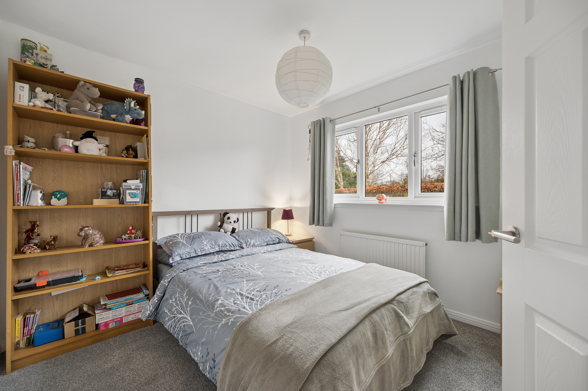 Directly across the hallway sits Bedroom Three, another generously sized bedroom that comfortably accommodates a double bed and furnishings. Currently styled with decorative shelving and personal touches, the room still offers a versatile blank canvas for a new owner to tailor to their own tastes. Again, the inclusion of built in storage ensures practicality without sacrificing valuable floor space.