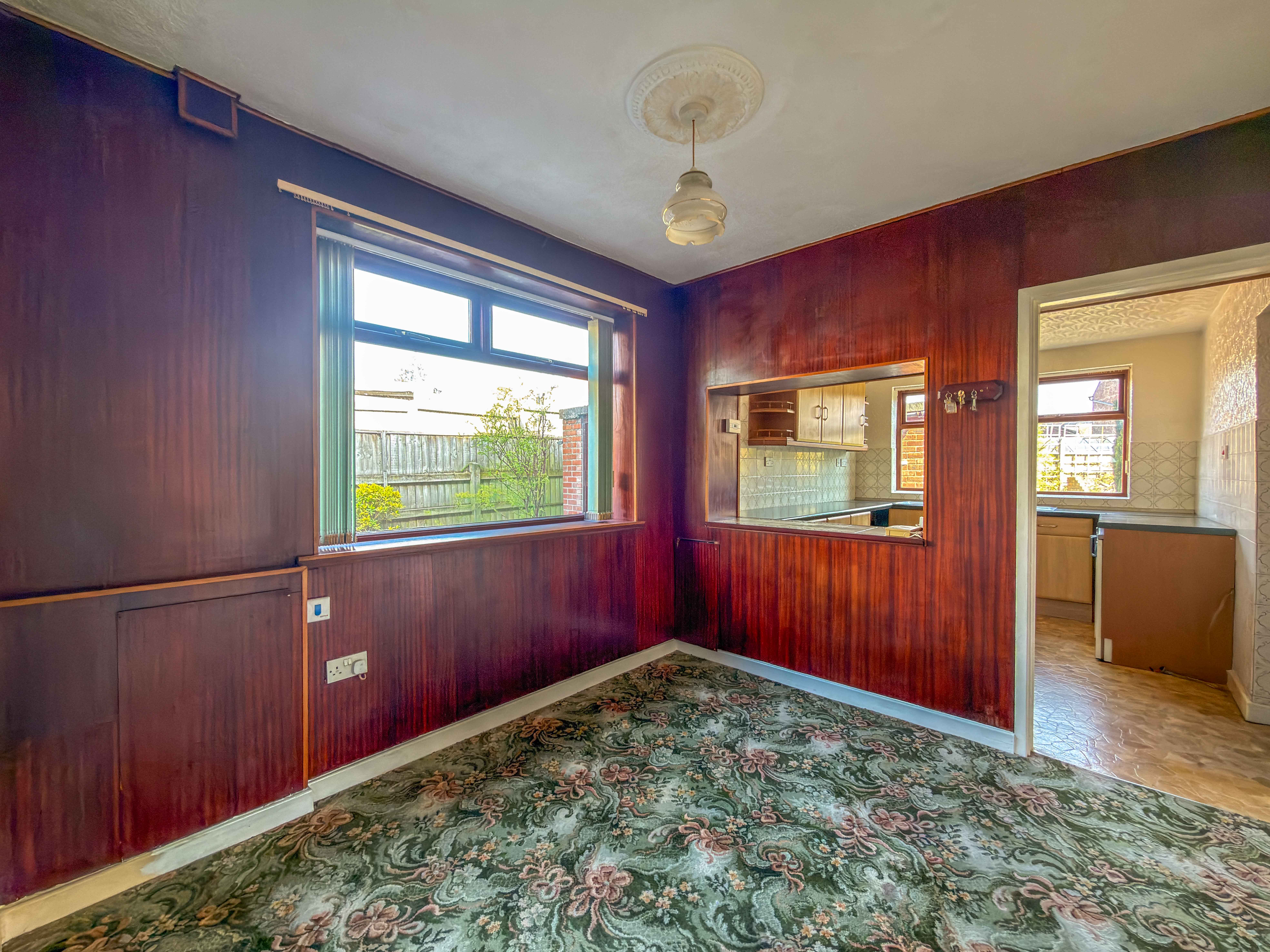 The accommodation is entered via a welcoming entrance hallway, with access to a useful cloakroom/store. A spacious dual-aspect living room enjoys a bay window to the front elevation and patio doors opening onto the rear garden, allowing for an abundance of natural light. An archway leads through to a separate dining room, which in turn provides access to the kitchen, fitted with a range of units and offering direct access to the gardens.