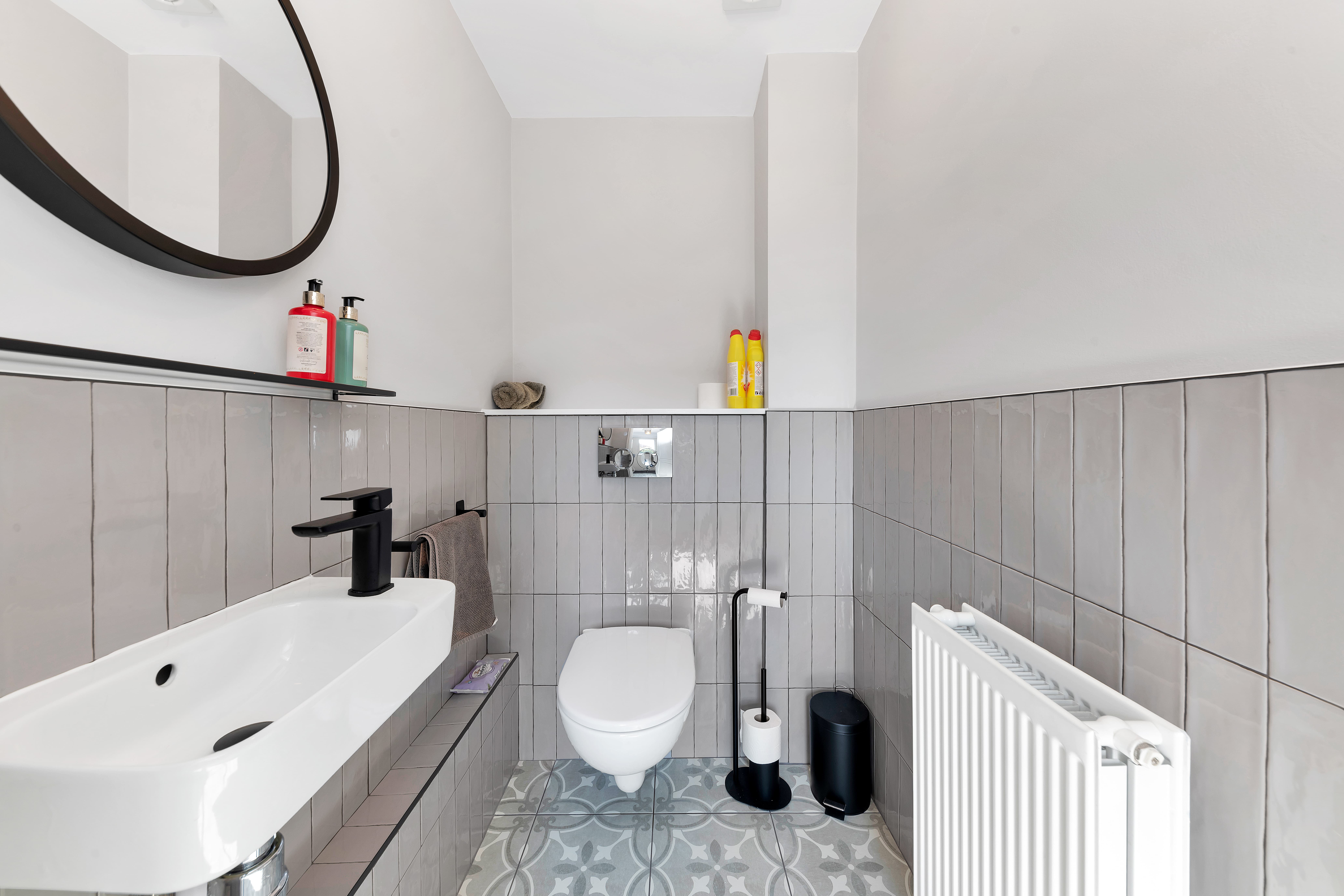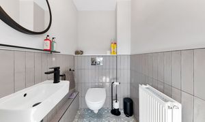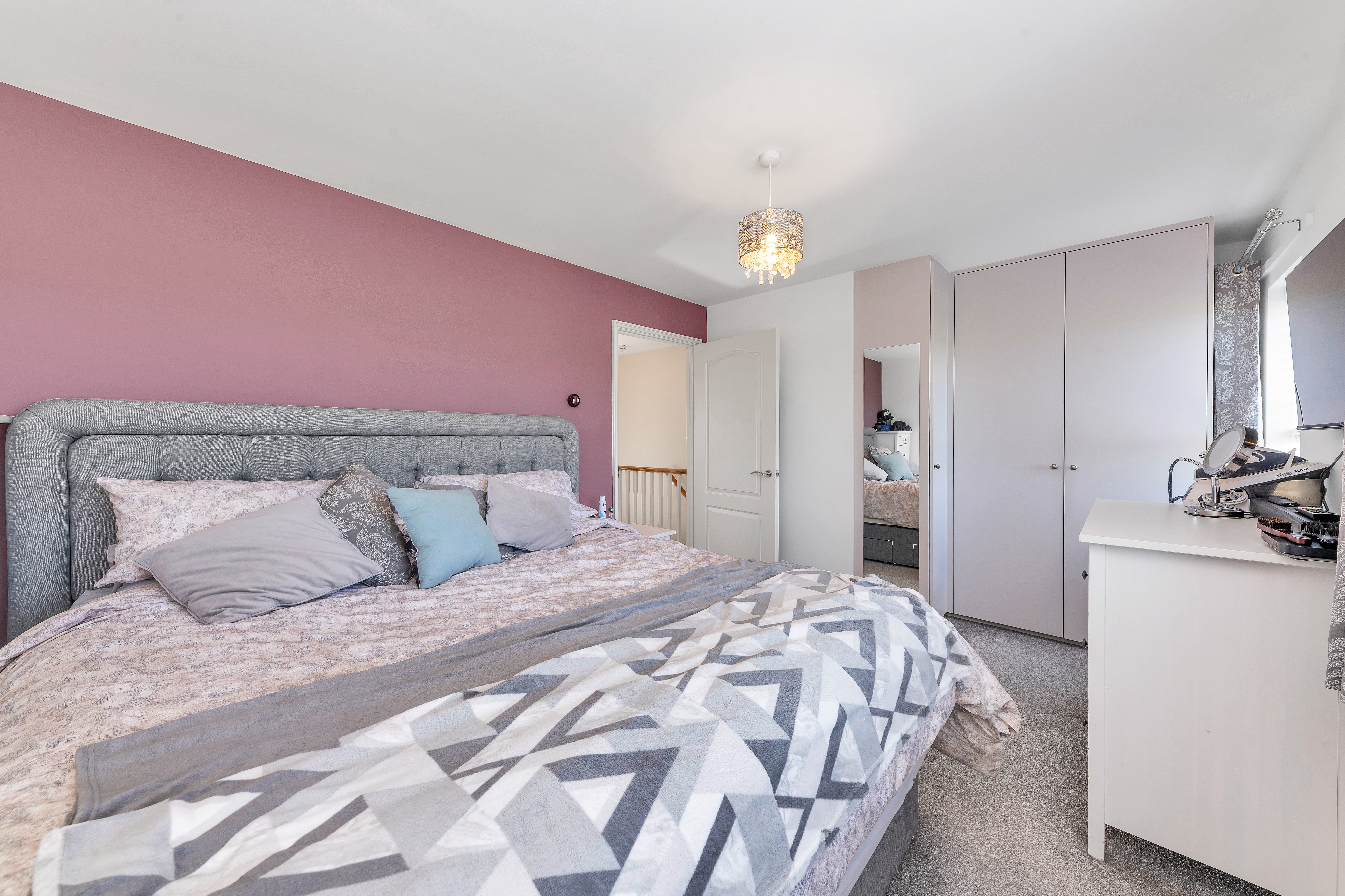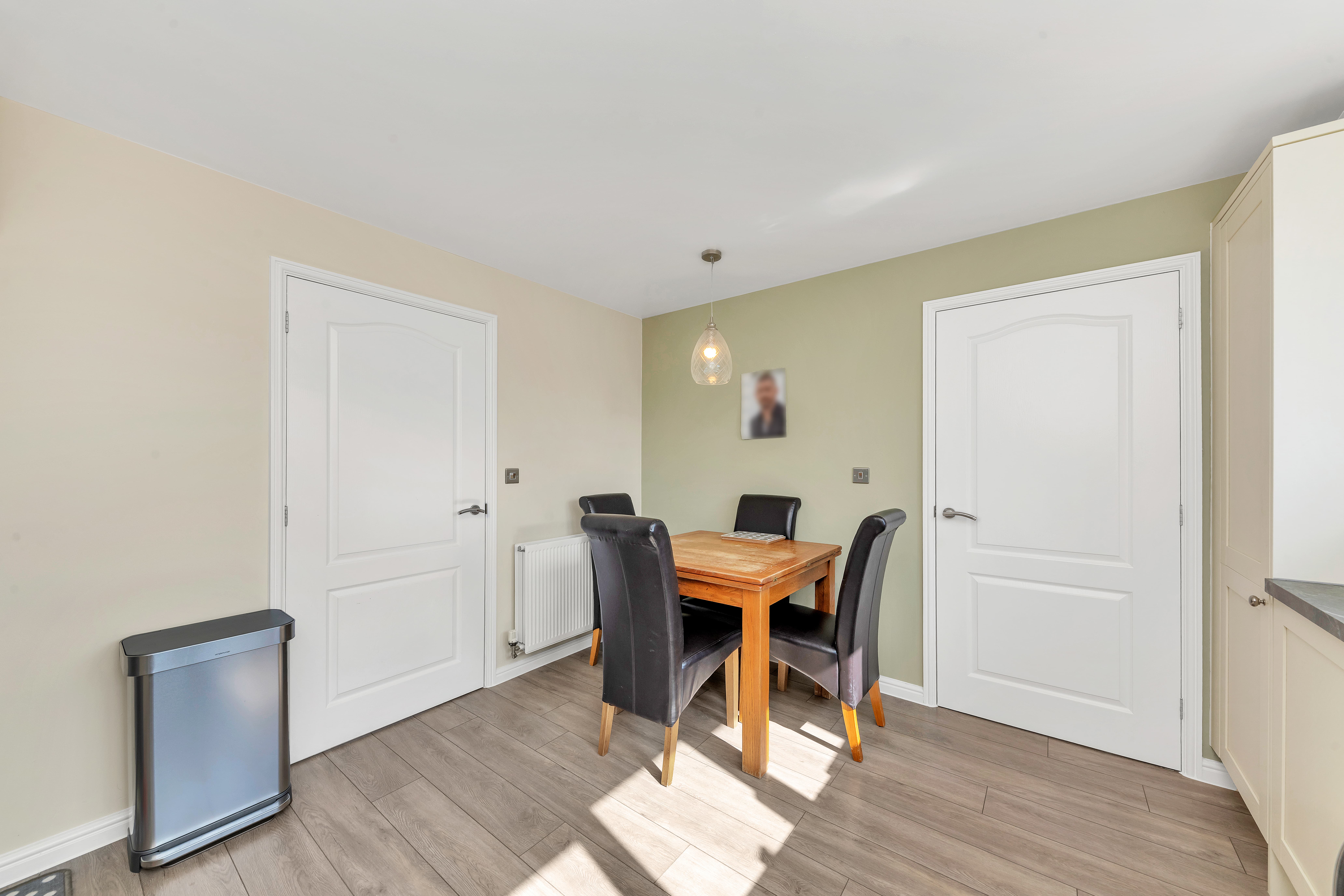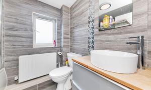 This modern property enjoys an attractive and nicely maintained frontage, with front borders of decorative stones and space for pots. Upon stepping inside, the entrance hallway is bright and welcoming, with pendant lighting, room for furniture, stairs to the first floor, and doors through to the downstairs living space, including a cloakroom WC.