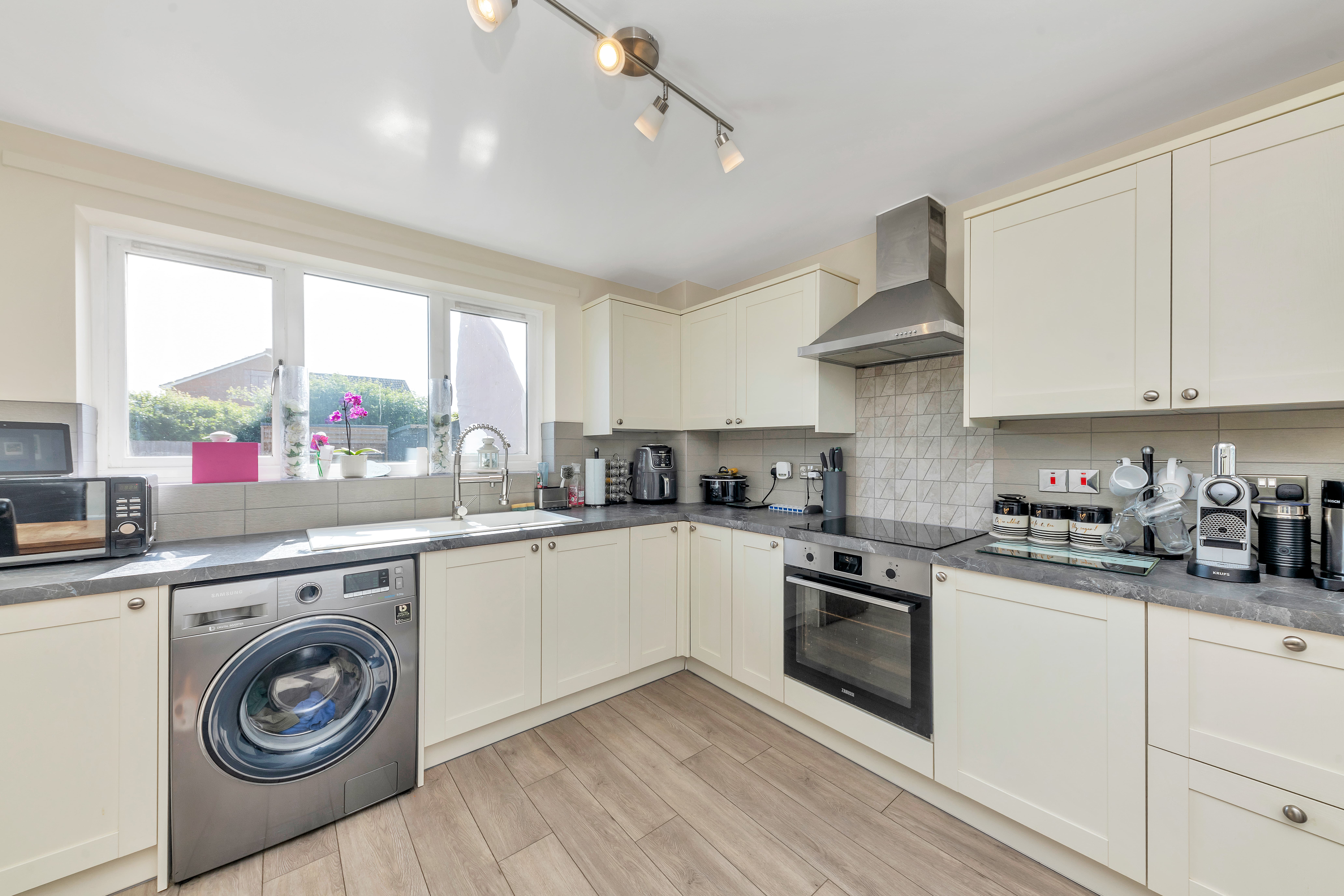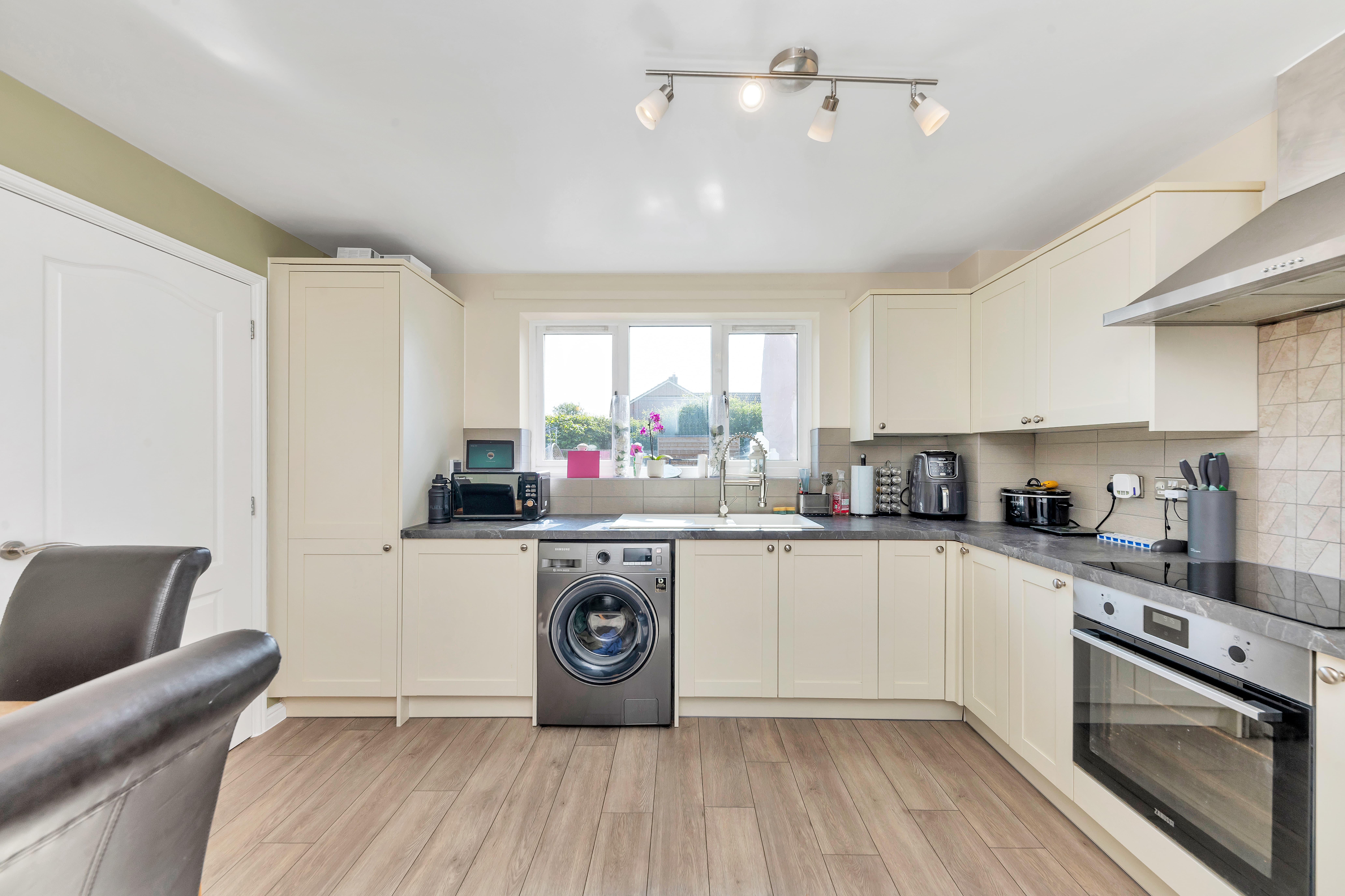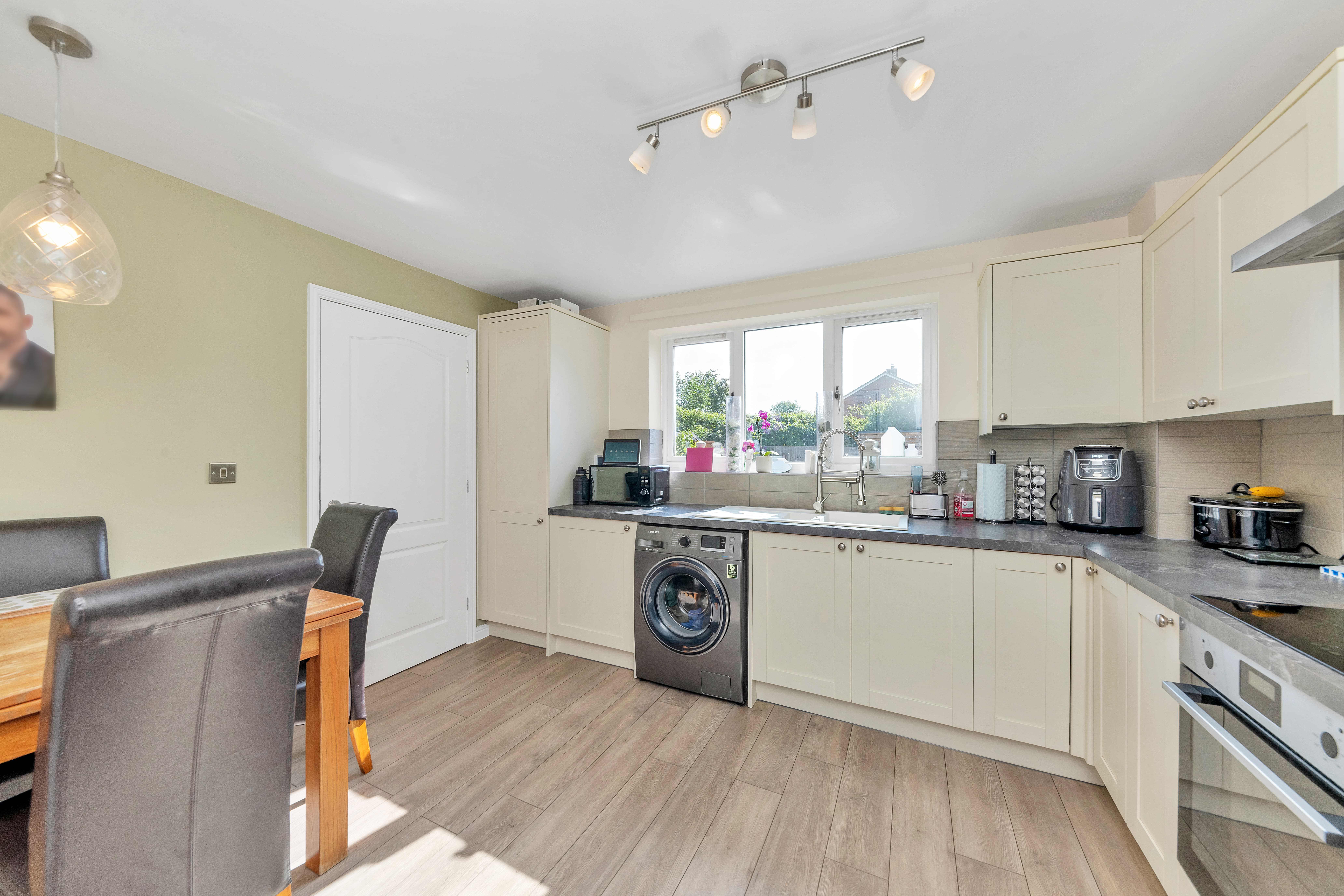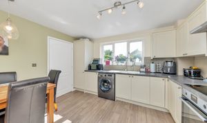 The new kitchen/dining room is wonderfully open-plan and enjoys a window and door to a garden aspect, a range of modern base and wall units, laminate worktops, wood flooring, pendant and spot lighting, an integrated oven, hob and extractor hood, and space for a washing machine, fridge/freezer, dining setting and other small kitchen appliances.