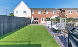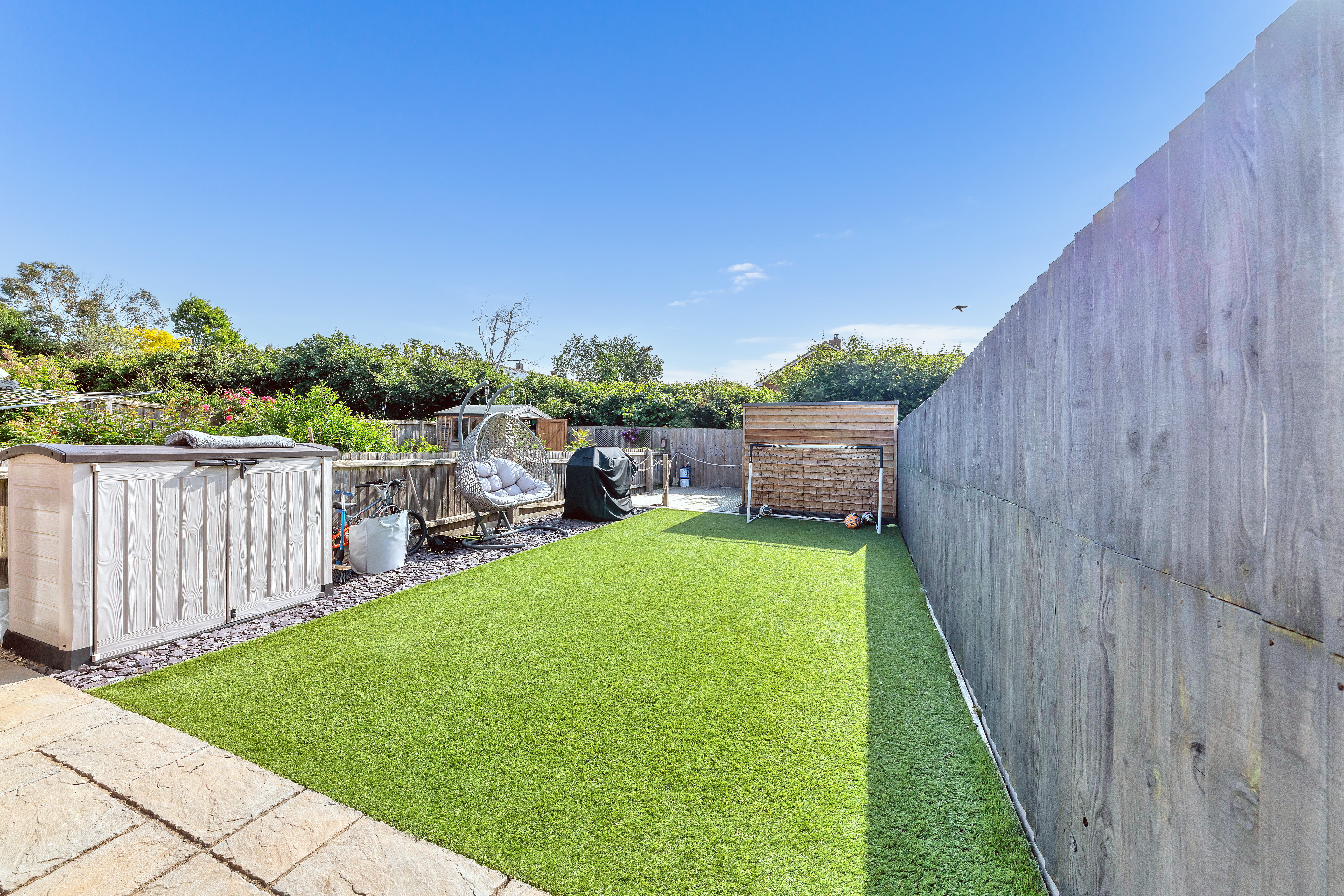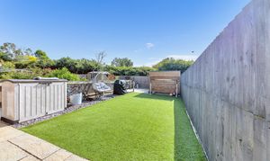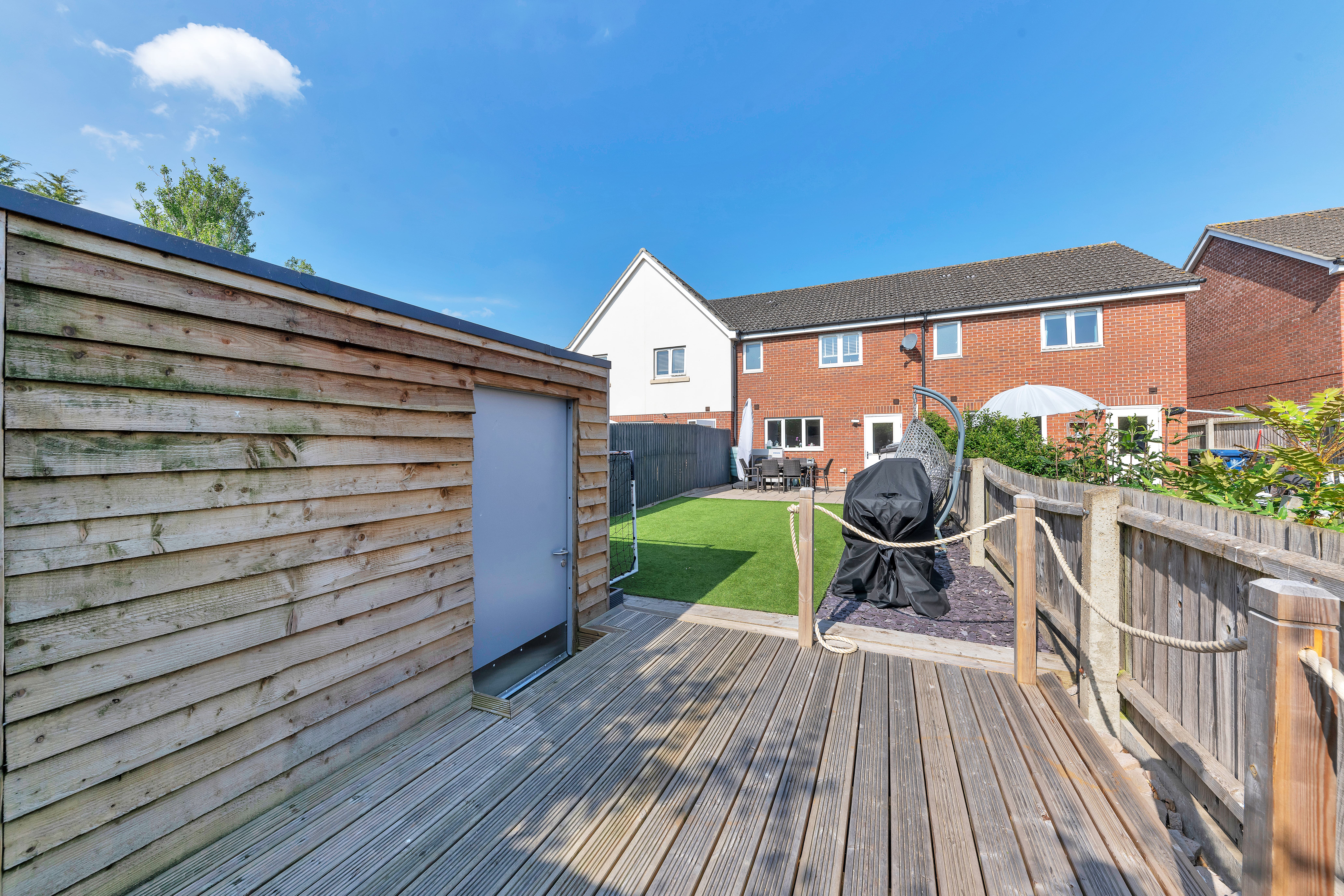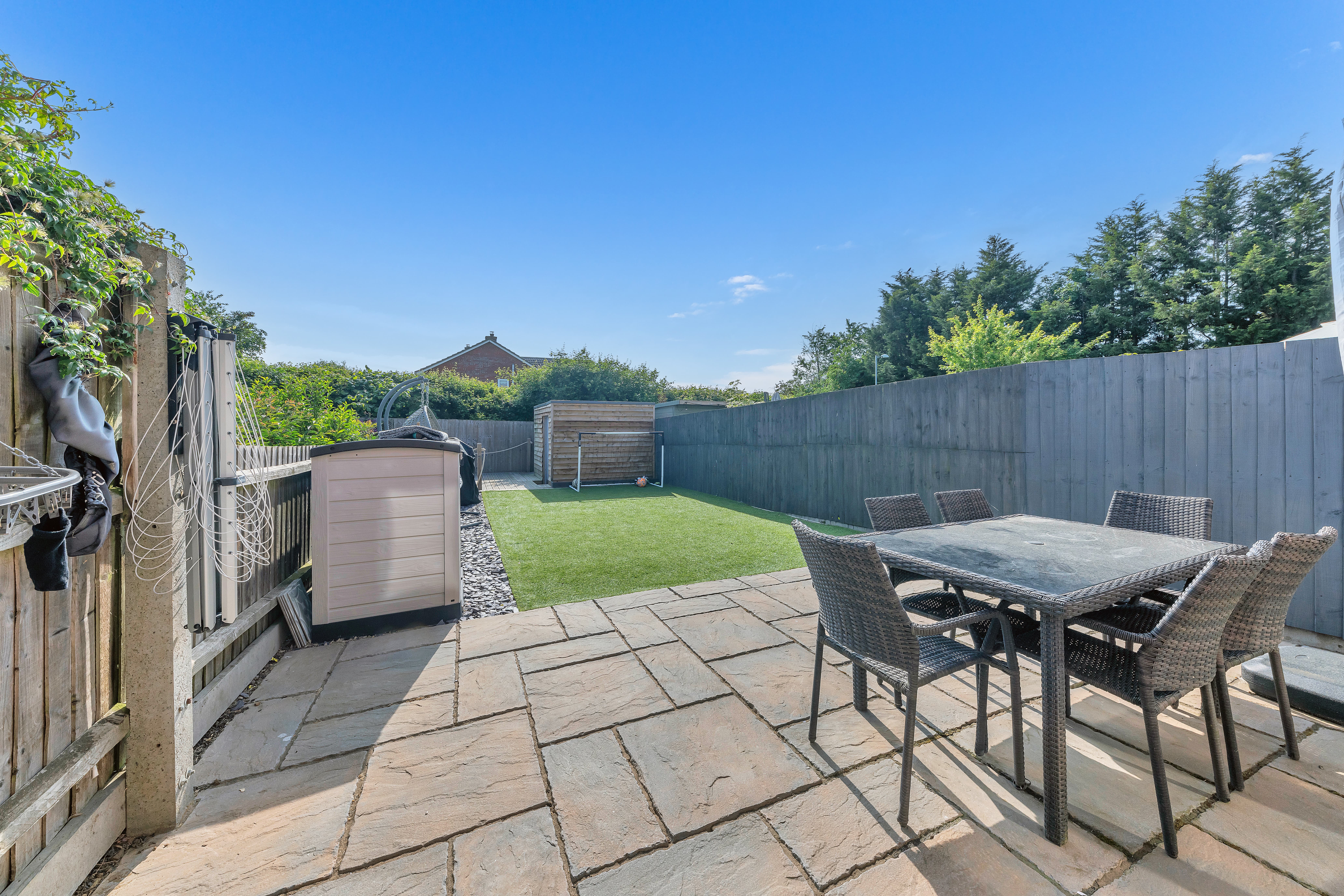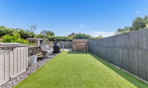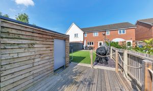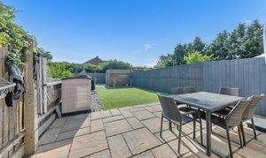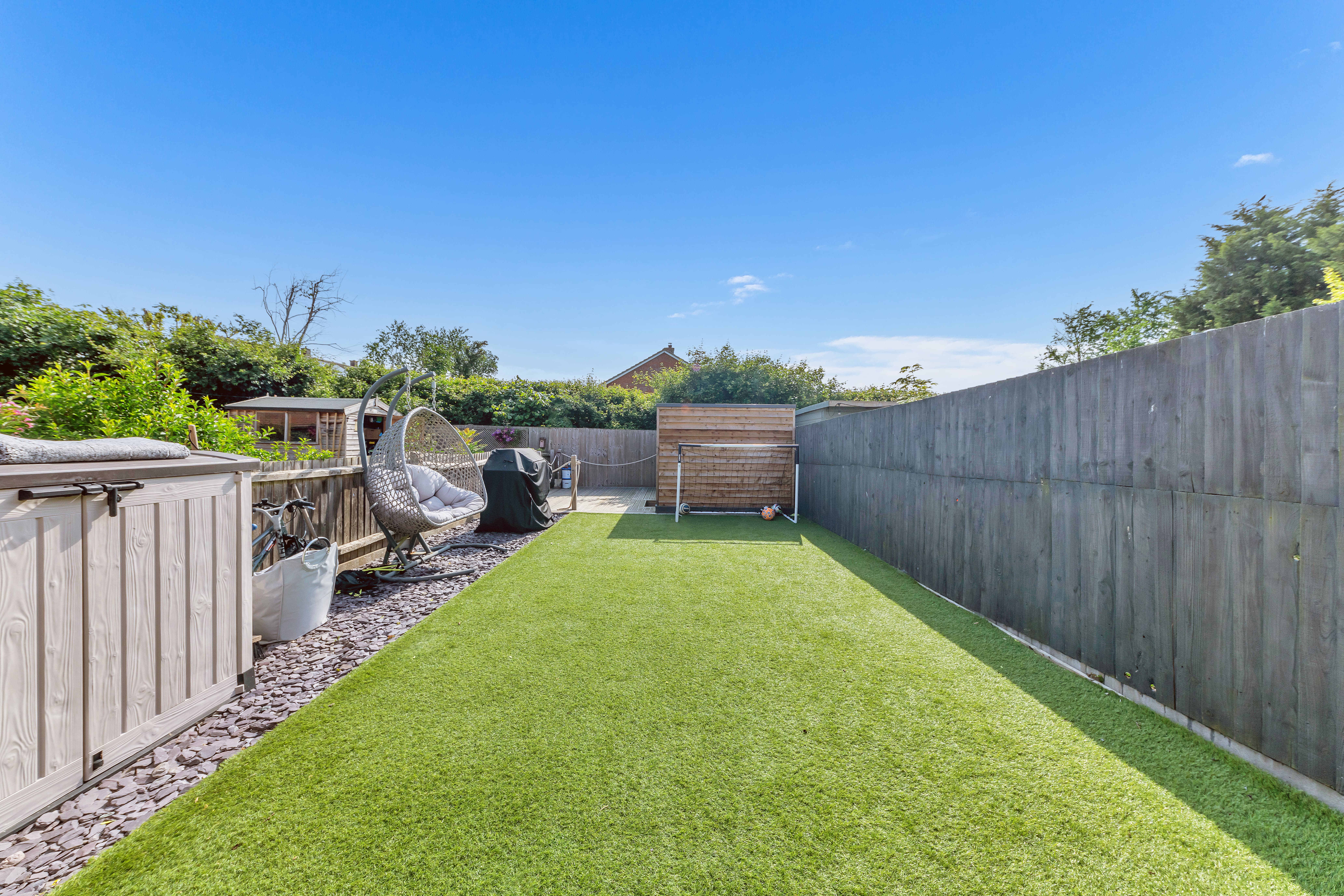 Outside, to the rear, the landscaped garden is a very good size, fully enclosed by fencing and brick walls and offering a lovely space to sit and relax during the warmer weather. It is laid mainly to artificial lawn with decorative slate and paved patio areas providing lots of space for garden furniture, enjoying family meals al fresco and entertaining guests. There is a further decking area to the bottom of the garden, providing access to a large shed, as well as plenty of scope for new owners to put their own stamp on things.