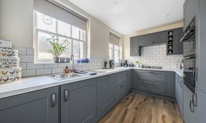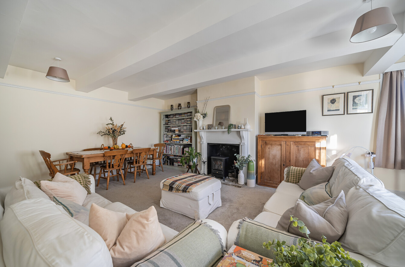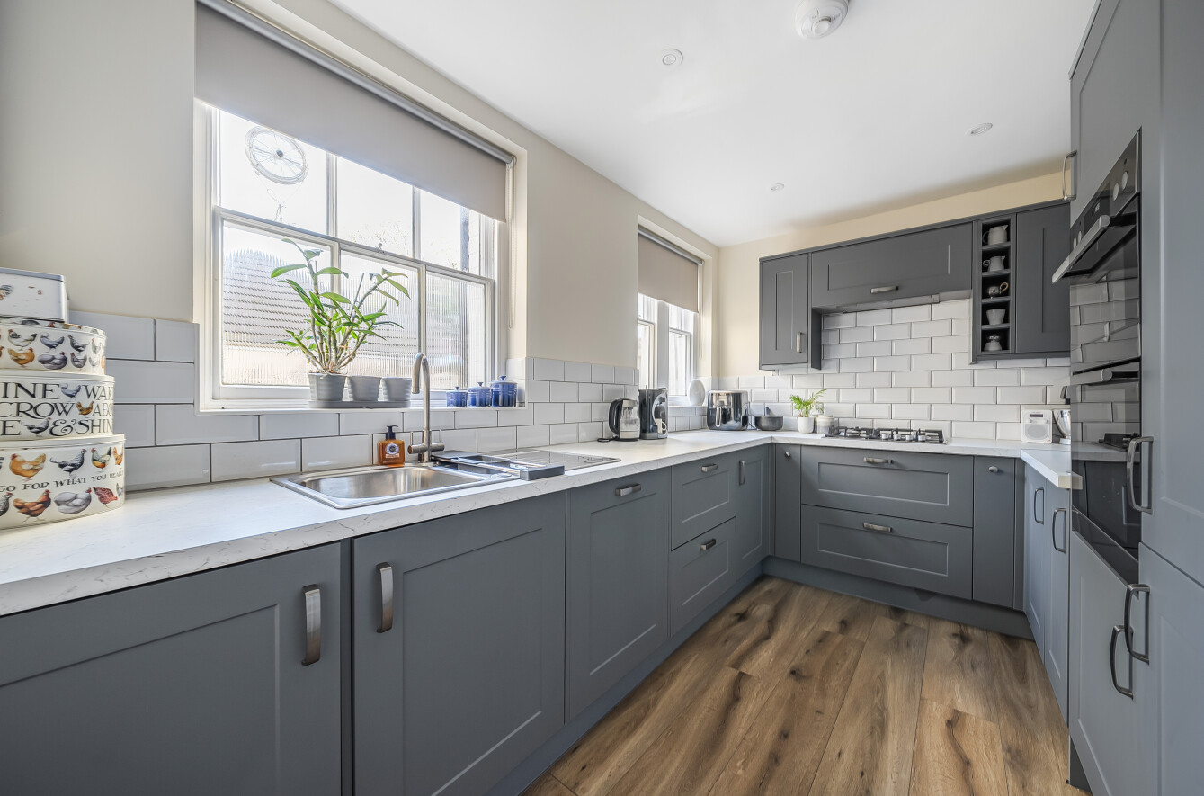 The spacious sitting/dining room is a highlight, featuring a large bay window that provides views over The Common and a feature fireplace that adds character. The modern, shaker-style kitchen is located at the rear and is equipped with integrated appliances, including an electric double oven, gas hob, fridge/freezer, and dishwasher, making it a practical space with large windows making it lovely and light.