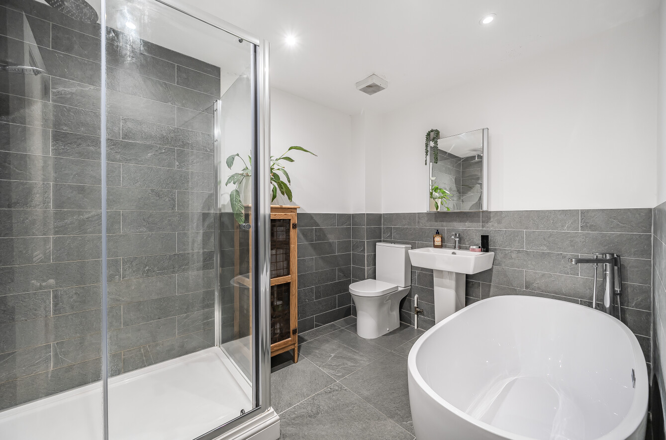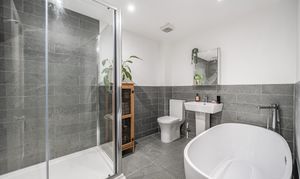 - Stylish, modern bathroom with freestanding bath and walk-in shower