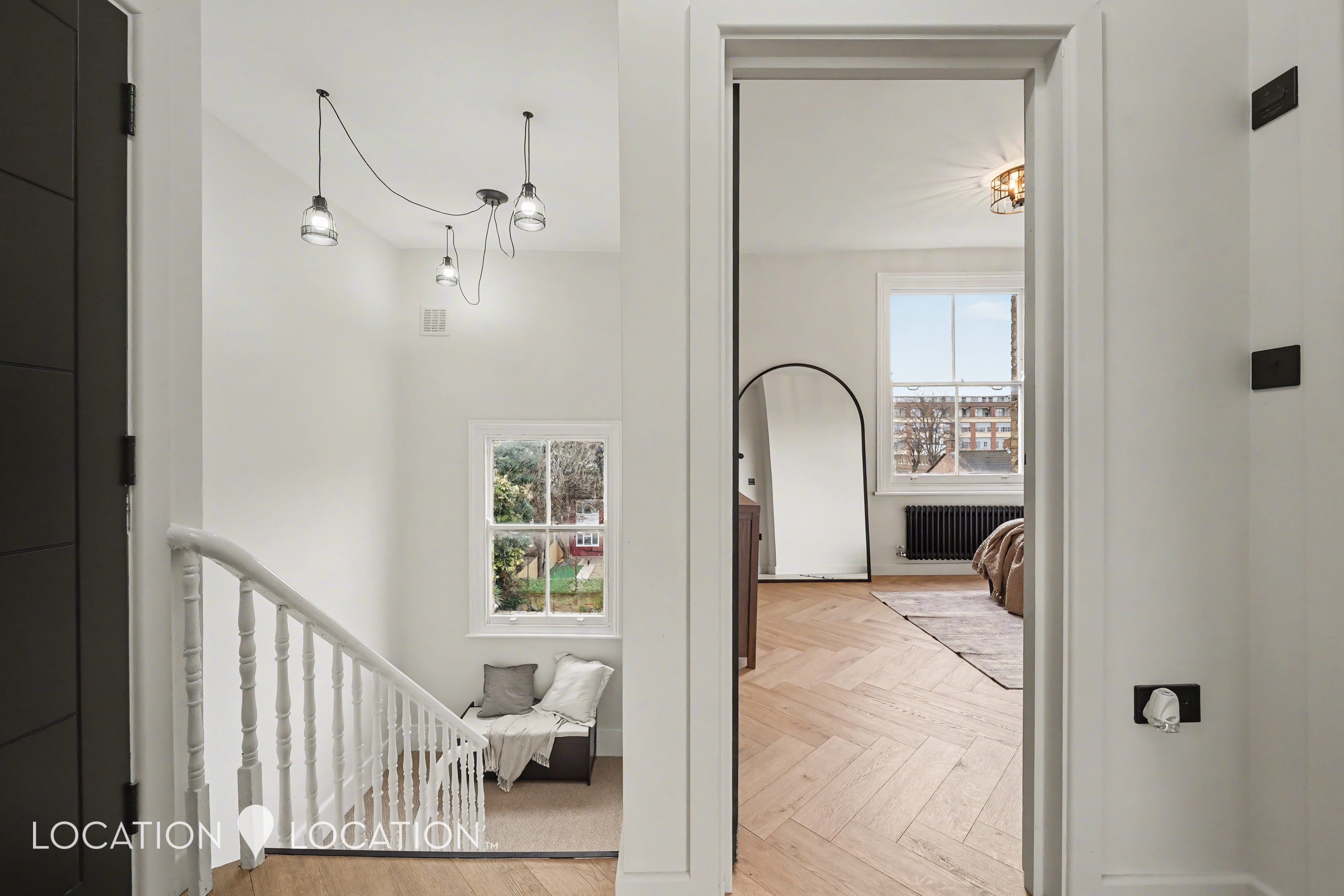 The owner has thoughtfully redesigned the space to create a sleek open-plan living kitchen that feels both contemporary and inviting, perfect for entertaining or unwinding at home. Parquet flooring runs underfoot, complemented by elegant sash windows that flood the space with natural light, while striking black radiators adds a subtle designer edge.