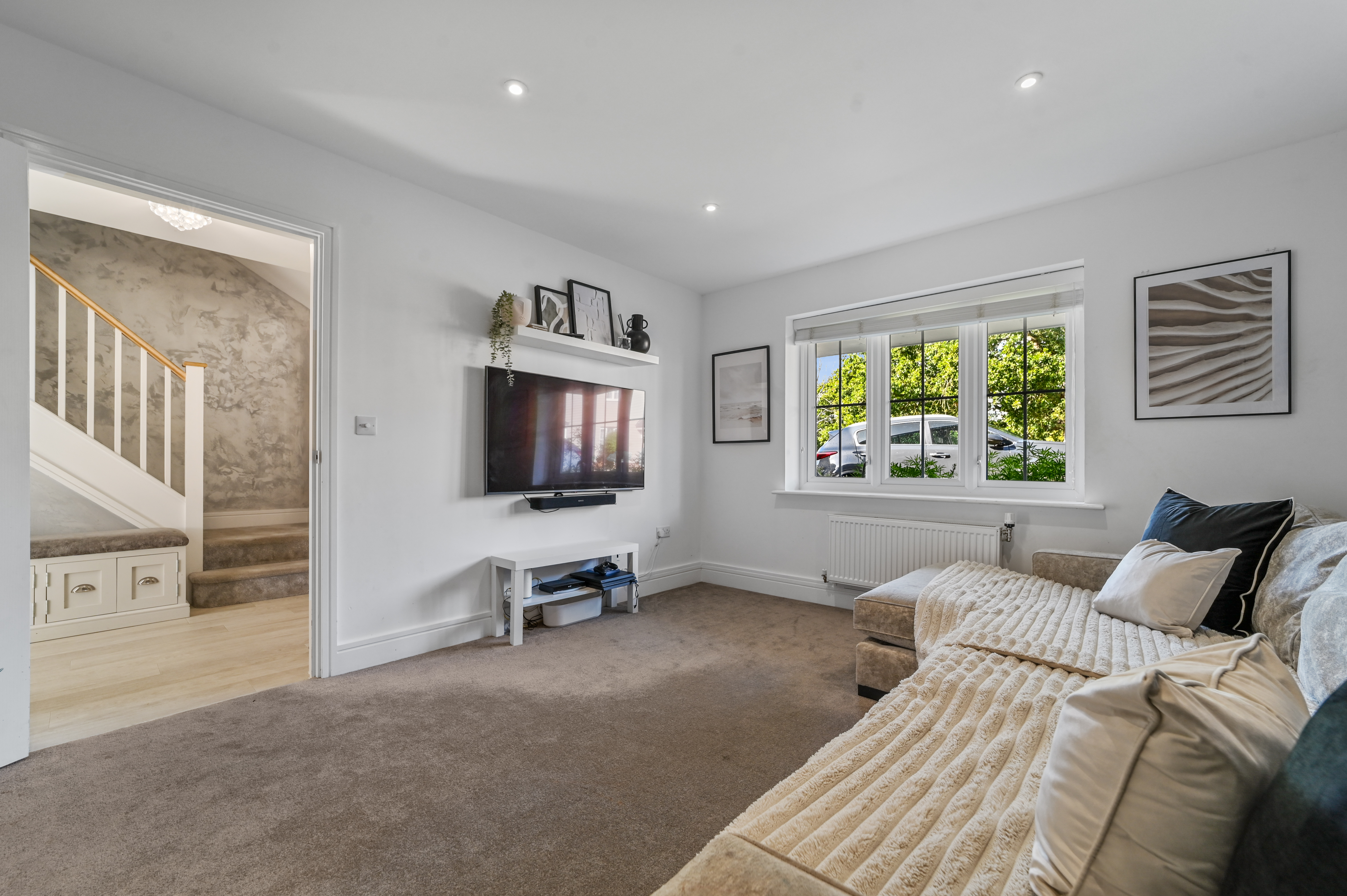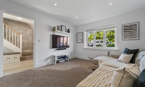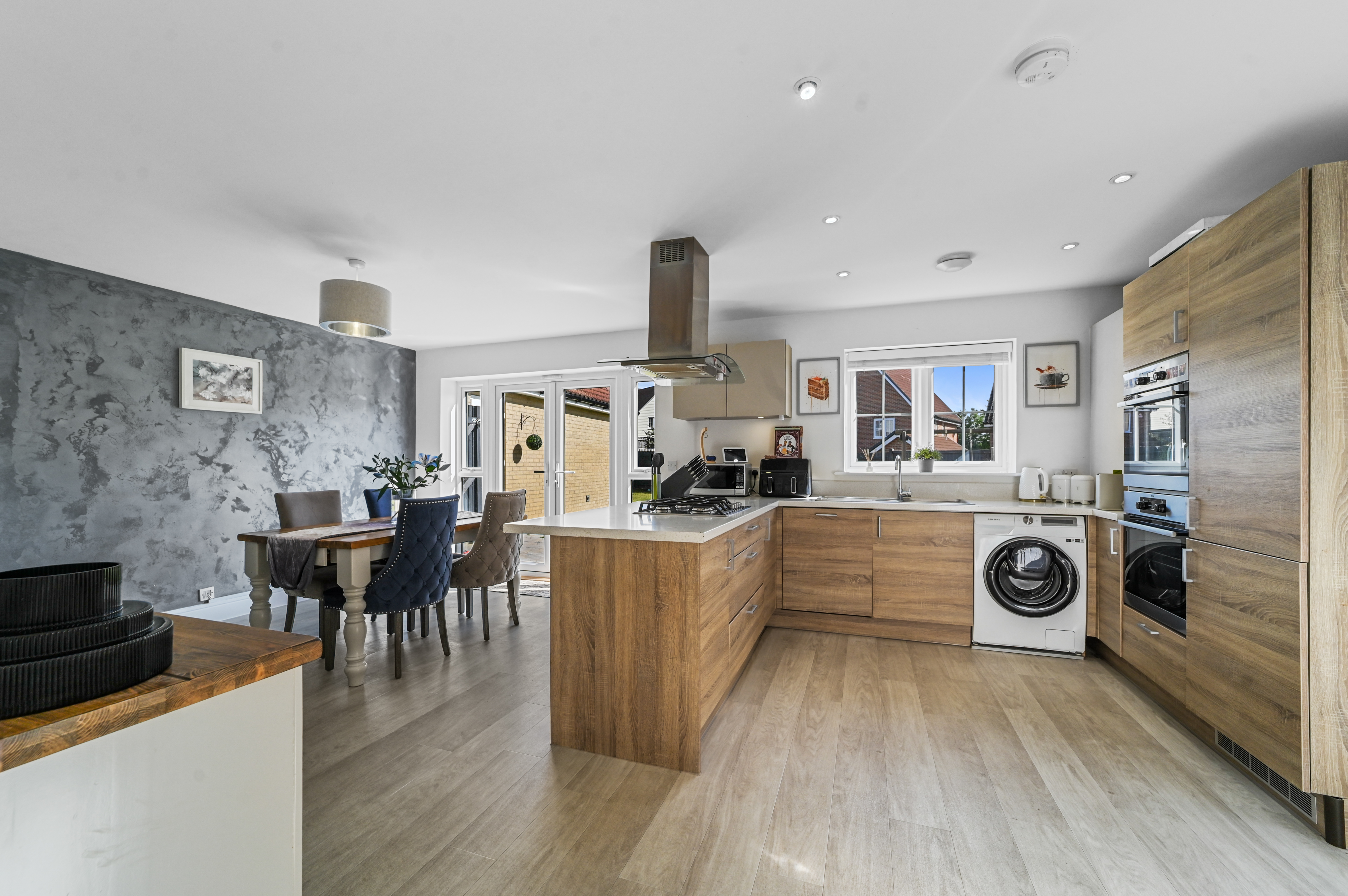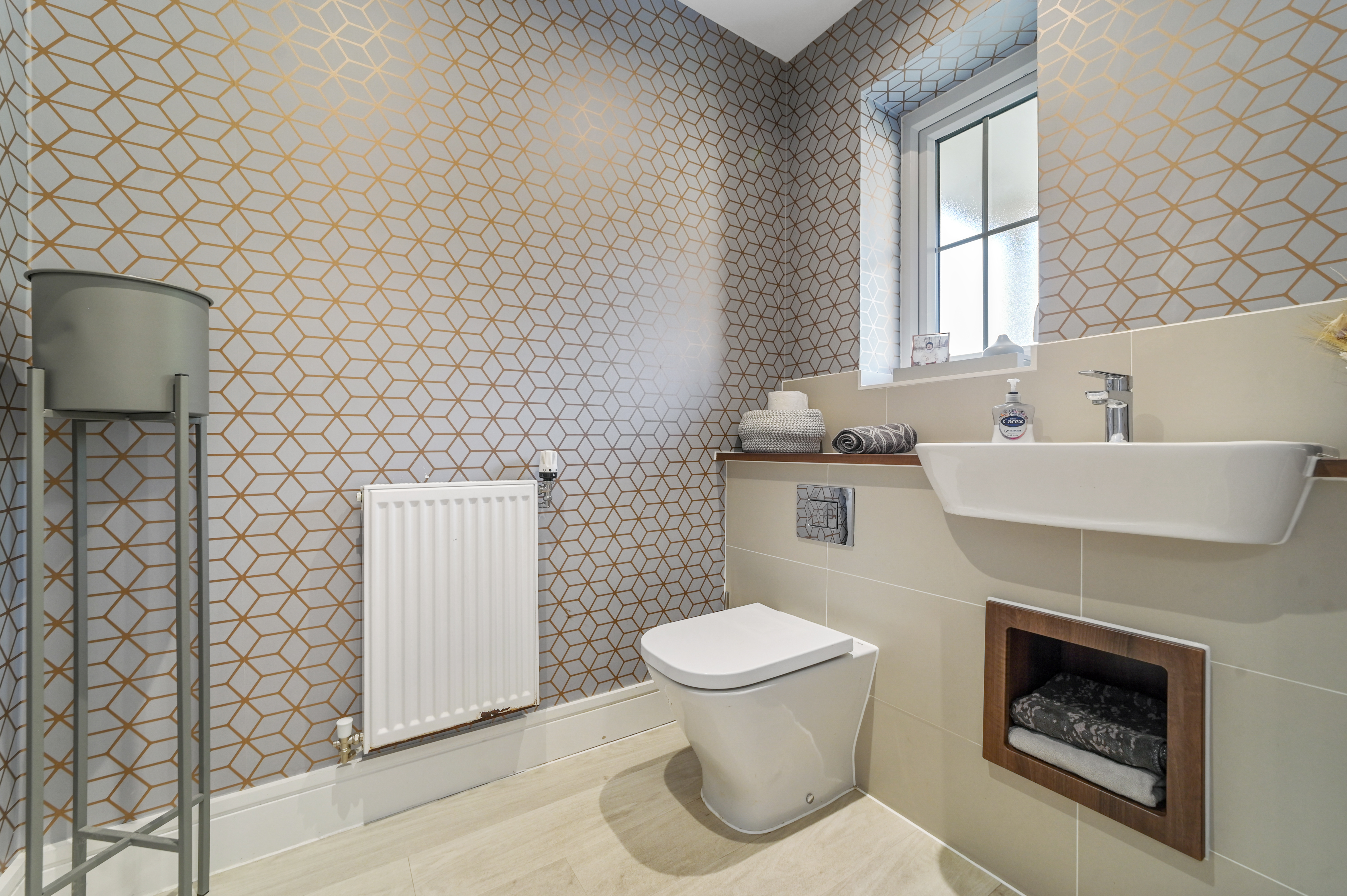 The main front door provides access to the spacious entrance hall featuring Amtico flooring and stairs leading to the first-floor landing. On entry, there is a useful cloakroom with low level WC and wash hand basin. Opposite is the stylishly decorated reception room providing delightful views of the green open space and woodlands to the front of the property. To rear aspect there is an impressive open plan kitchen/dining room-very much the hub of the house, offering a comprehensive range of base and eye level units, worksurfaces, stainless steel sink with mixer tap and drainer, built-in double electric oven, gas hob with overhead suspended extractor hood, breakfast bar, integrated dishwasher, integral fridge/freezer, space and plumbing for washing machine, large storage cupboard, continuation of Amtico flooring, as well as patio doors opening on to the garden.