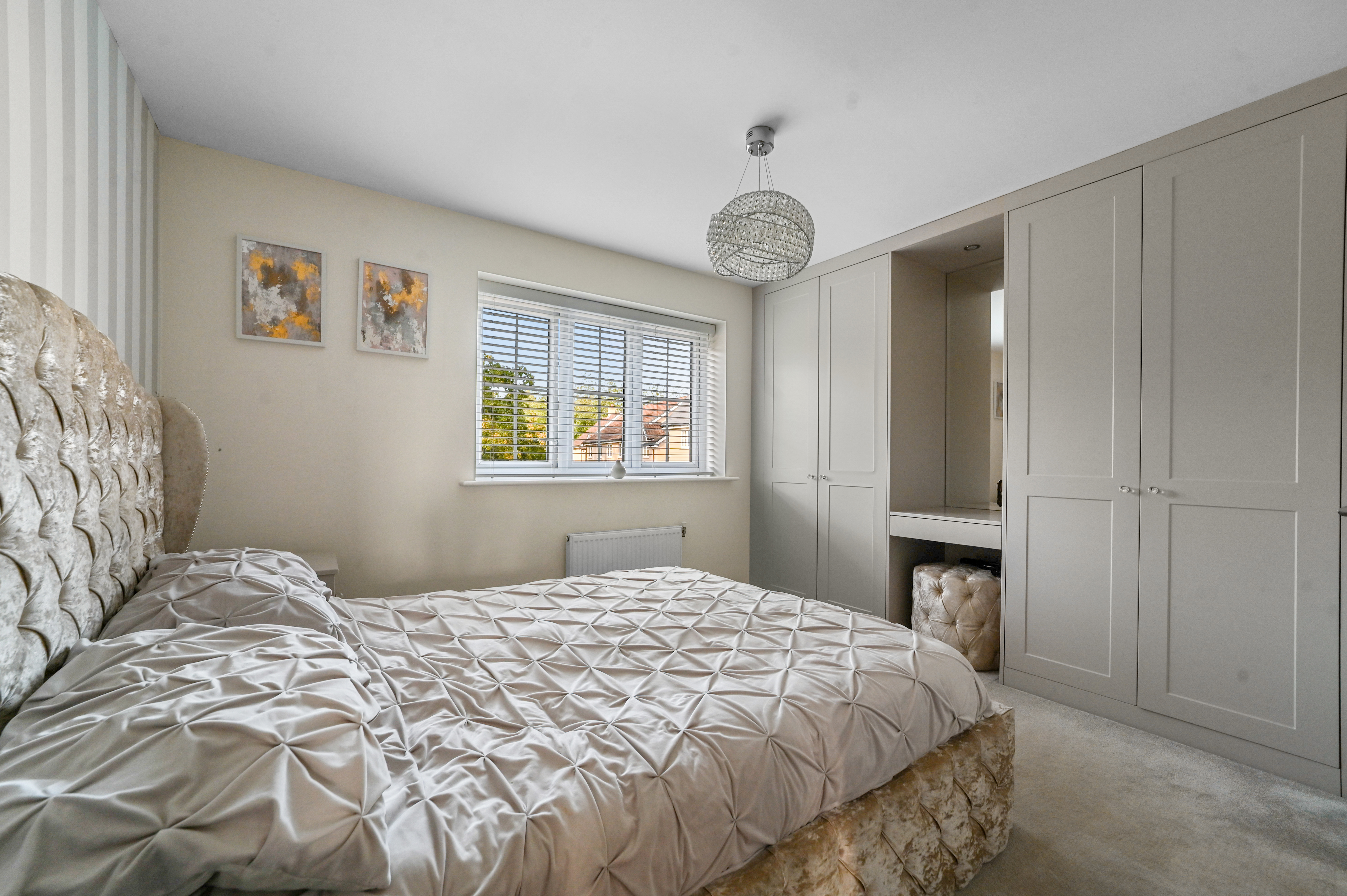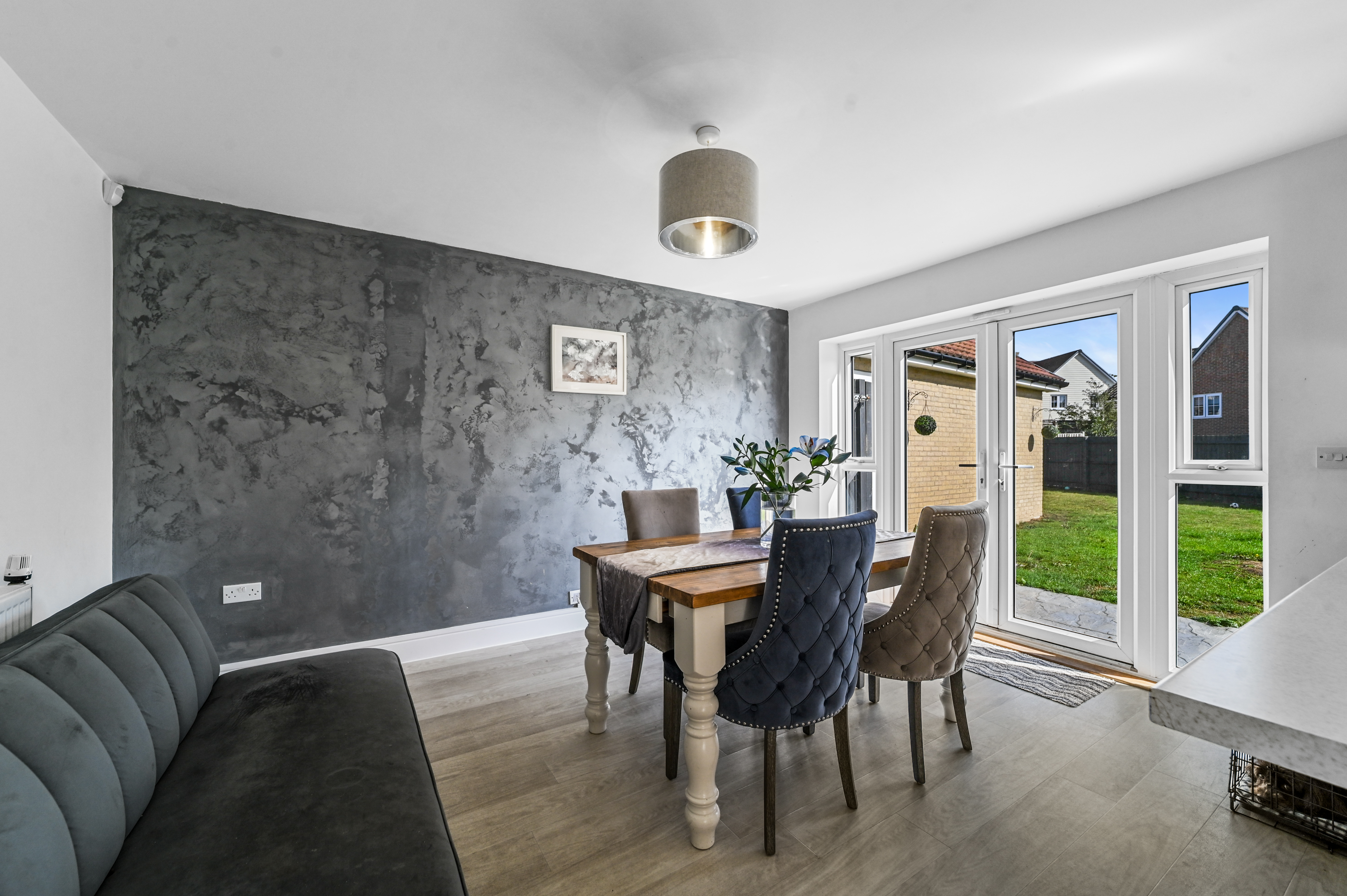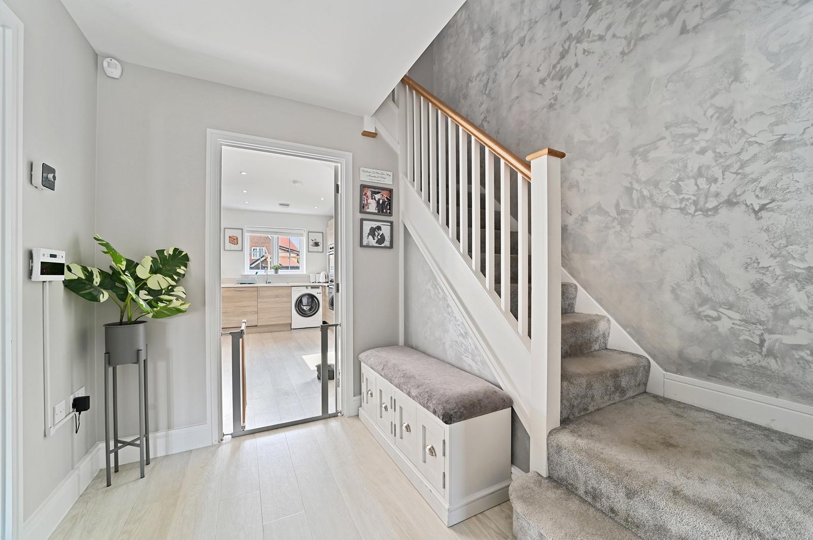 The main front door provides access to the spacious entrance hall featuring Amtico flooring and stairs leading to the first-floor landing. On entry, there is a useful cloakroom with low level WC and wash hand basin. Opposite is the stylishly decorated reception room providing delightful views of the green open space and woodlands to the front of the property. To rear aspect there is an impressive open plan kitchen/dining room-very much the hub of the house, offering a comprehensive range of base and eye level units, worksurfaces, stainless steel sink with mixer tap and drainer, built-in double electric oven, gas hob with overhead suspended extractor hood, breakfast bar, integrated dishwasher, integral fridge/freezer, space and plumbing for washing machine, large storage cupboard, continuation of Amtico flooring, as well as patio doors opening on to the garden.