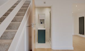 Inside, a generous entrance porch provides a practical and welcoming threshold - ideal for coats, shoes, and the everyday rhythms of family life. Beyond, the ground floor unfolds with an intuitive sense of flow, combining open-plan living with clearly defined spaces. A comfortable sitting room sits to the front of the house, enjoying a north-westerly aspect and the soft light of the evening sun. At the heart of the home, the kitchen and breakfast area takes centre stage: light-filled, social, and designed for both daily living and entertaining. This space transitions naturally into a dedicated dining area, where patio doors open directly onto the garden, blurring the line between indoors and out. A calm, neutral palette runs throughout, lending cohesion and a quiet elegance to the interiors. Every element has been carefully considered, balancing form with function. A discreet ground-floor shower room with walk-in enclosure and W.C. sits just off the main living space, adding a welcome layer of convenience.
