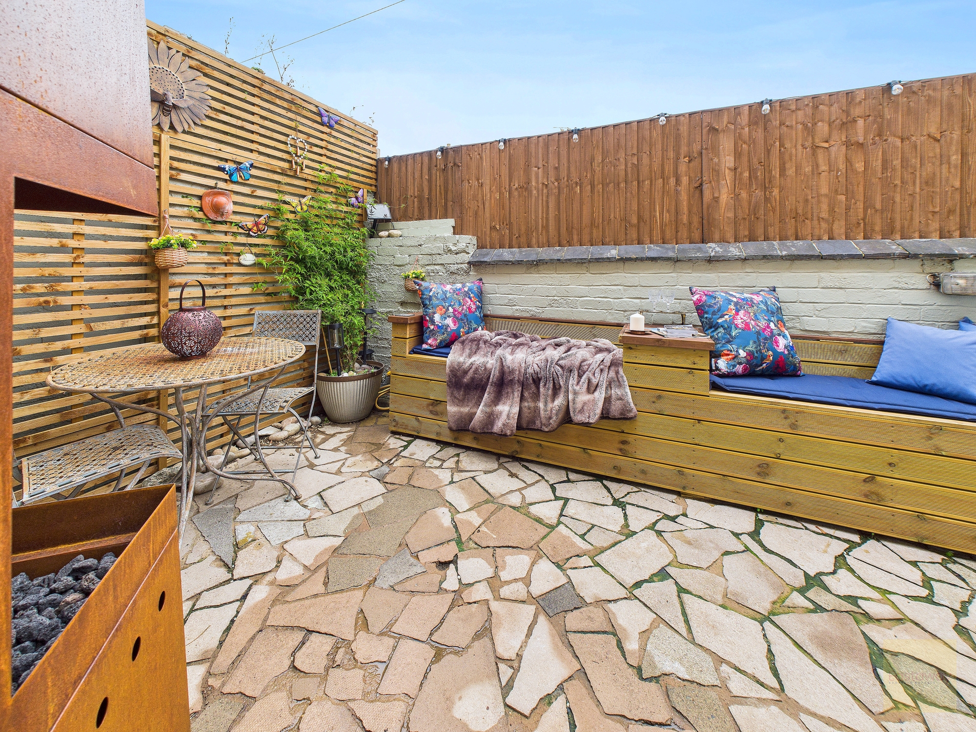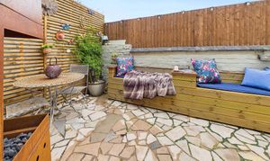 - Private, low-maintenance garden with built-in seating and a peaceful feel.