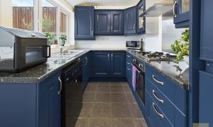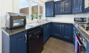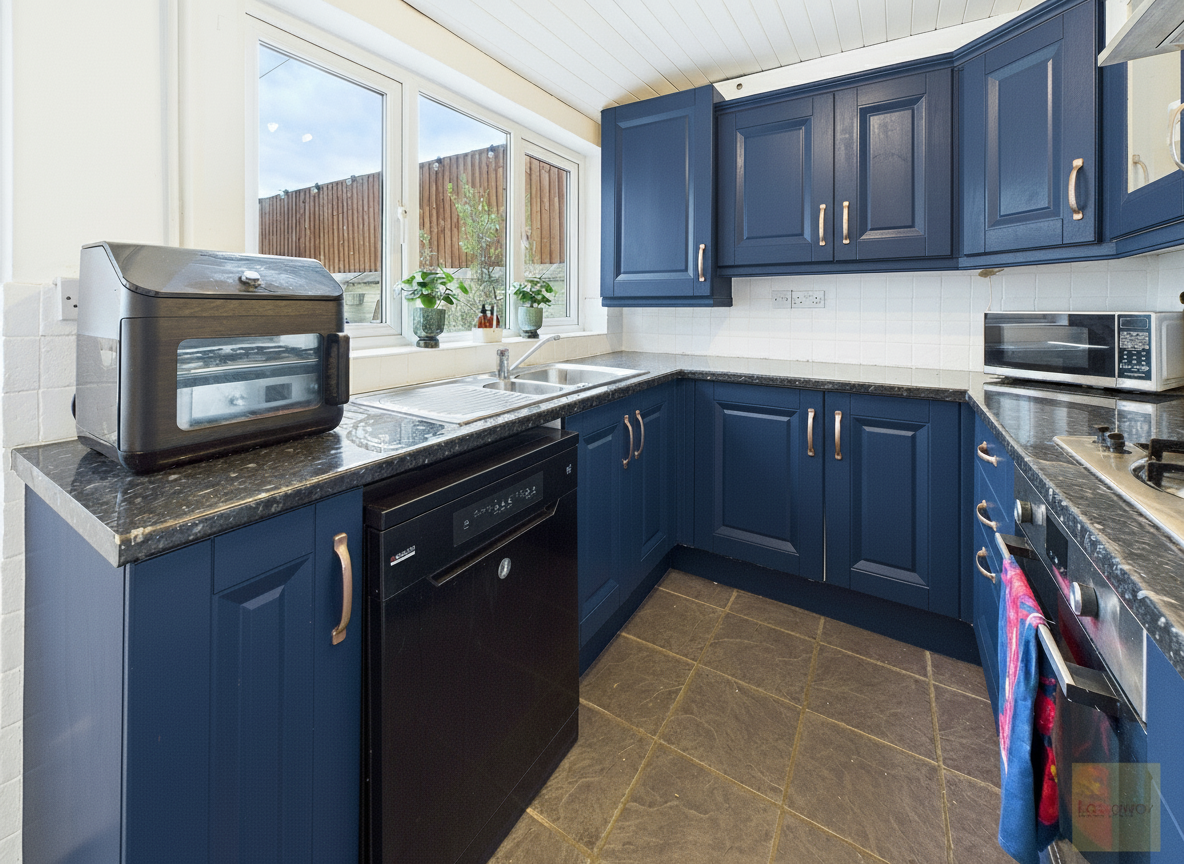 Note: The kitchen cabinets are currently white however, they are in the process of being painted in Rust-Oleum Kitchen Cupboard Matt Paint Evening Blue therefore, we have virtually staged the kitchen to show the cabinets in their new colour.