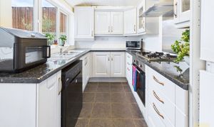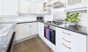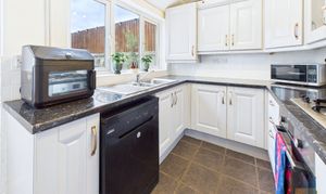 The kitchen is practical and well laid out, painted in soft tones and opening onto the garden. If you ever wanted more space, there’s the option to reconfigure and even move the kitchen into the adjoining garage, which would allow for an extra ground-floor room or larger kitchen-diner, subject to the relevant planning permissions.